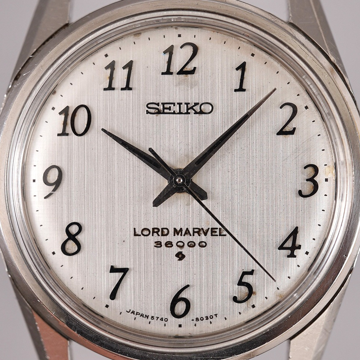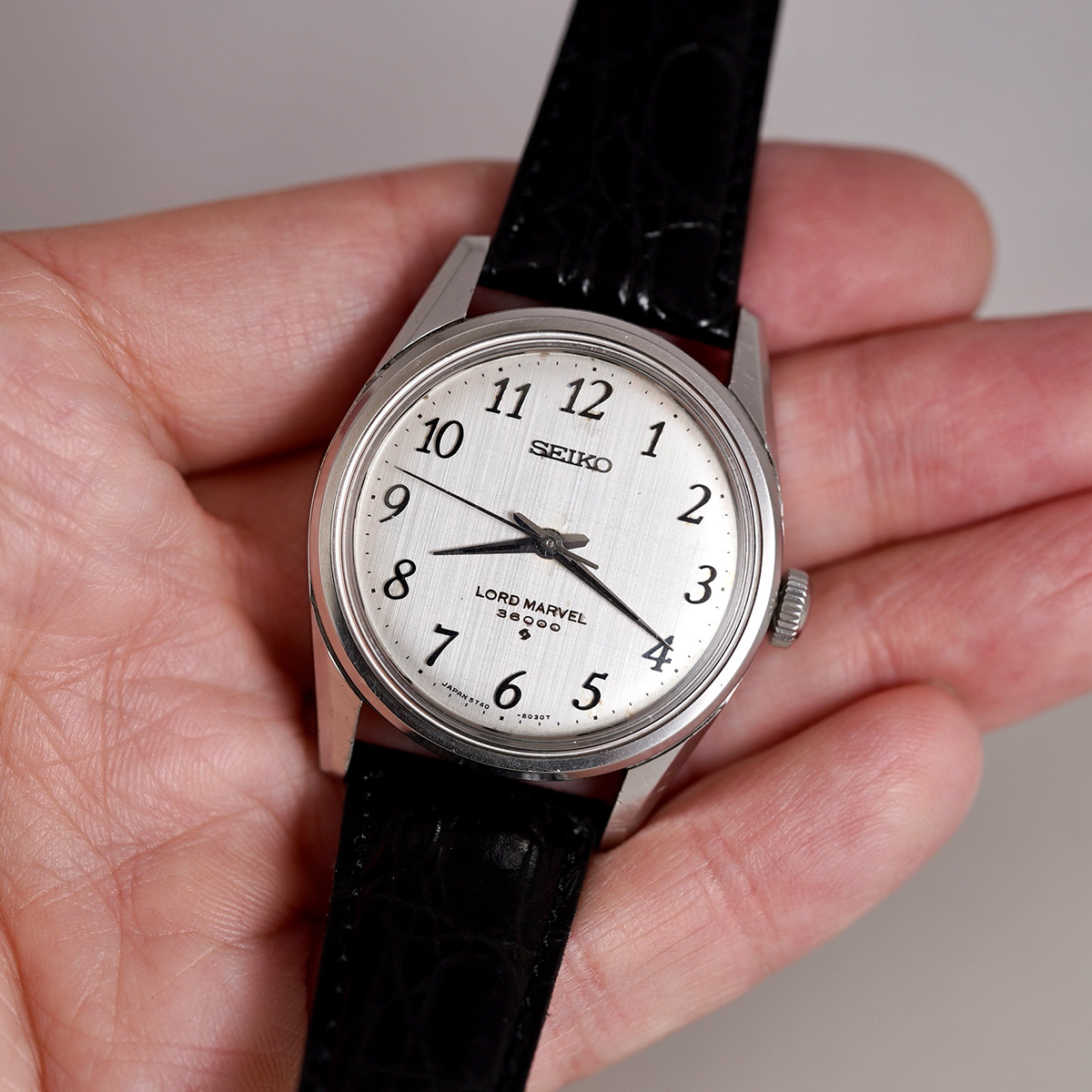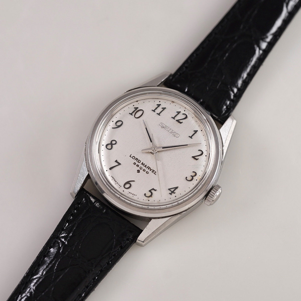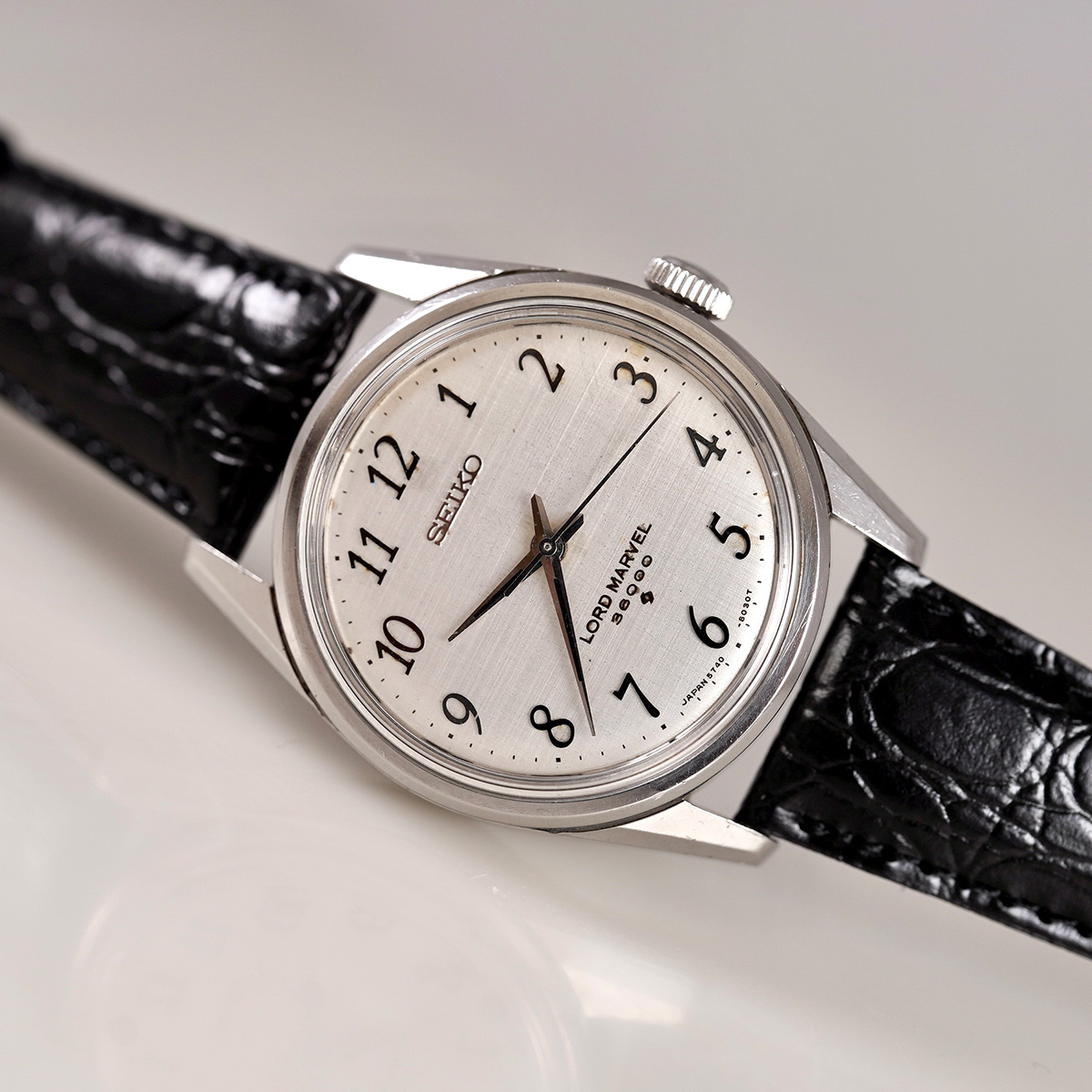 1958年から続くロードマーベルの最終形として、1967年より製造が始まったSEIKO社の「LORD MARVEL(ロードマーベル)36000」 最終生産は1978年頃になりますので、クォーツ時代となっても最後まで生き残ったモデルのひとつです。 国産初のハイビートモデルとしても有名で、モデル名の36000はテンプの振動数(10振動)を表しています。 文字盤には絹目状の仕上げが施されており、手の込んだ作り込みに当時の技術を感じます。 当時からのオリジナルの文字盤と針、インデックスなどがセットされ、所々、経年劣化はありますが、肉眼ではそれほど気にならないコンディションを保っていると思います。 外装も多少の小傷はありますが、致命的な箇所は無いです。 ムーブメントは後に続く45KSおよび45GSの先駆けとなった、手巻き36000振動の「Cal.5740C」を搭載しています。 Mimosa社の革ベルトをセレクト。 分解掃除を済ませ日差15秒程で稼働しております。 | |