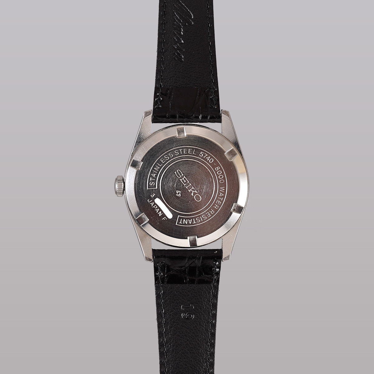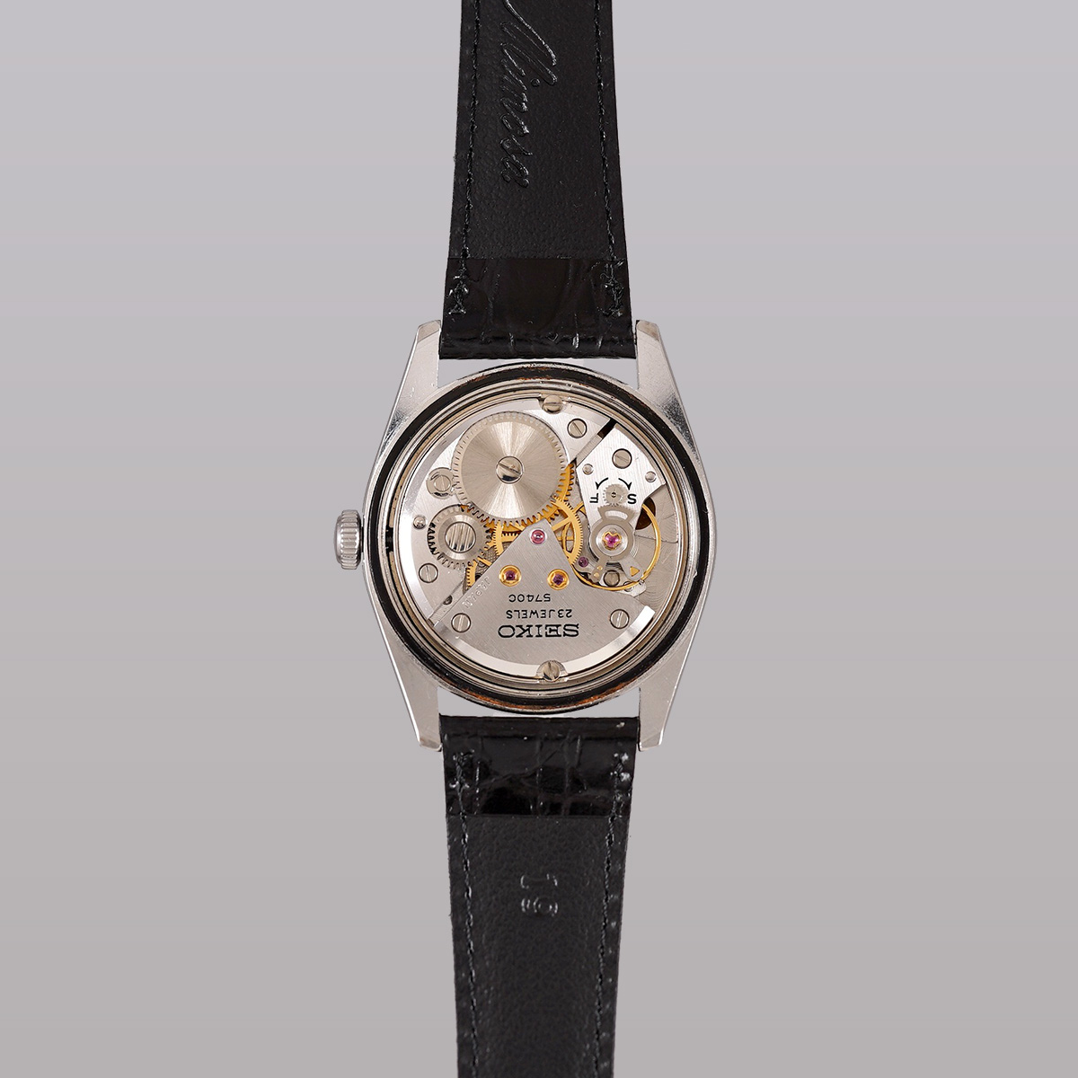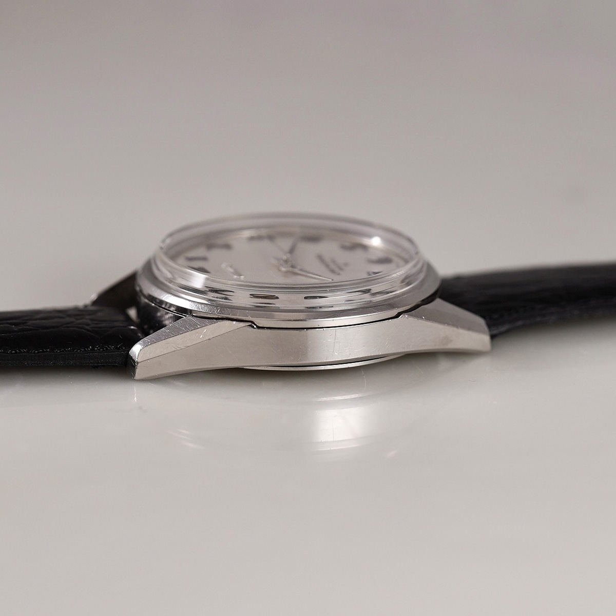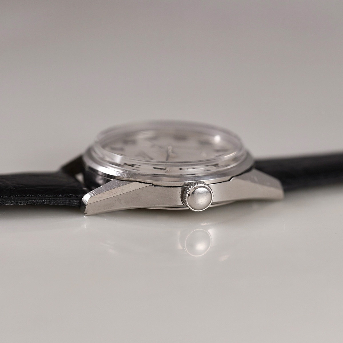 1958年から続くロードマーベルの最終形として、1967年より製造が始まったSEIKO社の「LORD MARVEL(ロードマーベル)36000」 最終生産は1978年頃になりますので、クォーツ時代となっても最後まで生き残ったモデルのひとつです。 国産初のハイビートモデルとしても有名で、モデル名の36000はテンプの振動数(10振動)を表しています。 文字盤には絹目状の仕上げが施されており、手の込んだ作り込みに当時の技術を感じます。 当時からのオリジナルの文字盤と針、インデックスなどがセットされ、所々、経年劣化はありますが、肉眼ではそれほど気にならないコンディションを保っていると思います。 外装も多少の小傷はありますが、致命的な箇所は無いです。 ムーブメントは後に続く45KSおよび45GSの先駆けとなった、手巻き36000振動の「Cal.5740C」を搭載しています。 Mimosa社の革ベルトをセレクト。 分解掃除を済ませ日差15秒程で稼働しております。 | |
