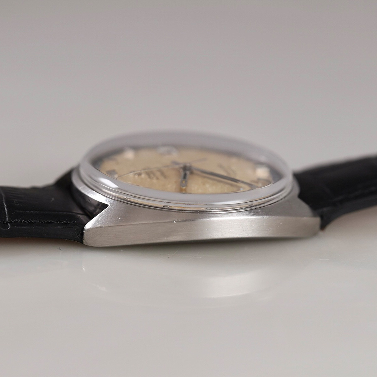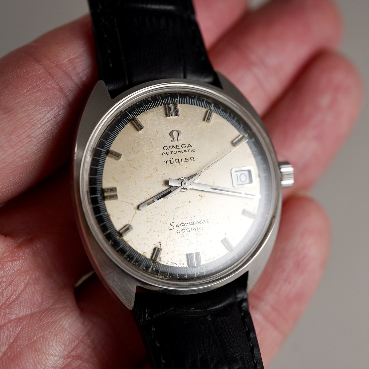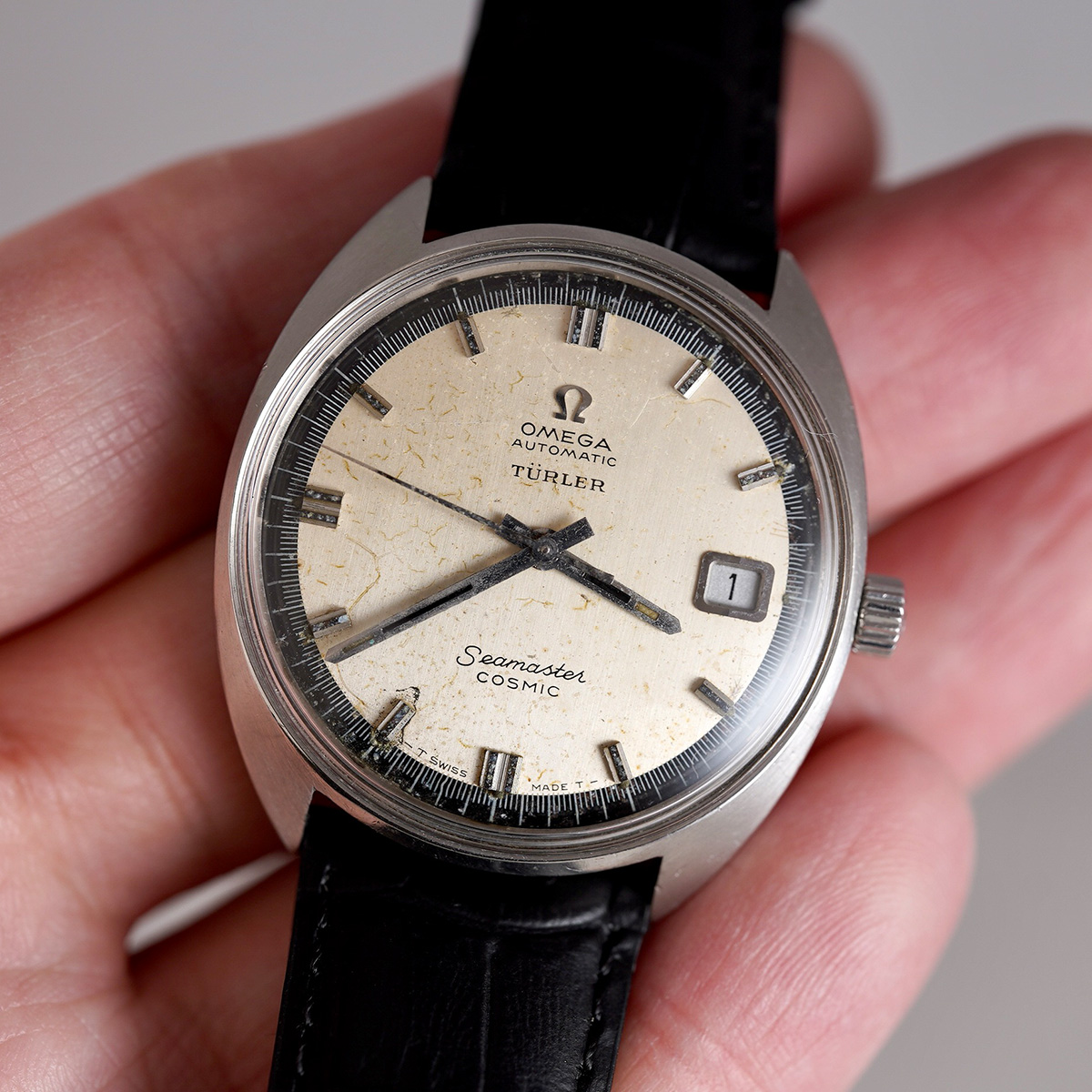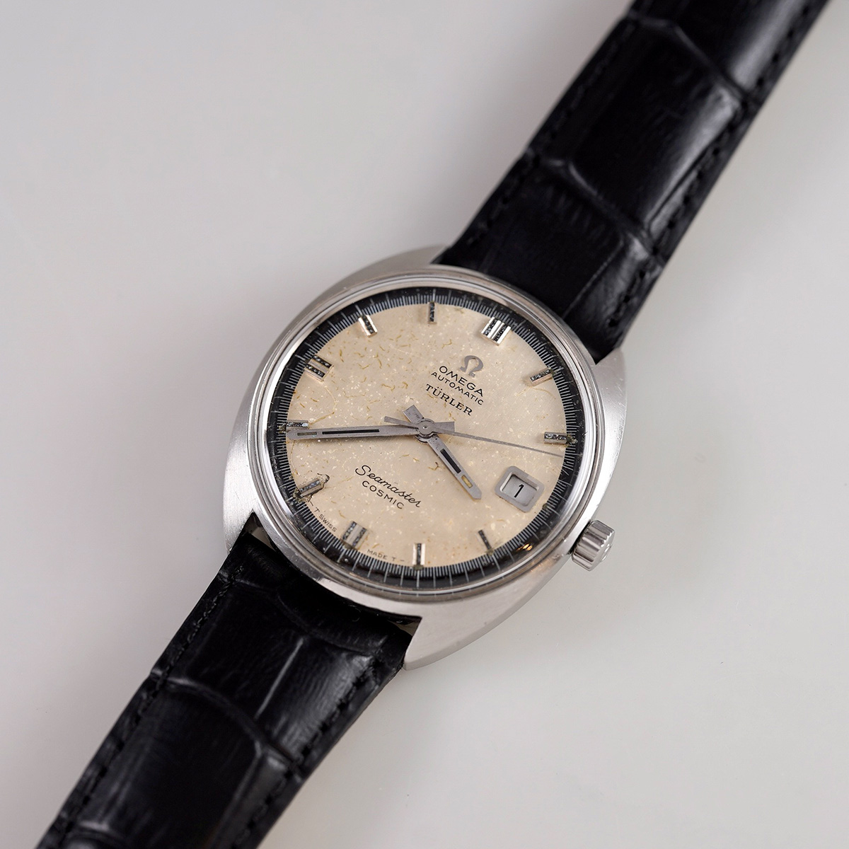 スタンダードなシーマスターを、よりスポーツウォッチへと進化させたモデルと言われ、デザインされたモデル。 宇宙を意味するペットネーム「SEAMASTER COSMIC(シーマスター ・コスミック)」1960年代後半〜1970年代前半に生産されたモデルになり、こちらは、ミニッツトラックが目を惹く、通称「レイルウェイ」のツートンダイヤル。 防水性を高める為、「ユニコック」と呼ばれる特徴的なワンピースケースが採用されています。 12時位置のΩ:ブランドマーク・ロゴ下にスイス・チューリッヒの時計宝飾店であるTURLER(チューラー)文字が入る通称:ダブルネームになります。 その文字盤は経年変化が見られ、好みにはなりますが、全体的にエイジングが見られる唯一無二の表情です。 ケースは小傷等はありますが、オリジナルのフォルムは保っていると思います。 ムーブメントはオメガの名機「Cal.565」を搭載。 デイト機能を備えた実用的な一本。CASSISの黒色革ベルトをセレクト。分解掃除を済ませ日差15秒程で稼働しております。 | |
