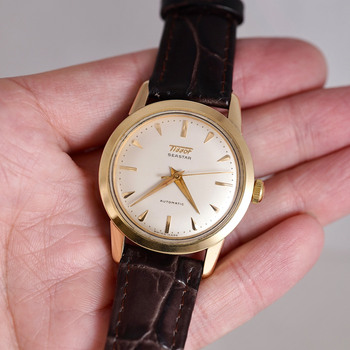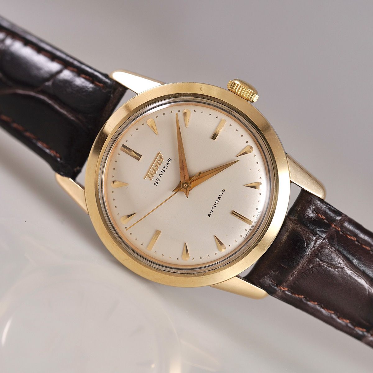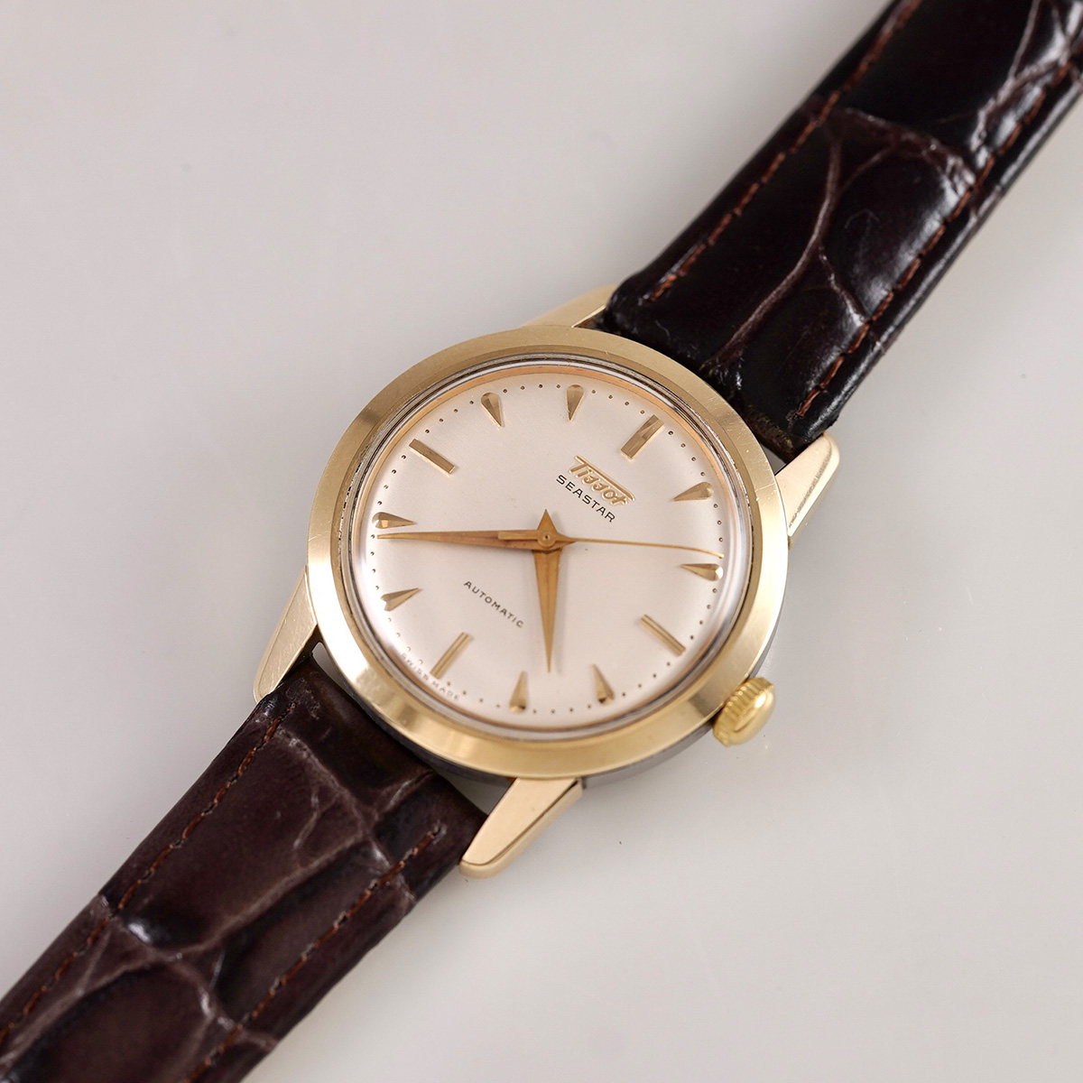 1853年スイスにて創設の老舗ブランド、TISSOT(ティソ)からSEASTAR(シースター)1950年代頃製造のモデルになります。 パッと見の印象からも特徴的な一本。 文字盤はホワイト系の仕上げになり、ブランドロゴや針、インデックス等はゴールド色で仕上げられ、品の良さを感じます。 ダイヤモンドカットされたインデックスは多面に仕上げてあるので、見る角度を変えるとキラキラと存在感を示してくれます。 ミニッツマーカーはパールドット仕上げになり、中心にセットされた3本の針の仕上げも細かい箇所までこだわった作り込みになっています。ミドルケースは厚めのGF仕上げ。ベルトを装着するラグ足もしっかりとした作りになり目立つ痛みは見られません。裏蓋はSS(ステンレススチール製)のねじ込み式(スクリューバック)の構造になり、搭載のムーブメントは全回転式ローターの自動巻き機構。実用性を考慮した一本です。茶系の革ベルトをセレクト。分解掃除を済ませ日差20秒程で稼働しております。 | |