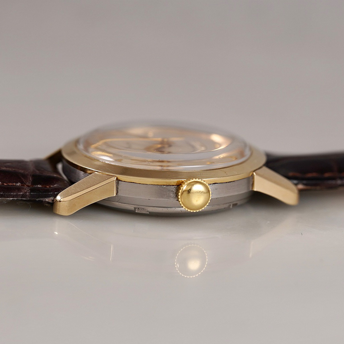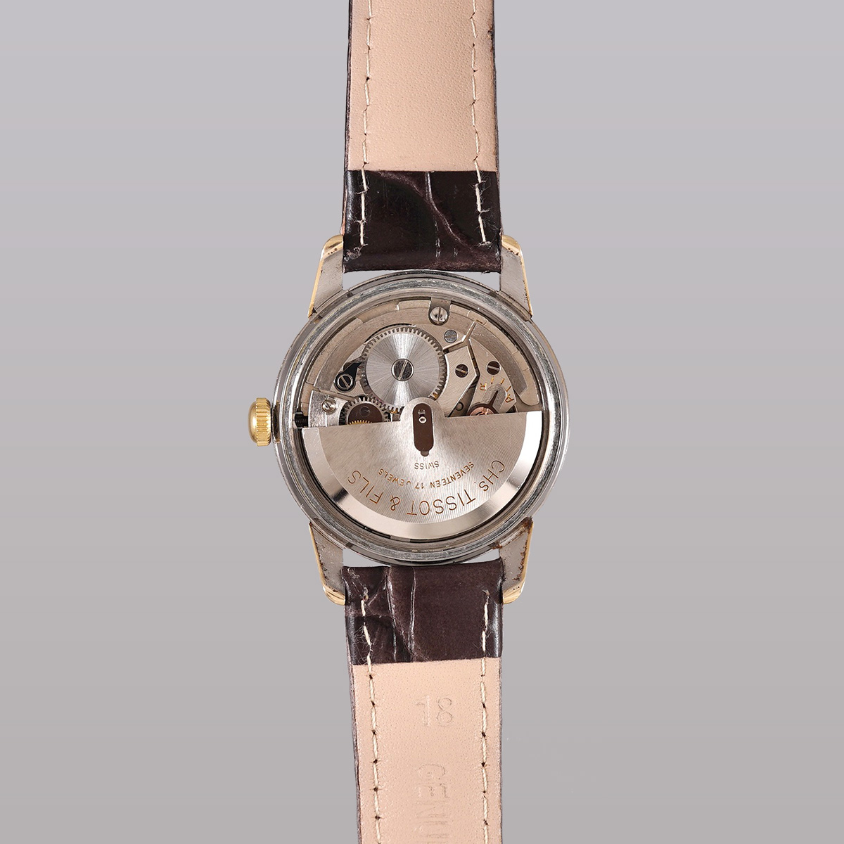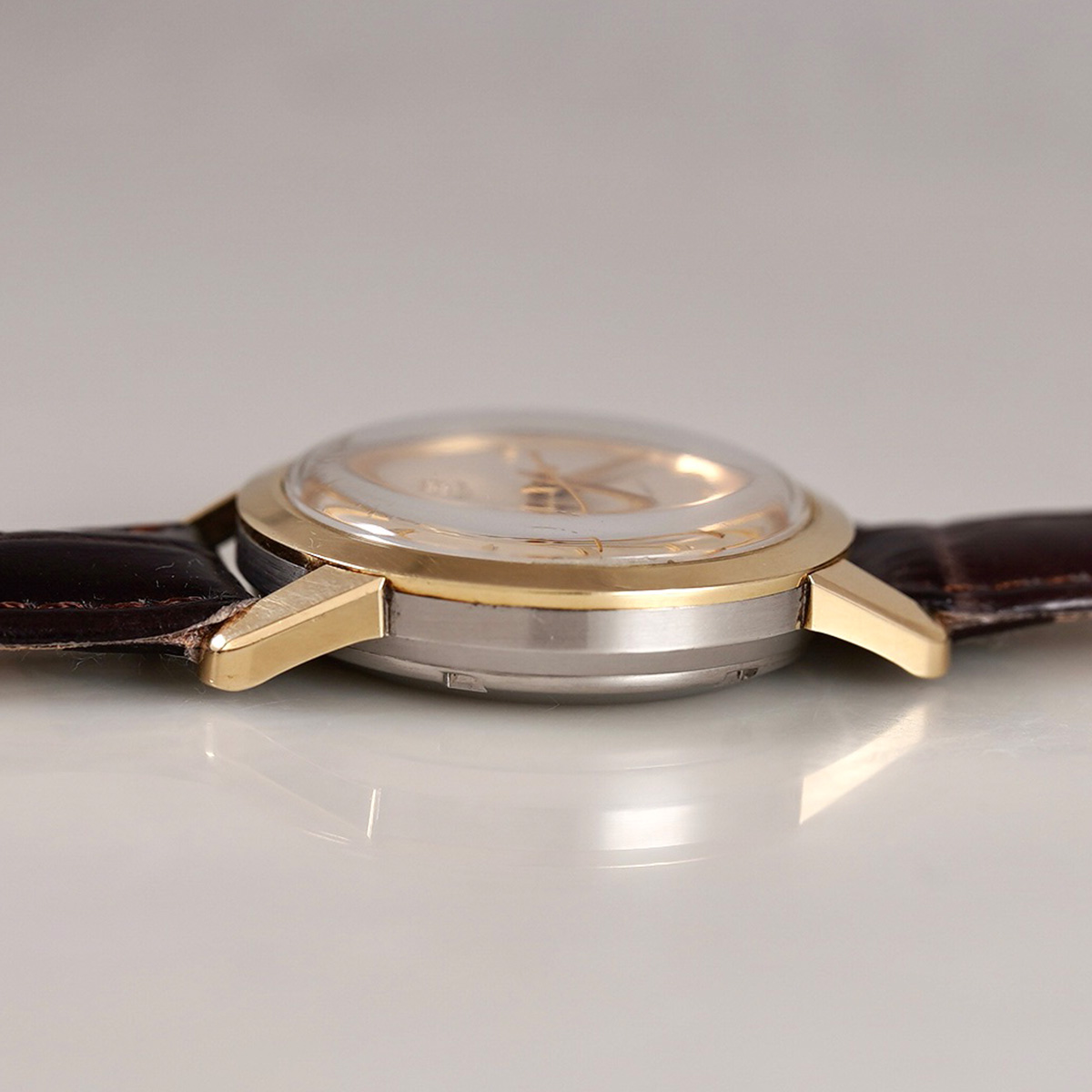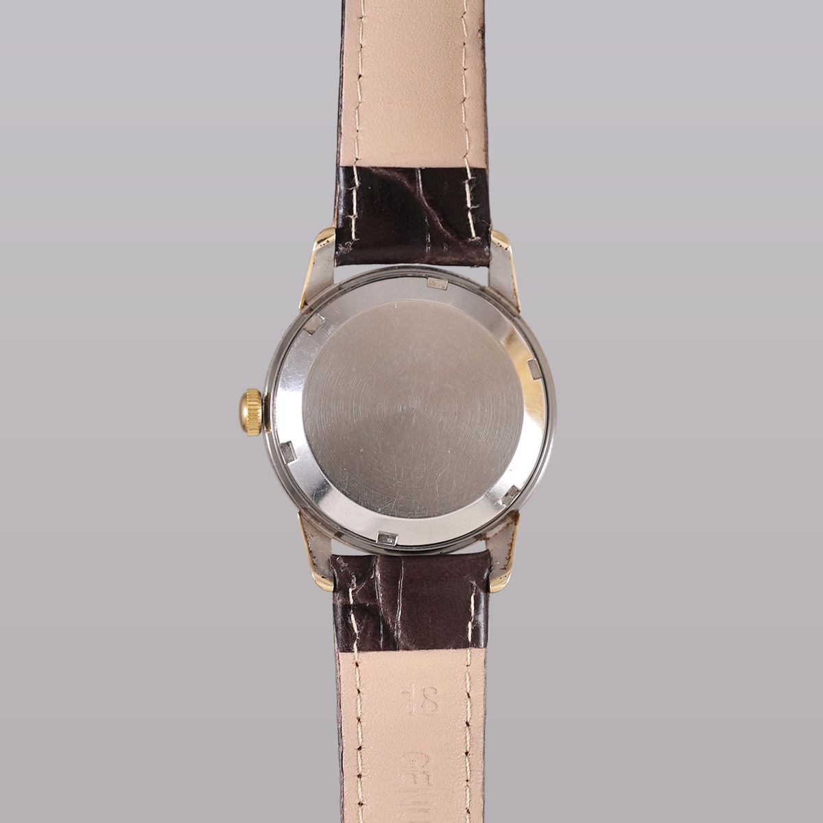 1853年スイスにて創設の老舗ブランド、TISSOT(ティソ)からSEASTAR(シースター)1950年代頃製造のモデルになります。 パッと見の印象からも特徴的な一本。 文字盤はホワイト系の仕上げになり、ブランドロゴや針、インデックス等はゴールド色で仕上げられ、品の良さを感じます。 ダイヤモンドカットされたインデックスは多面に仕上げてあるので、見る角度を変えるとキラキラと存在感を示してくれます。 ミニッツマーカーはパールドット仕上げになり、中心にセットされた3本の針の仕上げも細かい箇所までこだわった作り込みになっています。ミドルケースは厚めのGF仕上げ。ベルトを装着するラグ足もしっかりとした作りになり目立つ痛みは見られません。裏蓋はSS(ステンレススチール製)のねじ込み式(スクリューバック)の構造になり、搭載のムーブメントは全回転式ローターの自動巻き機構。実用性を考慮した一本です。茶系の革ベルトをセレクト。分解掃除を済ませ日差20秒程で稼働しております。 | |