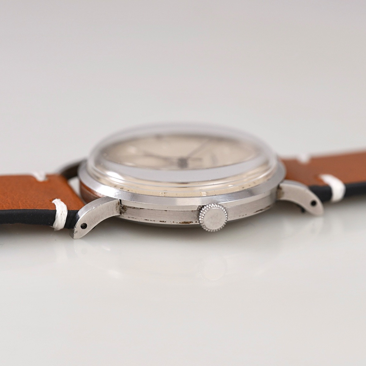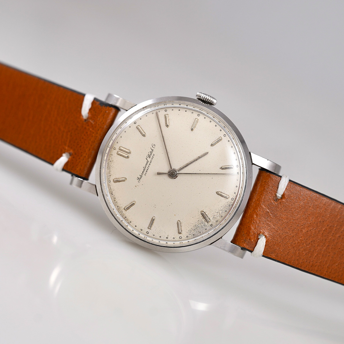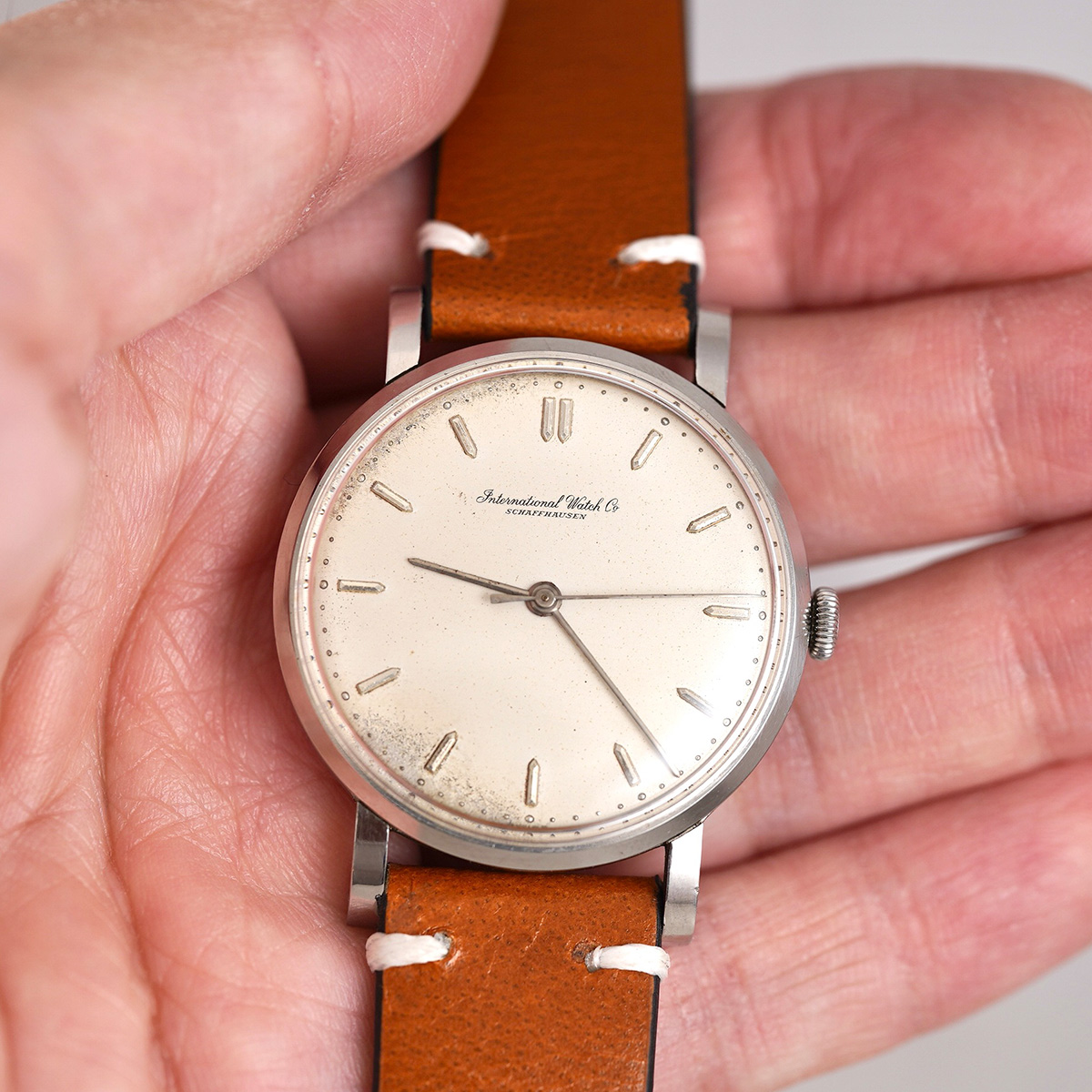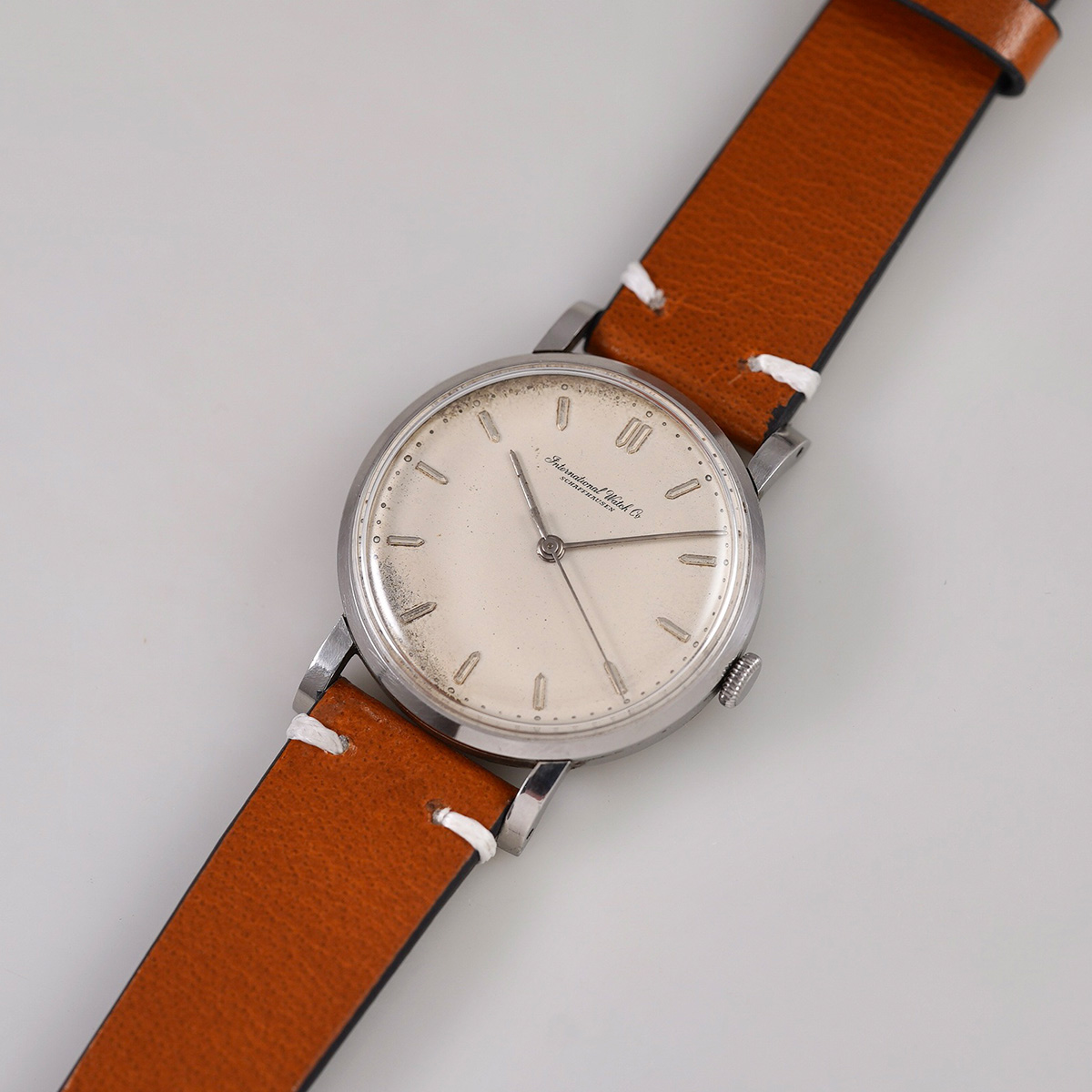 1950年代後期(シリアルナンバー:参考資料より1957年頃)製造の、通称「オールドインター」になります。 オールドインターの特徴のひとつであるパール型ミニッツドットと、ホワイト系の文字盤に砲弾型インデックスを配し、細めのストレート針を装備した雰囲気ある一本。 オフホワイトのオリジナル文字盤は6~8時位置他、やや汚れが見られます。 好みによりますが、実物は気になるほどではないかと思います。 あえて言うならば1950年代から刻まれた時をエイジングと感じられるヴィンテージならではの表情です。 搭載ムーブメントは1950年ごろから1970年ごろにかけて長期に渡りIWCを支えてきた名機である手巻きのCal.89。ベルトを付けるラグ部はストレートデザインのしっかりした作りなっています。ケースデザイン・サイズ、シンプルな文字盤のデザイン、インデックスや針の作りなど、同時期のヴァシュロンコンスタンタンなどにも近い印象でしょうか!? 茶色の革ベルトをセレクト。分解掃除を済ませ日差20秒程で稼働しております。 | |