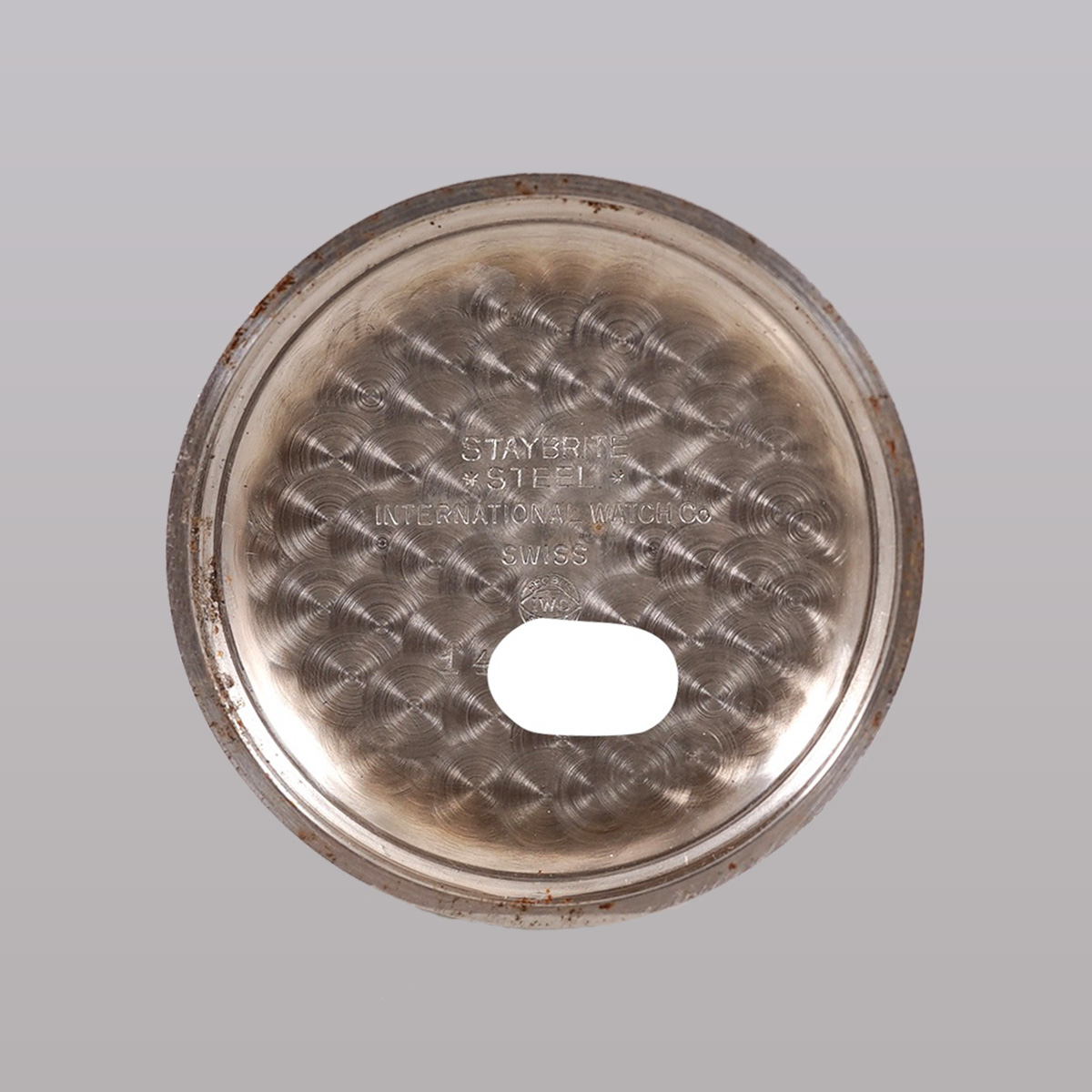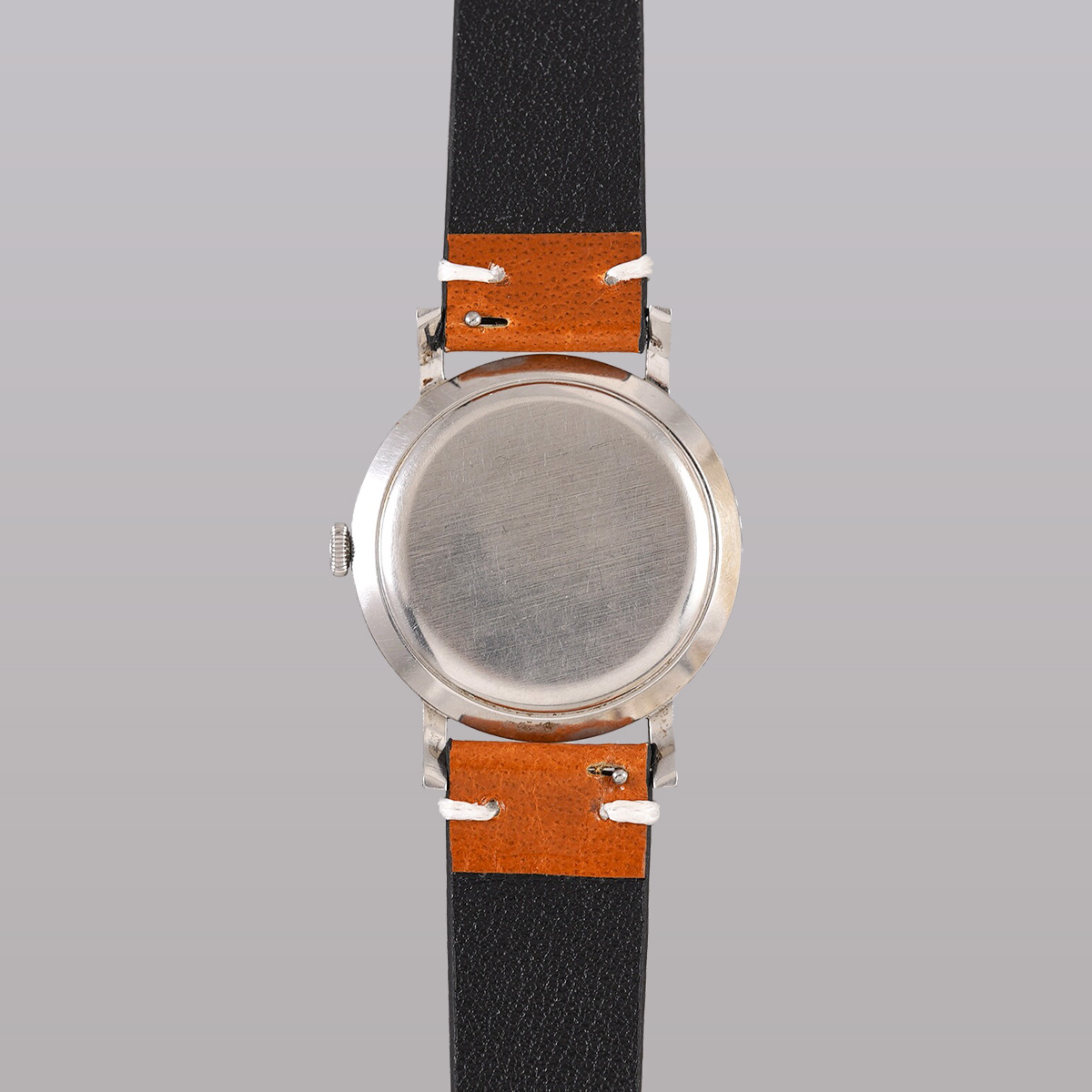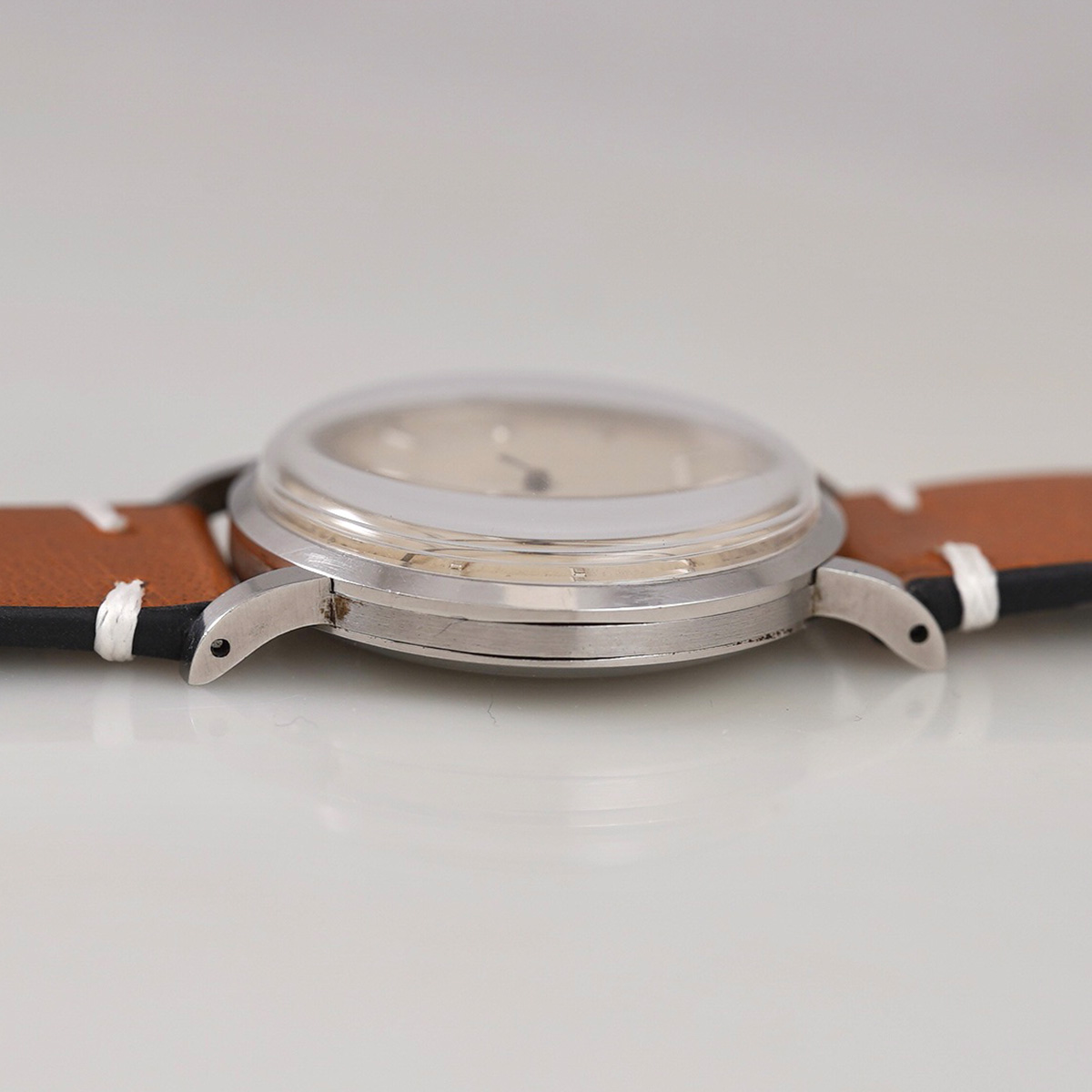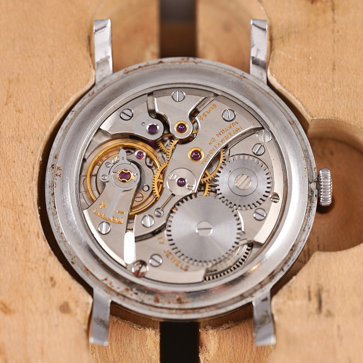 1950年代後期(シリアルナンバー:参考資料より1957年頃)製造の、通称「オールドインター」になります。 オールドインターの特徴のひとつであるパール型ミニッツドットと、ホワイト系の文字盤に砲弾型インデックスを配し、細めのストレート針を装備した雰囲気ある一本。 オフホワイトのオリジナル文字盤は6~8時位置他、やや汚れが見られます。 好みによりますが、実物は気になるほどではないかと思います。 あえて言うならば1950年代から刻まれた時をエイジングと感じられるヴィンテージならではの表情です。 搭載ムーブメントは1950年ごろから1970年ごろにかけて長期に渡りIWCを支えてきた名機である手巻きのCal.89。ベルトを付けるラグ部はストレートデザインのしっかりした作りなっています。ケースデザイン・サイズ、シンプルな文字盤のデザイン、インデックスや針の作りなど、同時期のヴァシュロンコンスタンタンなどにも近い印象でしょうか!? 茶色の革ベルトをセレクト。分解掃除を済ませ日差20秒程で稼働しております。 | |