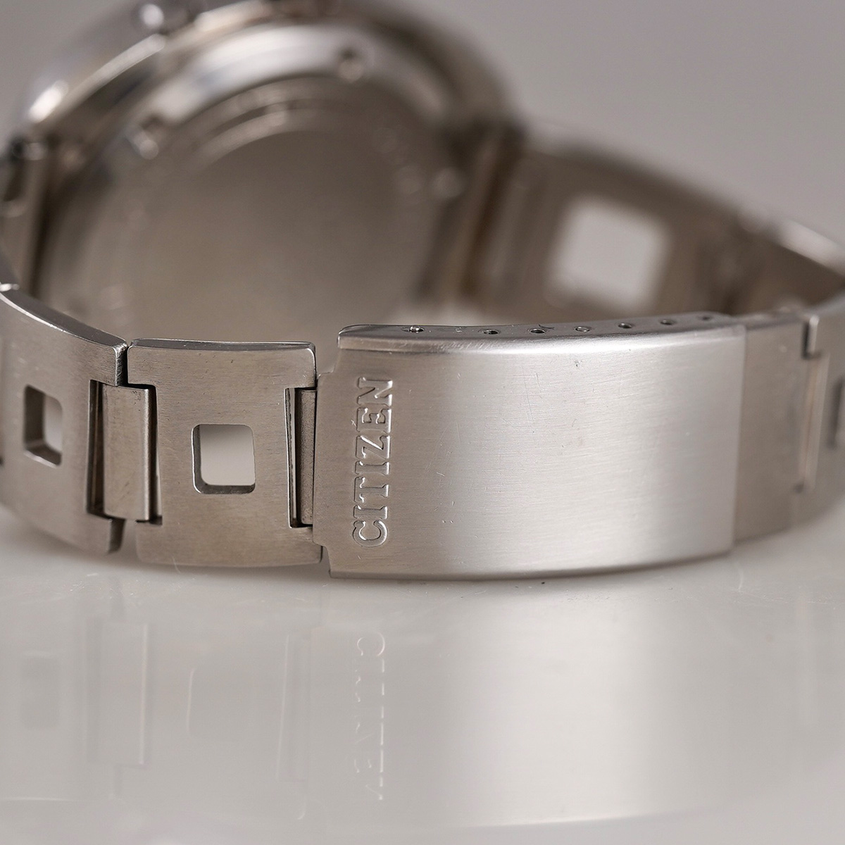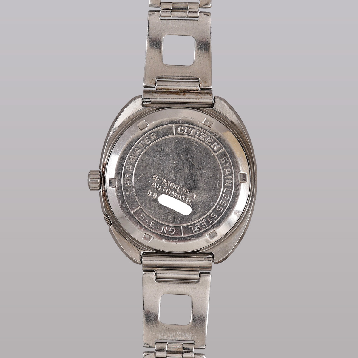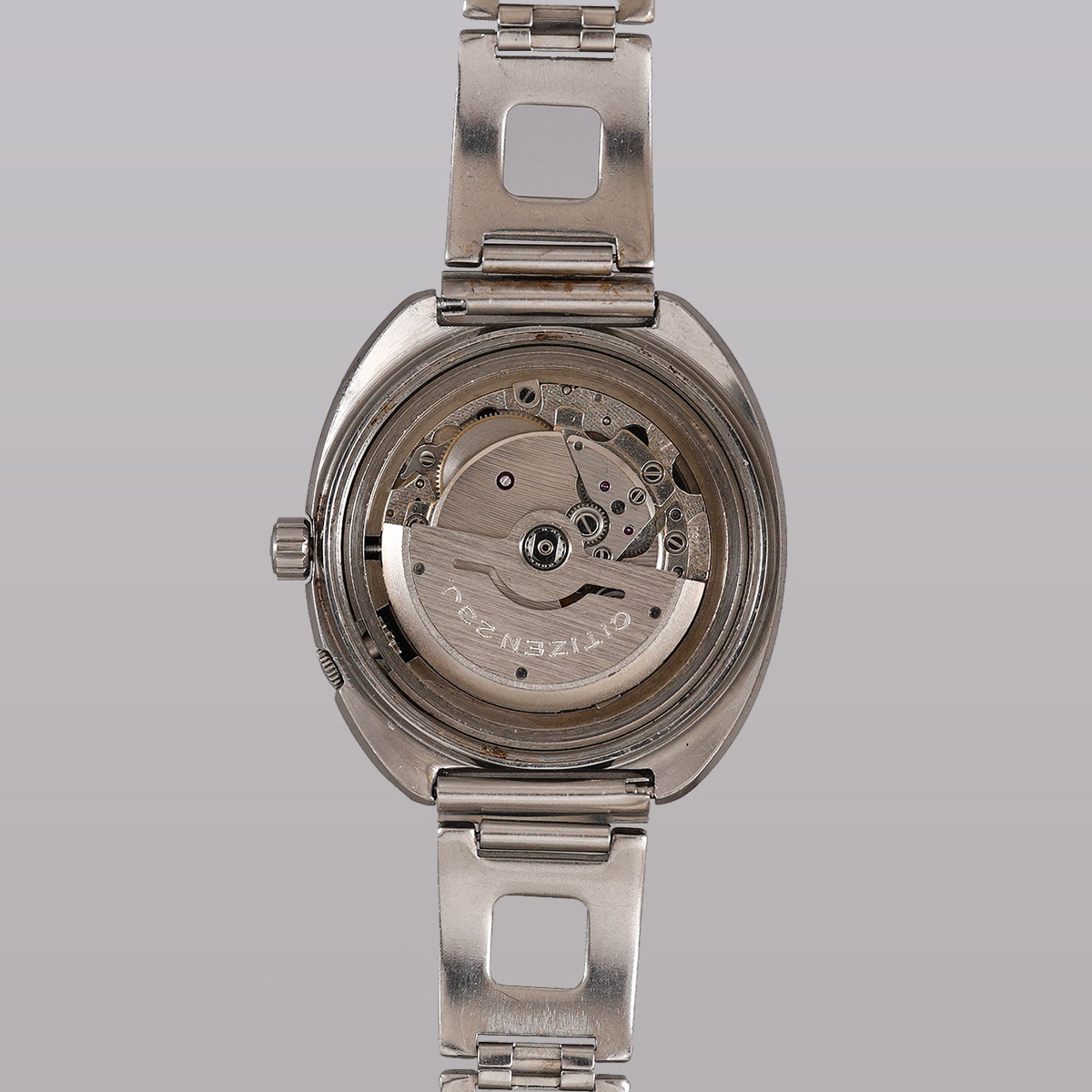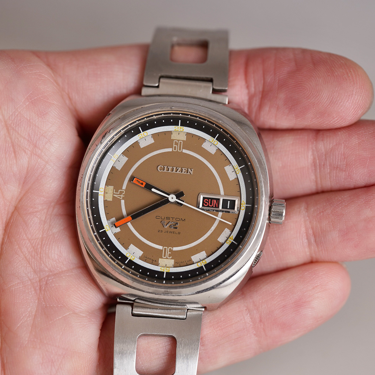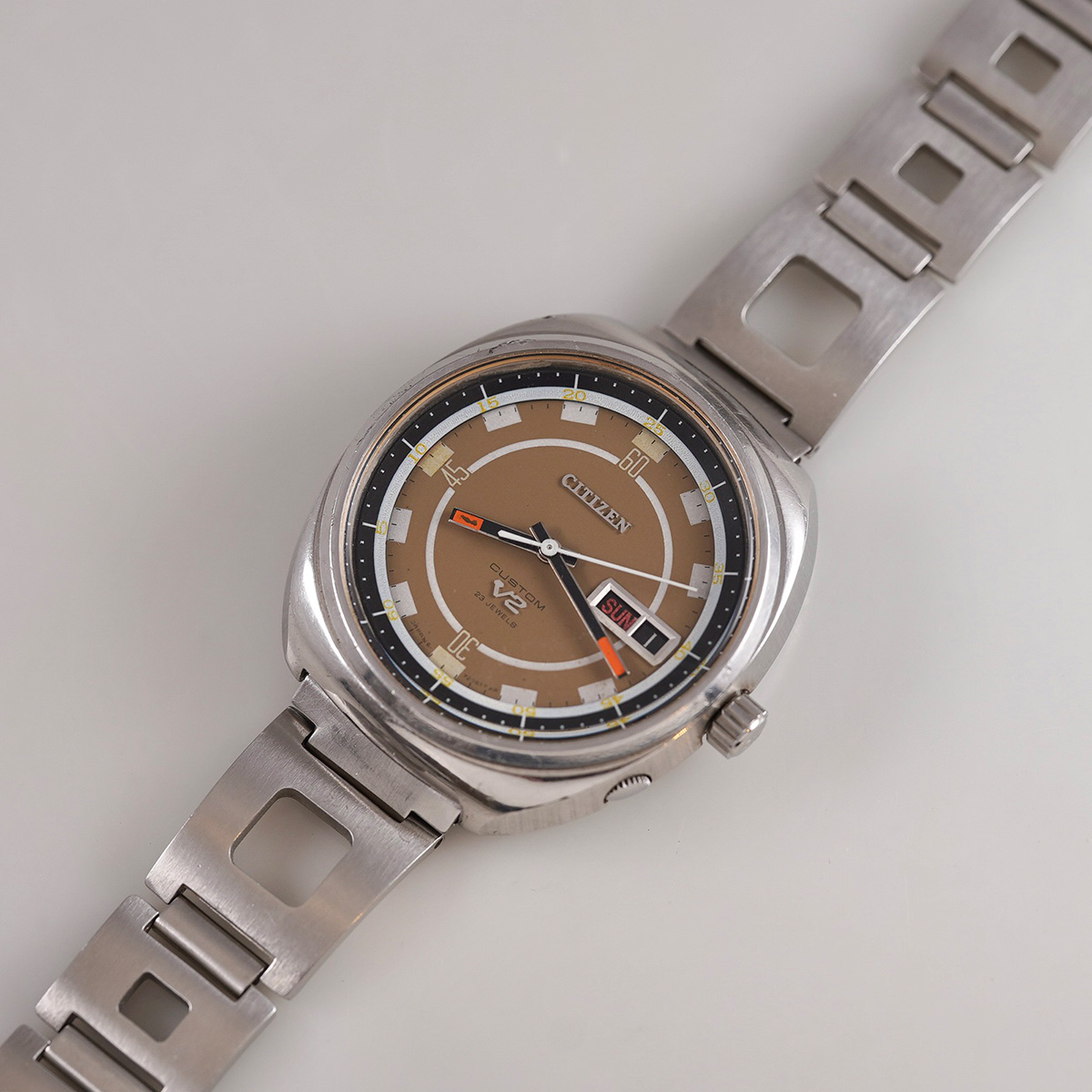 1970年代製、シチズンの「CUSTOM(カスタム) V2 」4-720474Y になります。 ケース径41mmの大振りケースにナチュラルカラーの文字盤をセットした希少モデル。 そのビッグケースに収まった文字盤外周には黒縁の目盛りと60刻みの回転インナーベゼルを装備。 長短針は先をオレンジ色に仕上げ、秒針は白仕上げの視認性を考慮。 スクリューバック式(ねじ込み式裏蓋)、デイデイト(日付・曜日)と実用的な一本です。 短針オレンジカラーが落ちていますが、文字盤やその他の針などはコンデイション良好。 CITIZEN(シチズン)社製.SSブレスが装着されているのもおすすめポイントです(腕周り〜21cmほどまで装着可能:合わせバックルを付けての長さになります)。 分解掃除を済ませ日差20秒程で稼働しております。 | |
