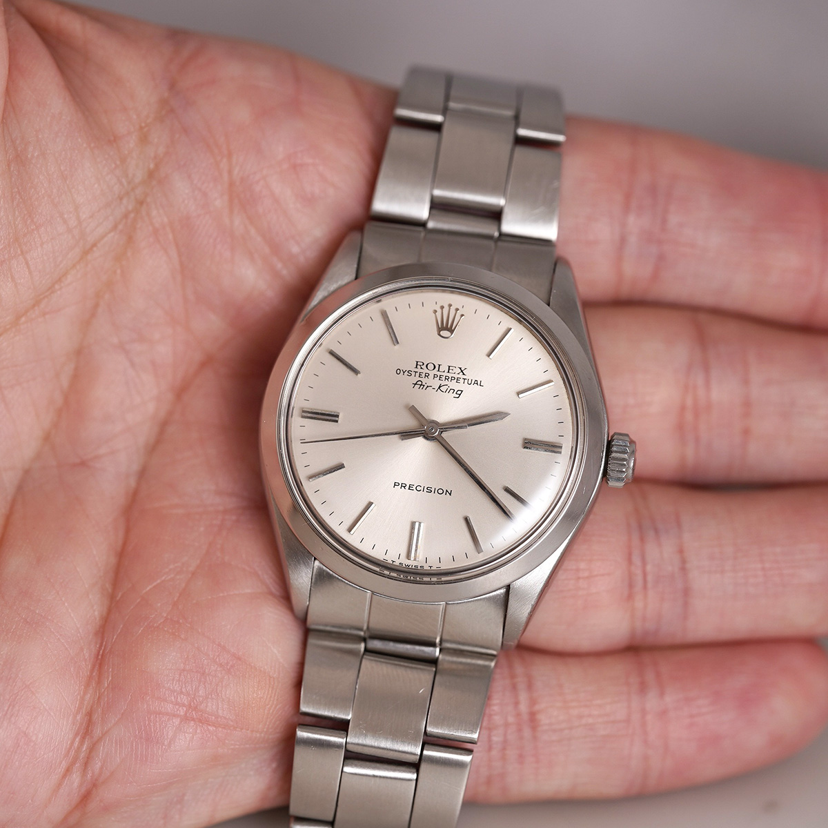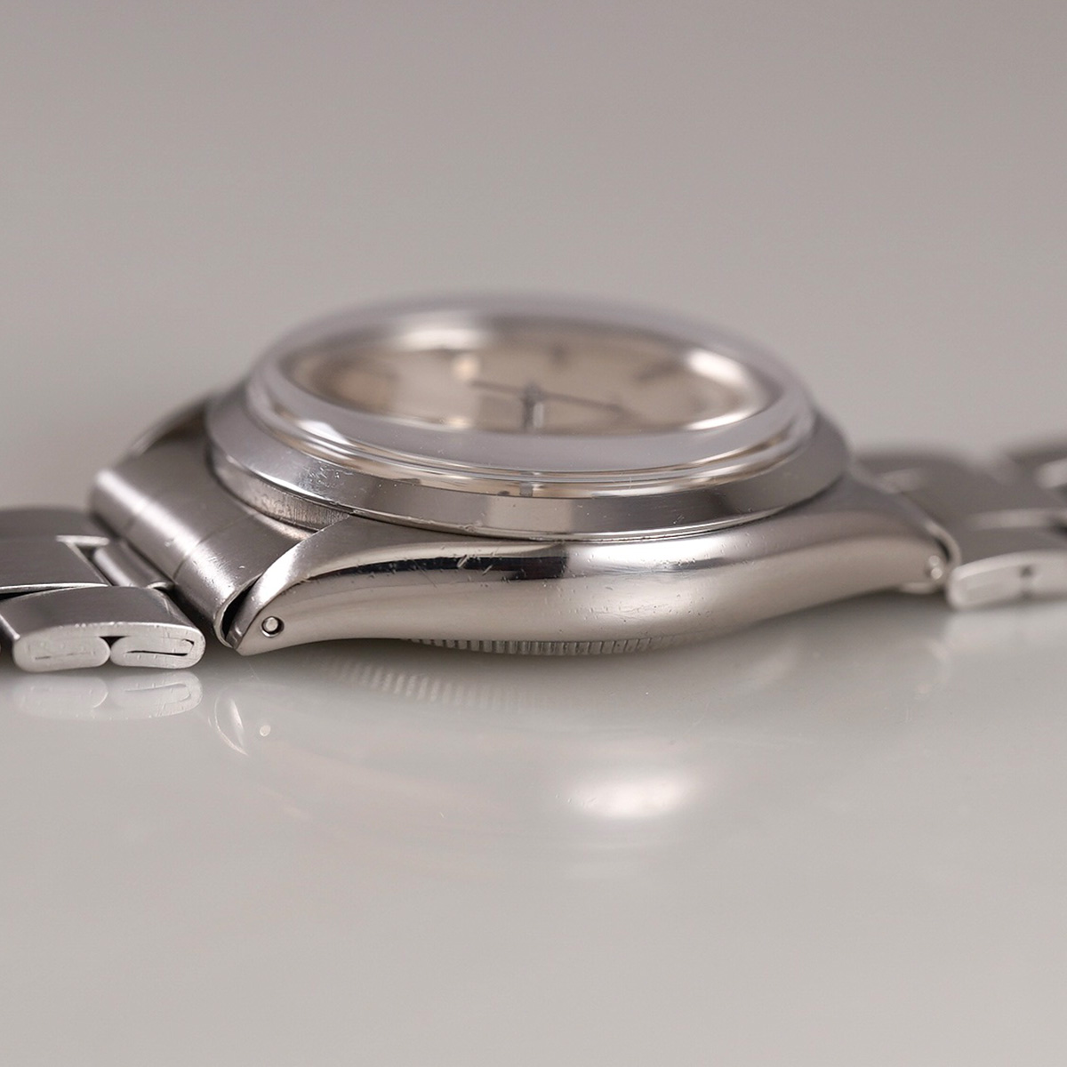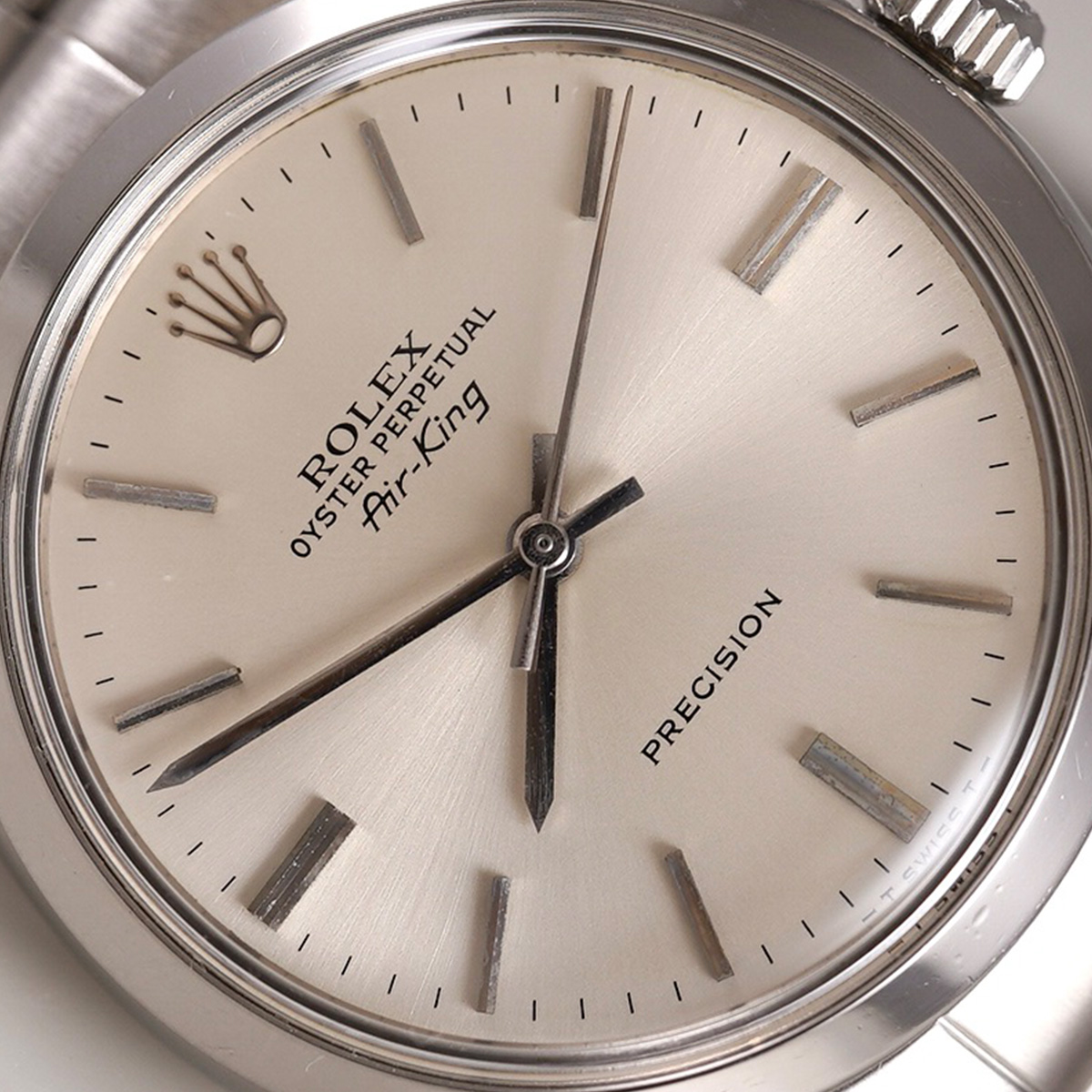 現存する最古のペットネームであるロレックスの自動巻モデル、シルバーダイヤルのエアキングになります。 サンバースト状のシルバーダイヤルは気になるような痛みも無くコンディション良好です。 シンプルな定番モデルなので、老若男女問わず、オンオフ問わず全てのスタイルにマッチする優れもの。 エントリーモデルとしてはもちろん、セカンドモデルとしてもおすすめのモデルです。 人気の所以が分かります。 時計本体(シリアルナンバーから1973年製)に年式の整合性の取れた、FF357 / 7835.19(年式刻印無し!が正解◎です) ロレックス純正.巻きタイプの3連ブレスを装着(13コマのフル駒:腕周り〜20.5cm程まで装着可能)。分解掃除を済ませ日差15秒程で稼働しております。 | |