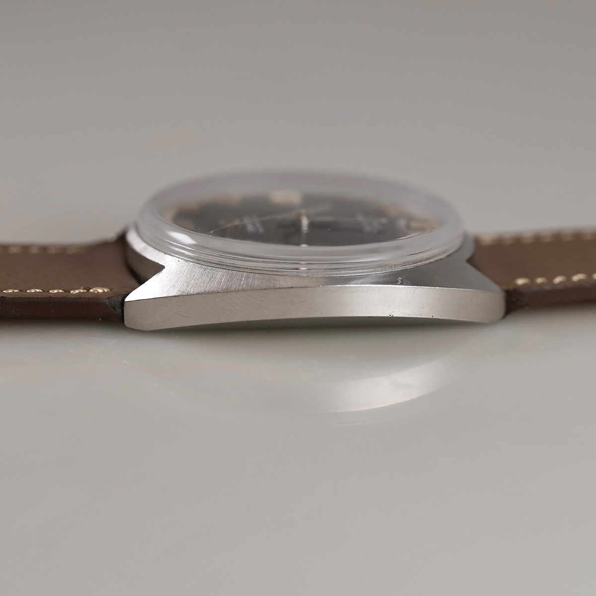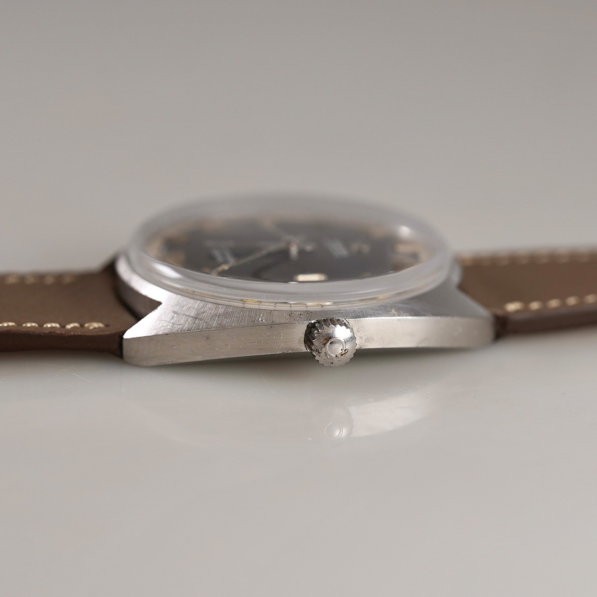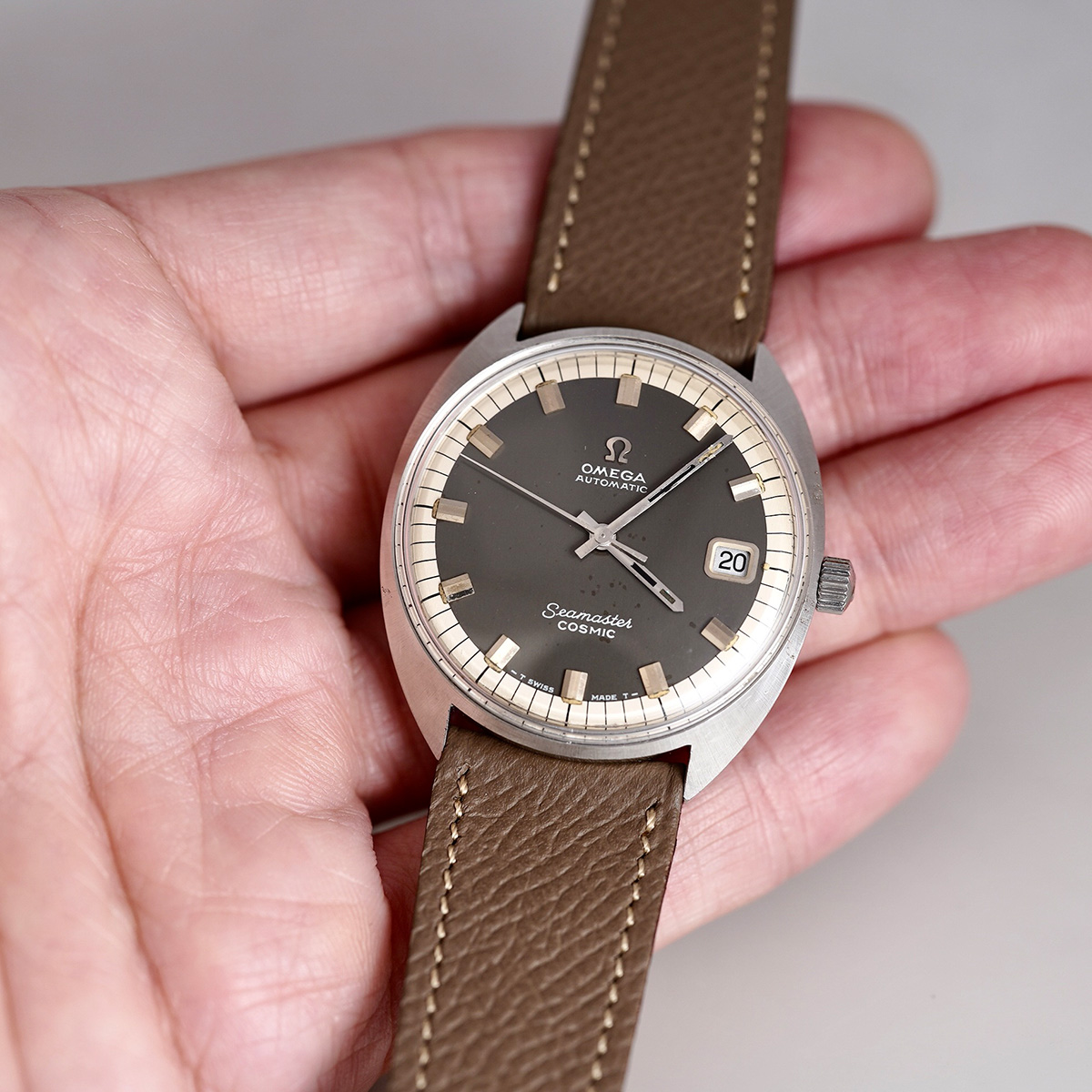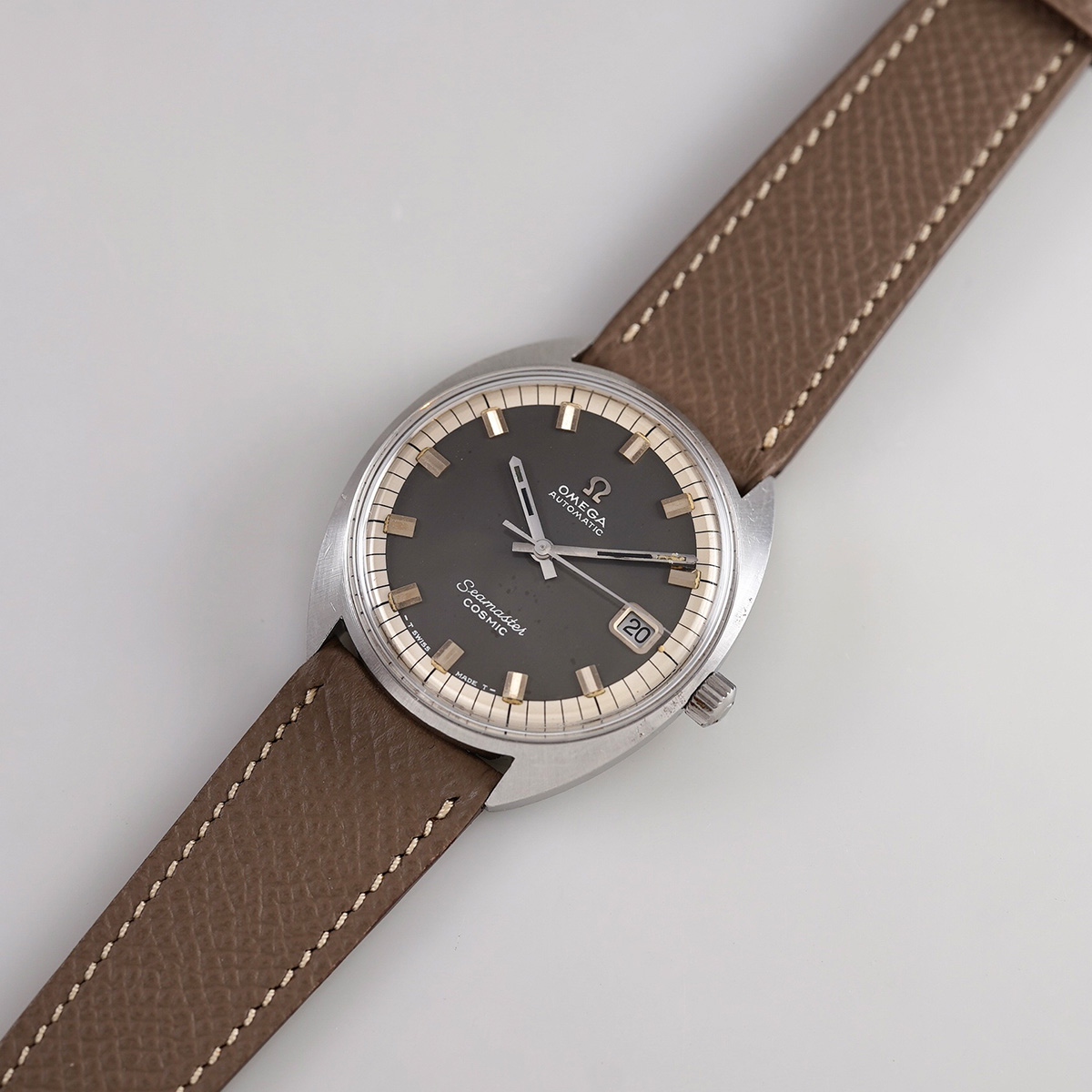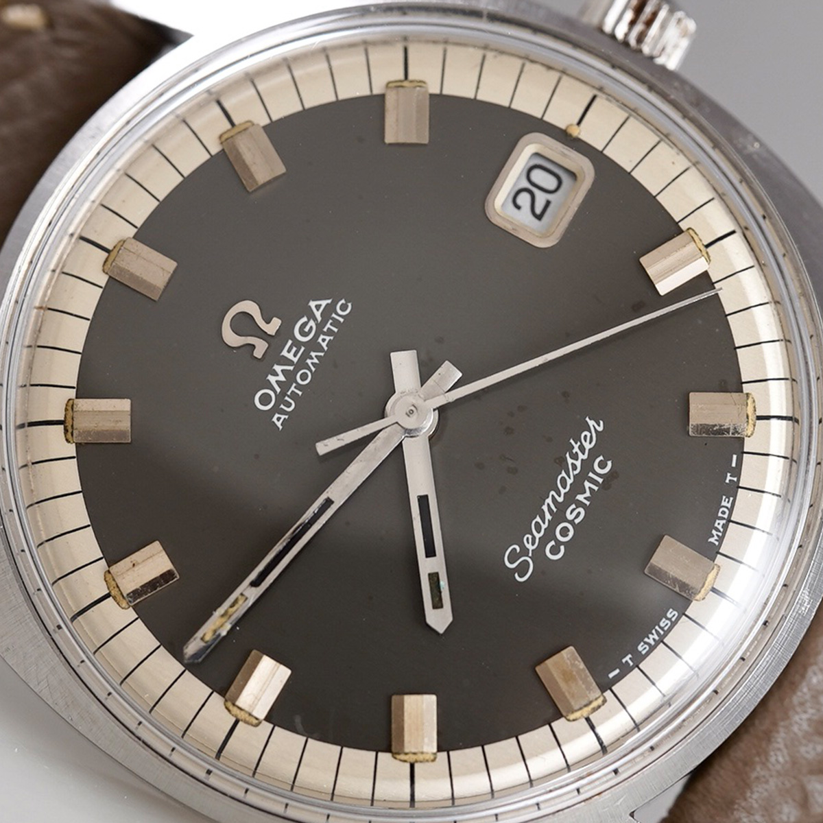 スタンダードなシーマスターを、よりスポーツウォッチへと進化させたモデルと言われ、デザインされたモデル。 宇宙を意味するペットネーム「SEAMASTER COSMIC(シーマスター ・コスミック)」1960年代後半〜1970年代前半に生産されたモデルになり、こちらは、文字盤の色がレアで目を惹く、グレーダイヤルに白系ミニッツダイヤルの配色。 防水性を高める為、「ユニコック」と呼ばれる特徴的なワンピースケースが採用されています。 文字盤に多少の経年変化が見られますが、ダーク系で落ち着いたカッコいい一本です。 ケースは小傷はありますが、オリジナルのフォルムは保って良好です。 ムーブメントはオメガの名機「Cal.565」を搭載。 デイト機能を備えた実用的な一本。CASSISの薄茶色革ベルトをセレクト。分解掃除を済ませ日差10秒程で稼働しております。 | |