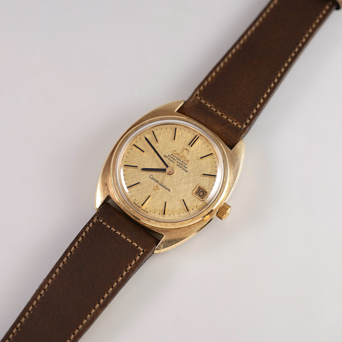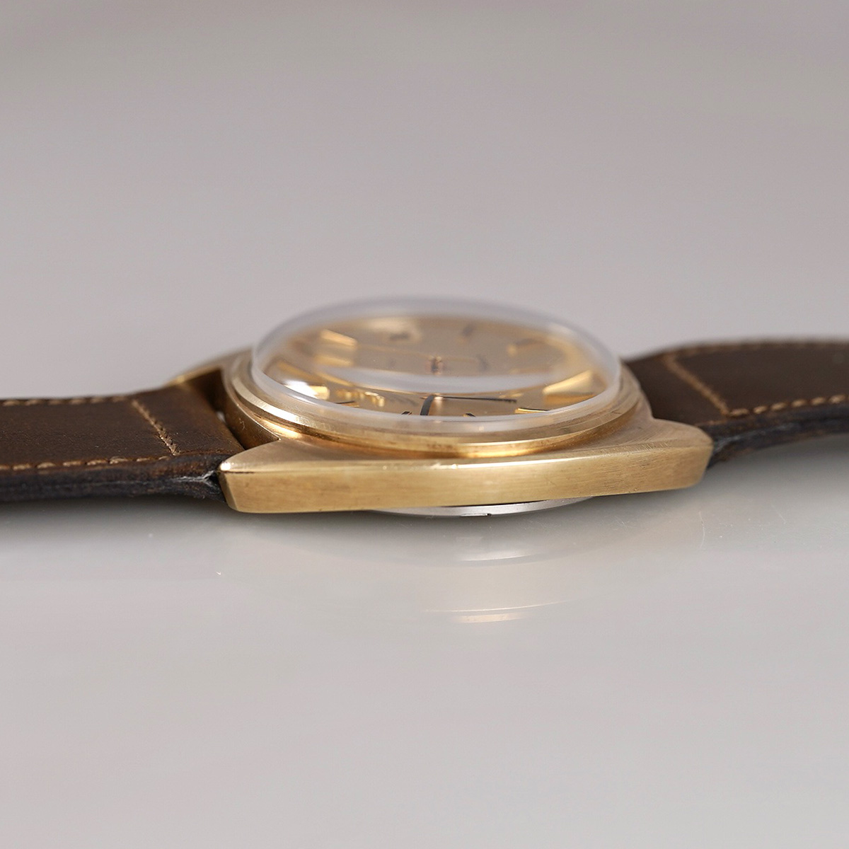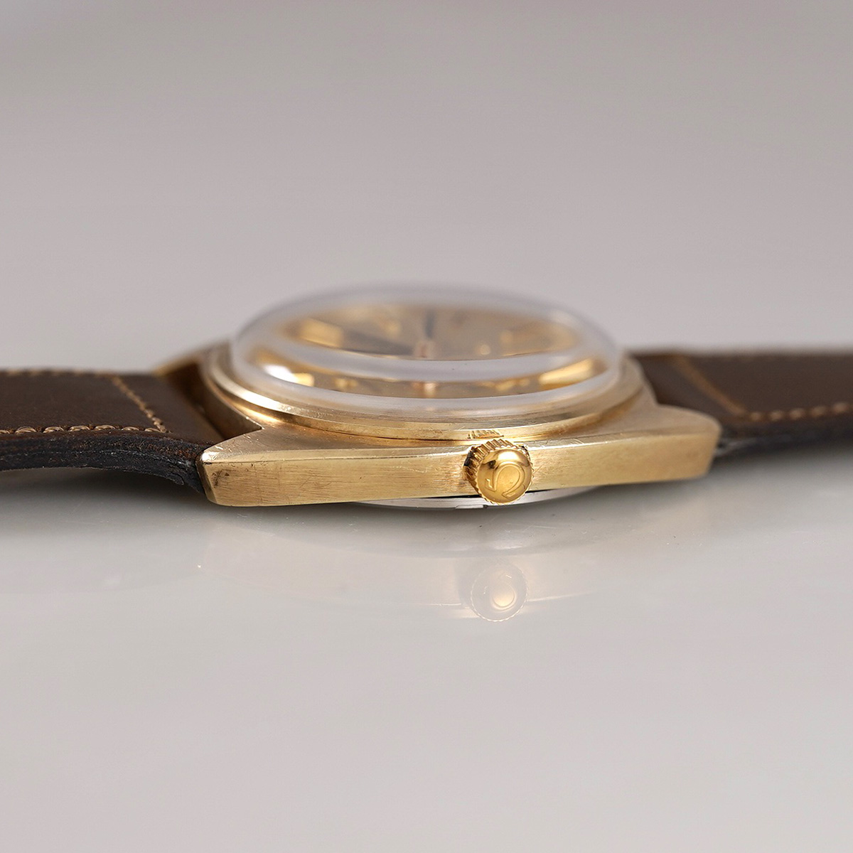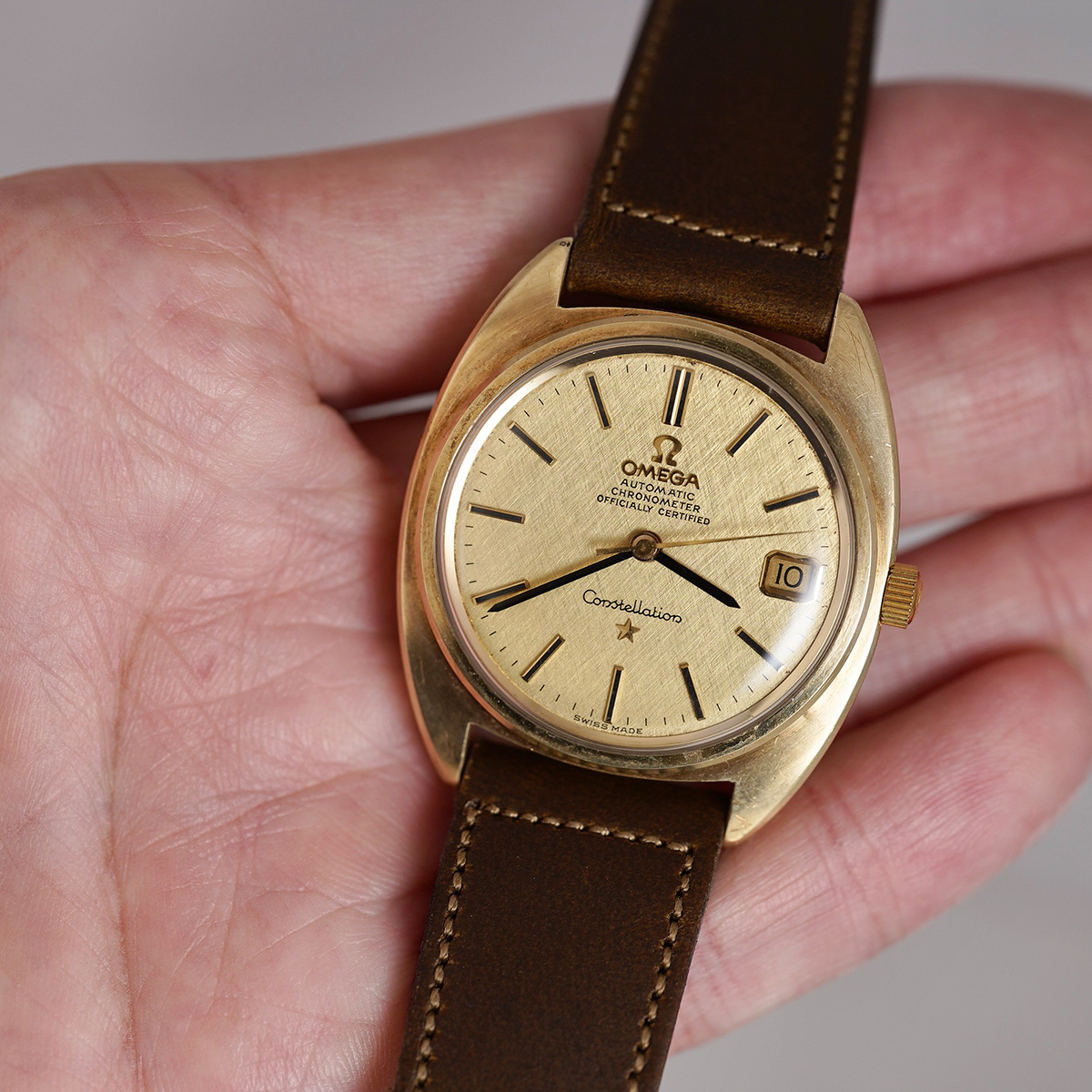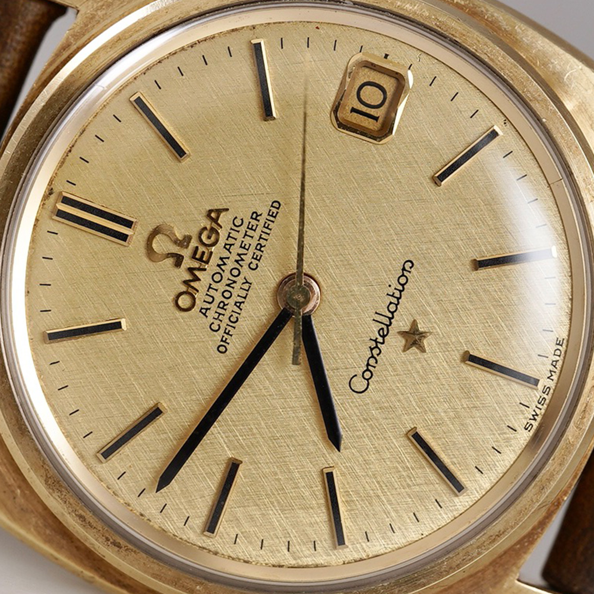 特徴的なケースフォルムで有名なオメガのコンステレーション、通称「Cライン」。 人気のモデルであり、このデザインはジェラルド・ジェンタ氏がデザインを手掛けました。 こちらの個体は、珍しく表側をステンレススチールに金を被せたゴールドトップになり、裏蓋はステンレススチール製のスクリューバックを採用しています。 ダイヤルはゴールドのリネン仕上げになり、これもレアポイントかと思います。 バーインデックスと、ペンシルハンドは視認性を考慮した、ブラック仕上げになり、実用性にも富み、凝った作り込みを感じます。 クロノメーター規格の高精度な自動巻きムーブメントであるCal.564 を搭載。 アキュレイトフォルム製革ベルトをセレクト。分解掃除を済ませ日差15秒程で稼働しております。 | |