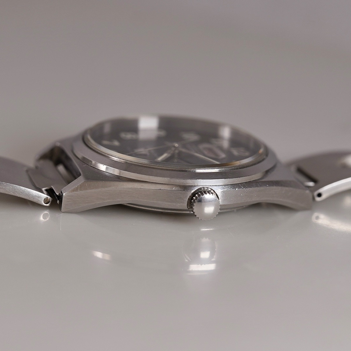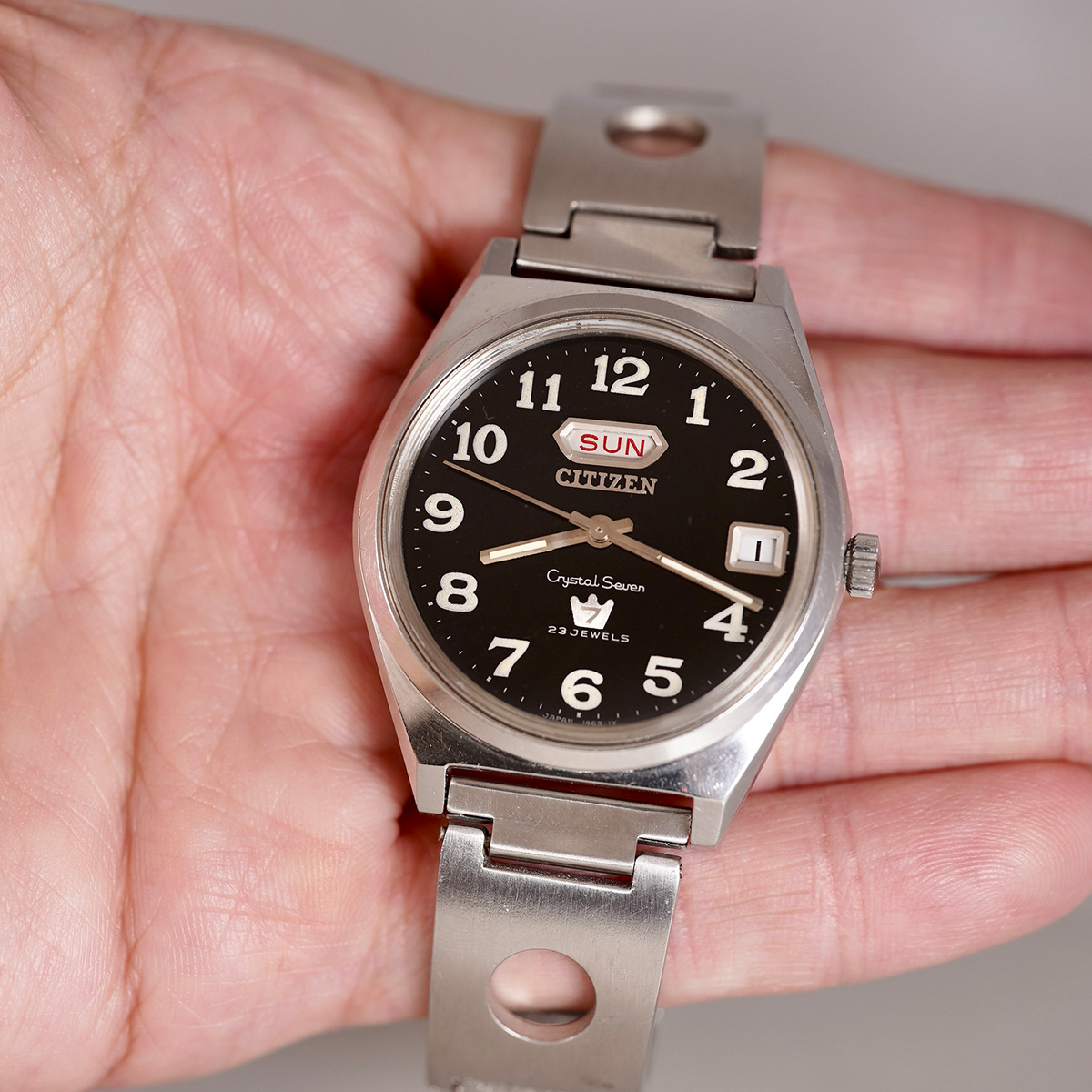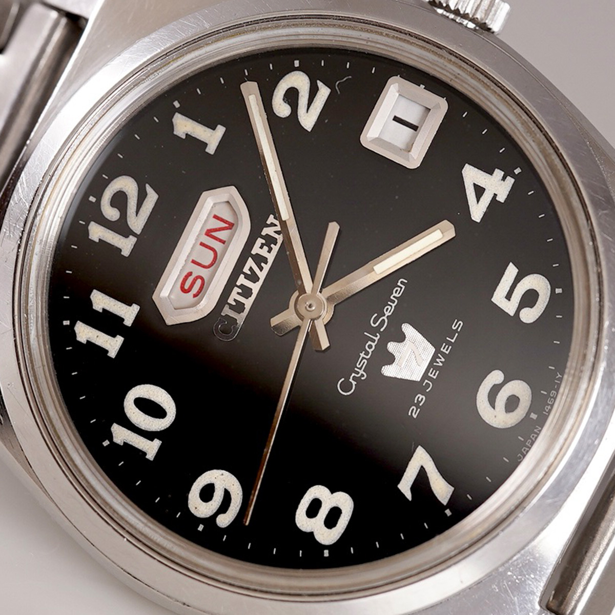 1968年製.シチズンのCrystal Sevenになります。 国産初のクリスタルガラス風防を採用し、当時としては世界最高レベルの薄さを実現したデイデイト(日付と曜日)仕様のモデル。 また、当時は完全防水仕様で、裏蓋は気密性の高いスクリューバック仕様(現在は非防水時計になります)。 艶の有る黒文字盤(ブラックミラーダイヤル)に大きめなアラビア数字が配され、視認性に富んでいます。 その見た目からミリタリーテイストを感じる一本。 文字盤は綺麗な状態を保ち、アラビア数字のインデックスと針はバランス良くエイジングが見られ、ヴィンテージ感抜群。 ブレスは同年代のCITIZEN社製.純正ステンレススチール製ブレス付き(腕周り〜20.5cmほどまで対応可能)。 分解掃除を済ませ日差30秒程で稼働しております。 | |