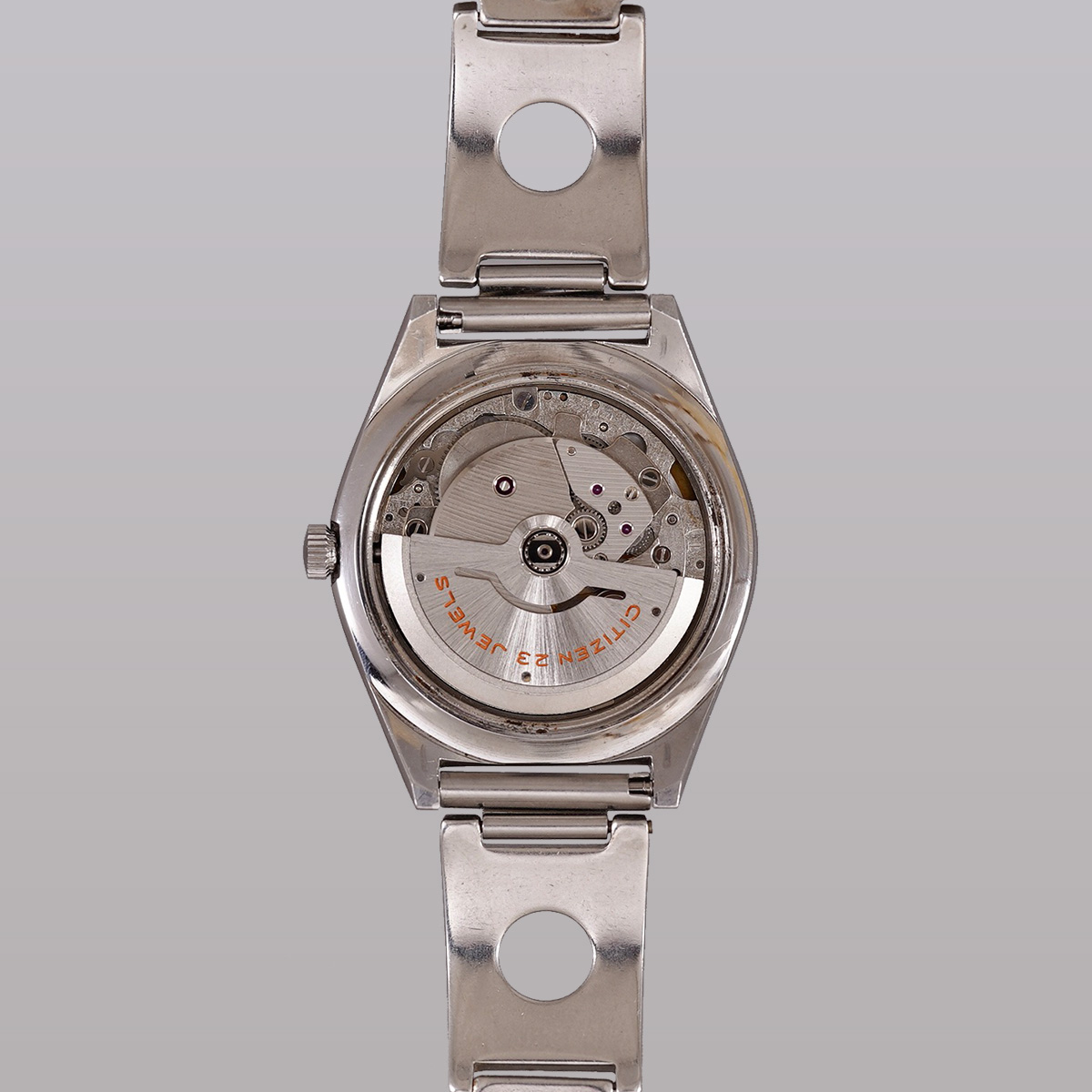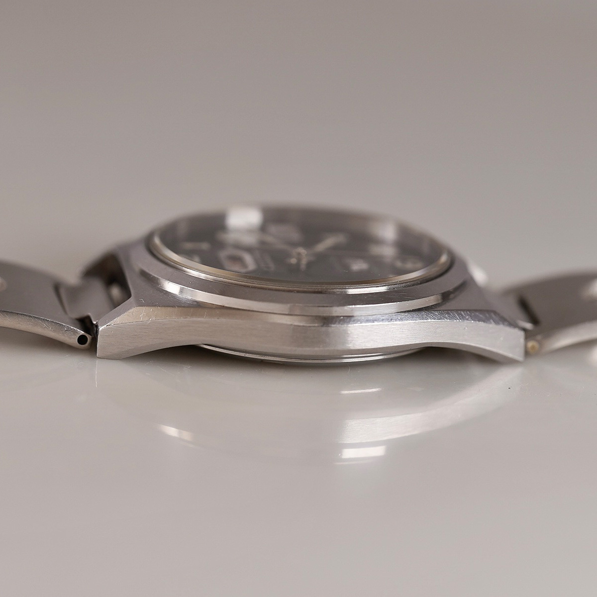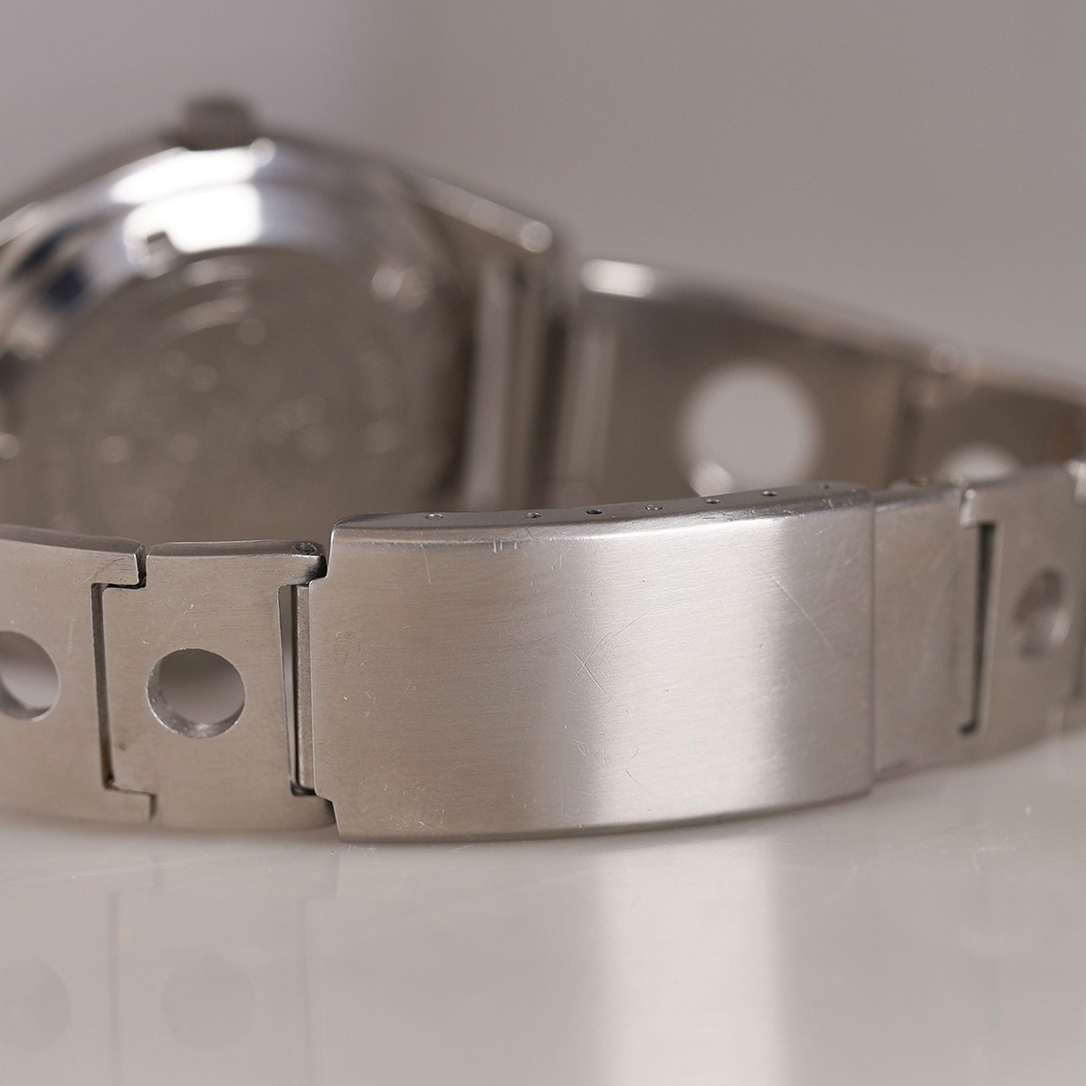 1968年製.シチズンのCrystal Sevenになります。 国産初のクリスタルガラス風防を採用し、当時としては世界最高レベルの薄さを実現したデイデイト(日付と曜日)仕様のモデル。 また、当時は完全防水仕様で、裏蓋は気密性の高いスクリューバック仕様(現在は非防水時計になります)。 艶の有る黒文字盤(ブラックミラーダイヤル)に大きめなアラビア数字が配され、視認性に富んでいます。 その見た目からミリタリーテイストを感じる一本。 文字盤は綺麗な状態を保ち、アラビア数字のインデックスと針はバランス良くエイジングが見られ、ヴィンテージ感抜群。 ブレスは同年代のCITIZEN社製.純正ステンレススチール製ブレス付き(腕周り〜20.5cmほどまで対応可能)。 分解掃除を済ませ日差30秒程で稼働しております。 | |