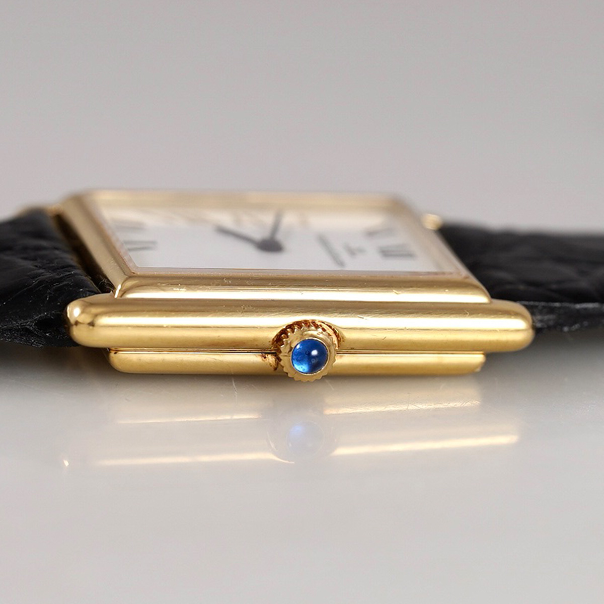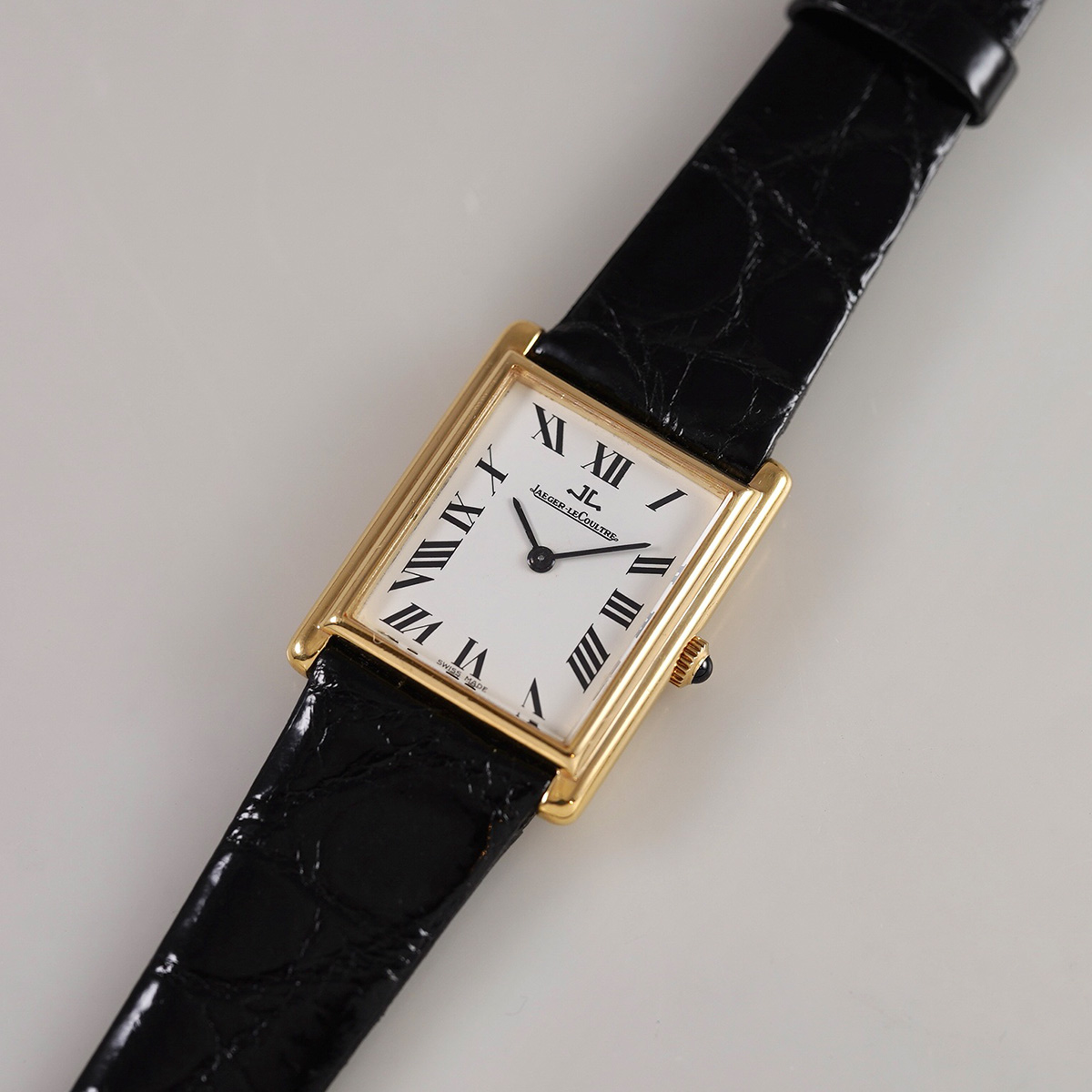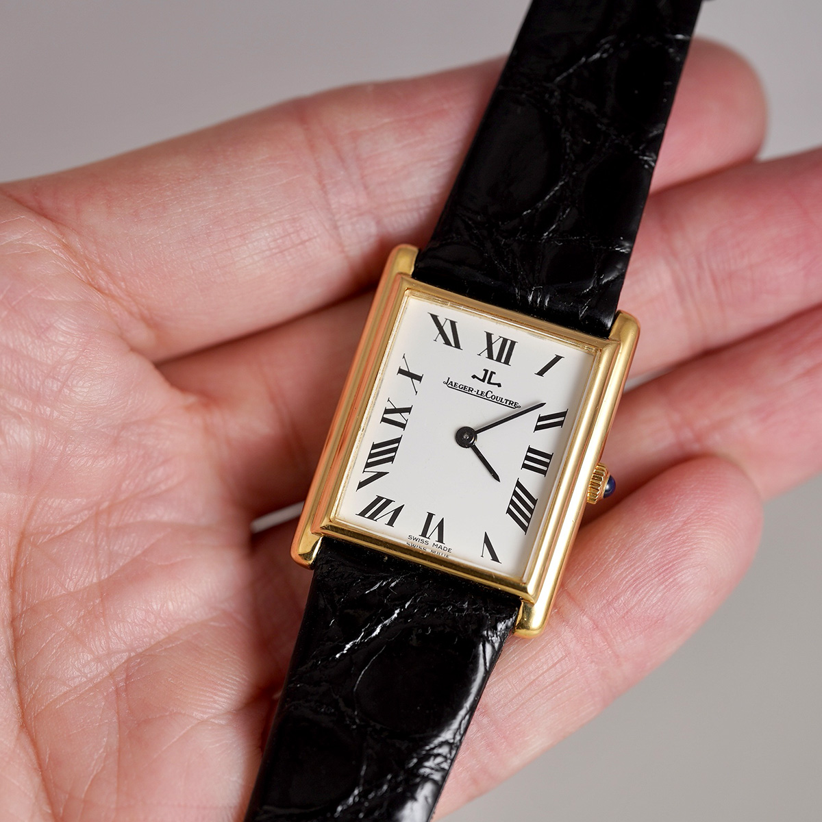 ジャガールクルトから1970年代製.K18YG(18金無垢)の Ref.6129.21です。 ケース形状から、タンク(TANK)の愛称で呼ばれているようです。 タンクと言うとカルティエが代表ですが、カルティエのタンクのLMサイズと比較すると、こちらのジャガールクルトの方がやや大きく、さらに薄さもちょうど良く、装着感に優れたモデルかと思います。 同モデルは金色の文字盤が多く出回っており、この個体のような白文字盤+ローマン数字の組み合わせは希少性が高いと思います。 名門時計ブランドのジャガールクルト社製のK18YG製.タンクは上品さと実用性、そして時計好きな方からも賞賛される一本ではないでしょうか。 文字盤、針は綺麗な状態を保っています。 外装は目立つような傷はなく、過去に部分的に仕上げが施されているとは思いますが、もちろんオリジナルのシェイプを保っています。 Mimosa社の黒色革ベルトをセレクト。 GF製.ジャガールクルト純正尾錠付き。分解掃除を済ませ日差15秒程で稼働しております。 | |