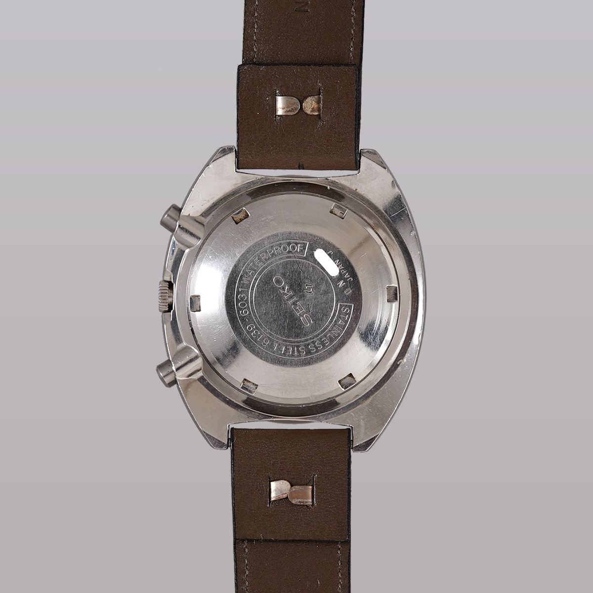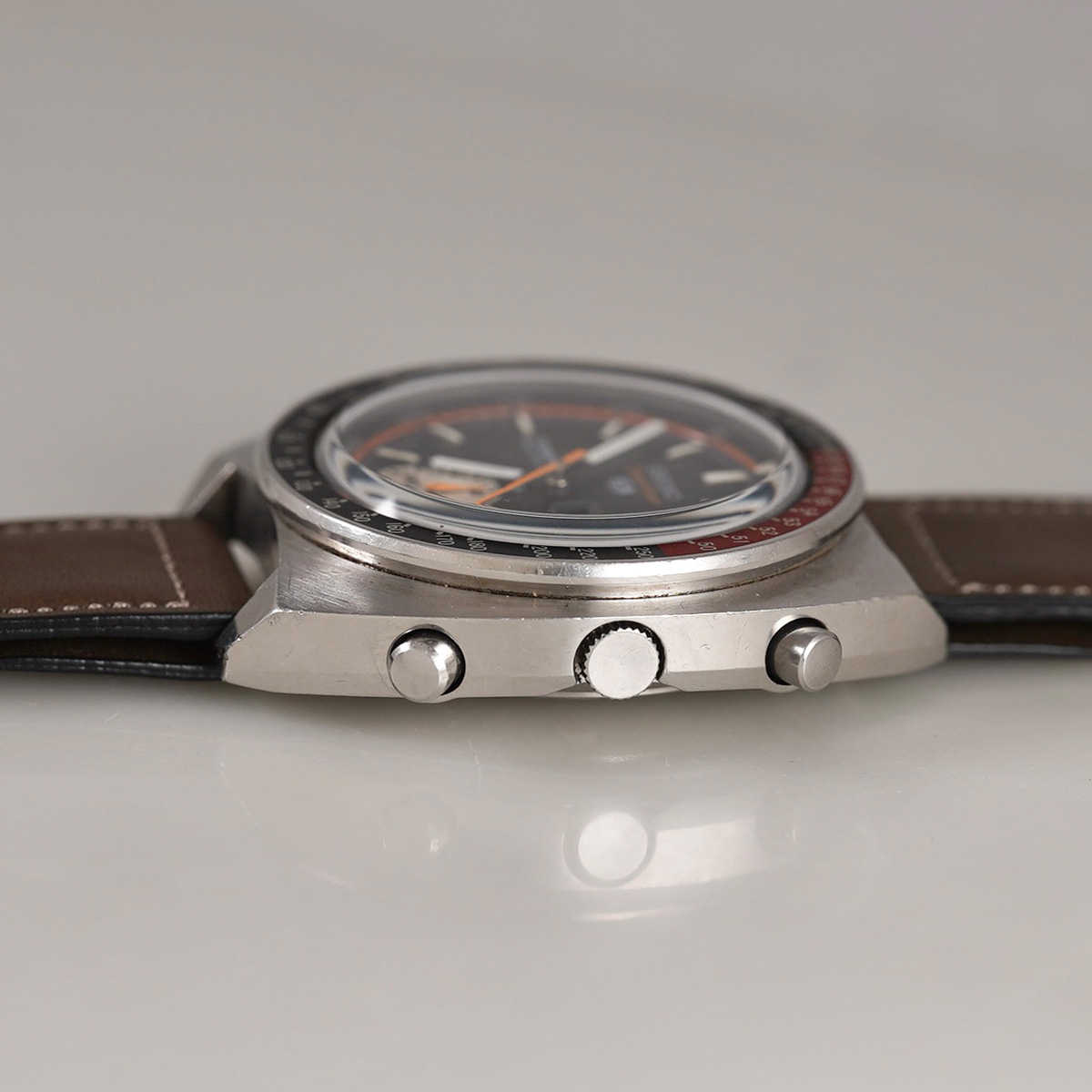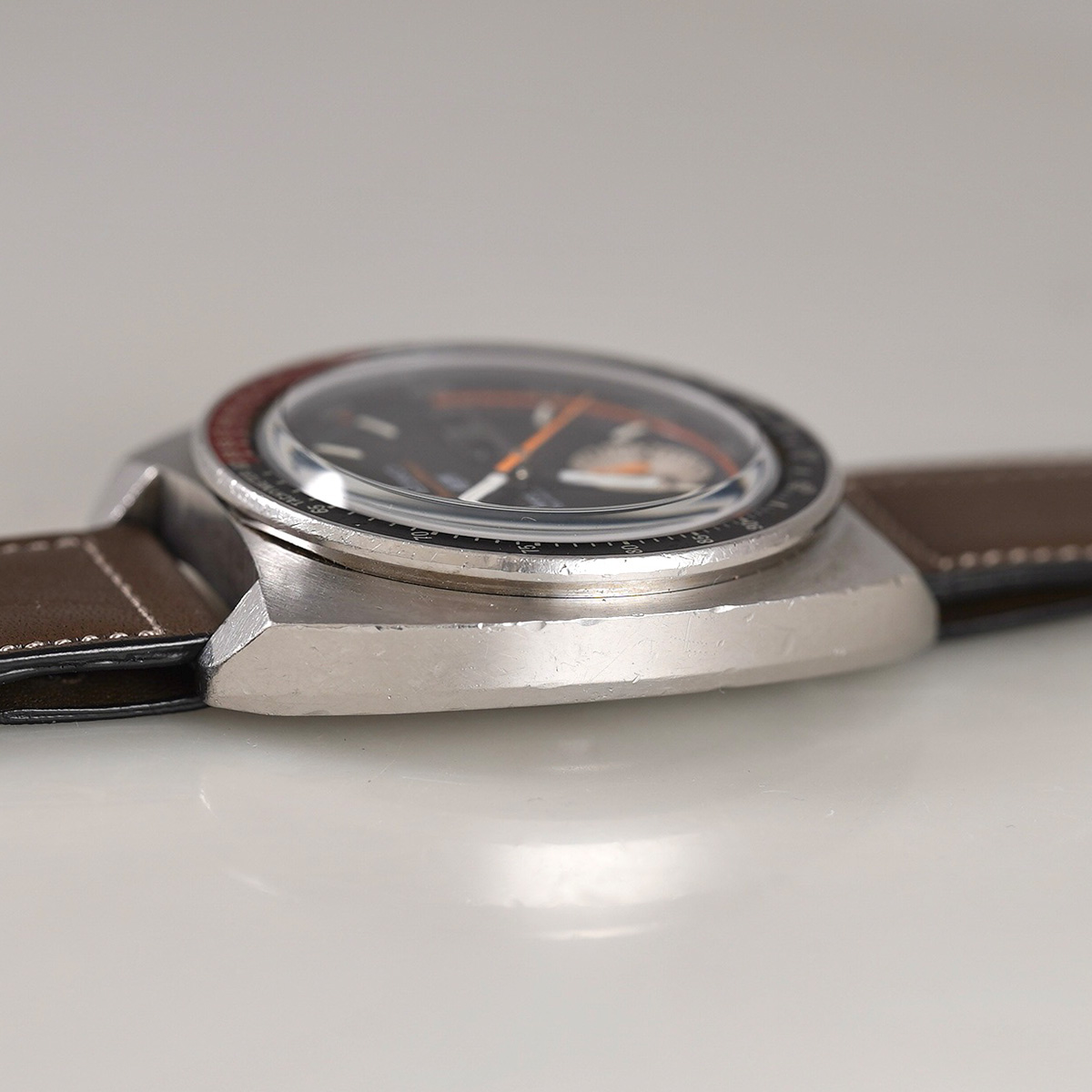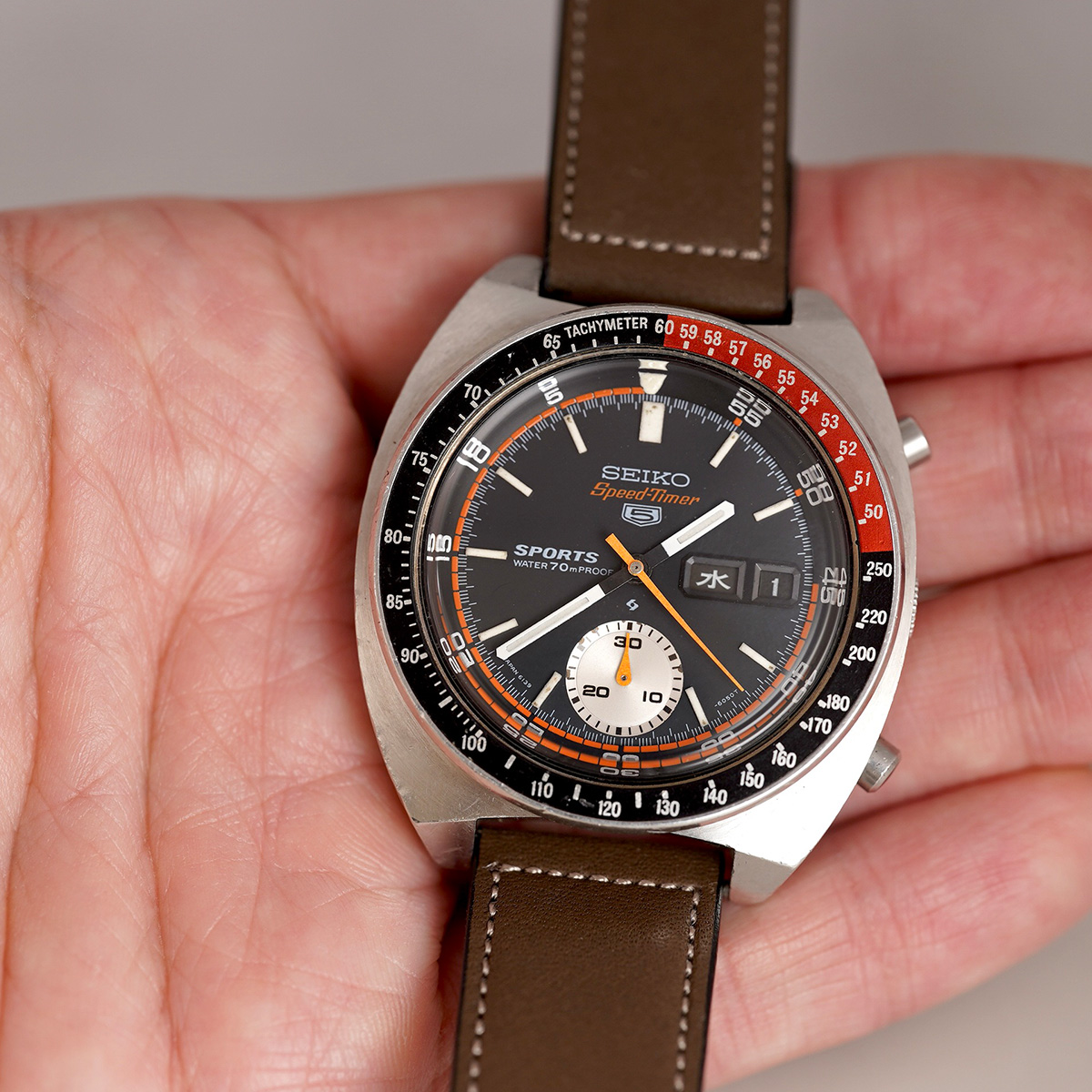 1970年製.SEIKO(セイコー)社の自動巻クロノグラフである「Cal.6139B」を搭載した5スポーツ・スピードタイマー。 サイズ感のあるトノー型ケースにコーラ(Coca-Cola)カラーの赤黒ベゼルが装備された人気モデル。 トータルデザインがカッコ良く、魅力的で、6時位置にインダイヤルが一つだけ備わっていることから「1ツ目クロノ」や「シングルクロノ」と呼ばれています。 積算計にいくつか小さなスポットが見られますが、全体的には良好なコンディションを保っています。 インナーベゼルも問題無く可動します。 外装には小傷等ありますが、過度な傷取り磨きは無く、痛みやすいベゼルにも目立つような剥がれや打痕は無いです。 裏蓋の刻印もしっかりと読み取れる状態です。 曜日カレンダーは国内仕様で日本語と英語表記が採用されており、リューズを浅く押し込むと日付の早送り、奥まで押し込むと日付と曜日を同時に送る機能を装備。 元々手巻き機能は付いておらず、通常の状態でリューズを回すとインナーベゼルが回転します。 アキュレイトフォルムの革ベルトをセレクト。 分解掃除を済ませ日差20秒程で稼働しております。 ※弊社の販売品は、自然故障につき12ヶ月の保証をつけて販売しておりますので、ご安心してご利用いただけます。 | |