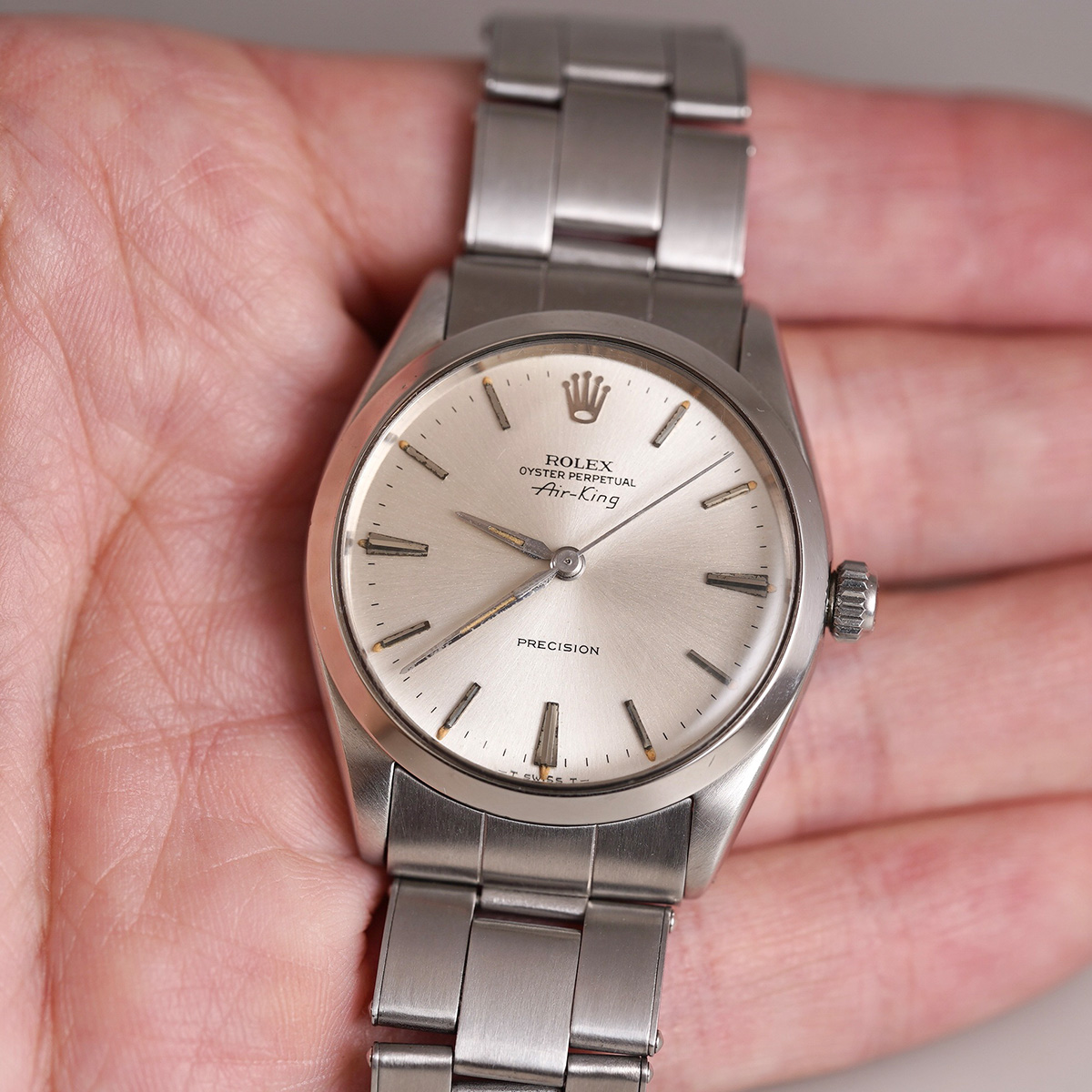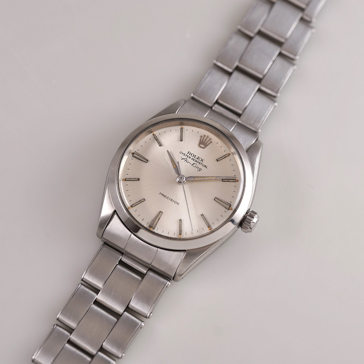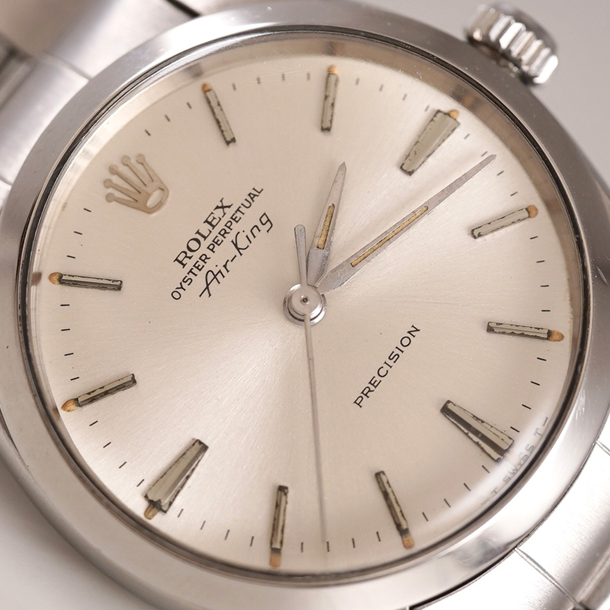 ヴィンテージ.ロレックスの自動巻モデルの中でも、人気の高いRef.5500のエアキング。 オリジナルシルバーダイヤル+先の尖ったアルファ針仕様。 1958年頃にこの品番(Ref.5500)が誕生し、その初期の方でのみ採用されていたディテールになります。 オリジナルの文字盤はサンレイ仕上げになり、程良いエイジングが見られ、ヴィンテージ感ある一本。 シンプルな定番モデルならではの使いやすさは、老若男女問わず、オンオフ問わず全てのスタイルにマッチする優れもの。 エントリーモデルとしてはもちろん、セカンドモデルとしてもおすすめのモデルです。 人気の所以が分かります。 小傷はありますが、伸びの少ないFF57 ロレックス純正の通称「リベットブレス」3連ブレスを装着(腕周り 〜17.5cmほどまで装着可能:66年2期)、年式の整合性も取れています。 長さが割と細めなのでその分、価格に反映させていただいております。(※ブレスコマ足し別途で対応可能の場合もございます) 分解掃除を済ませ日差10秒程で稼働しております。 ※弊社の販売品は、自然故障につき12ヶ月の保証をつけて販売しておりますので、ご安心してご利用いただけます。 | |
