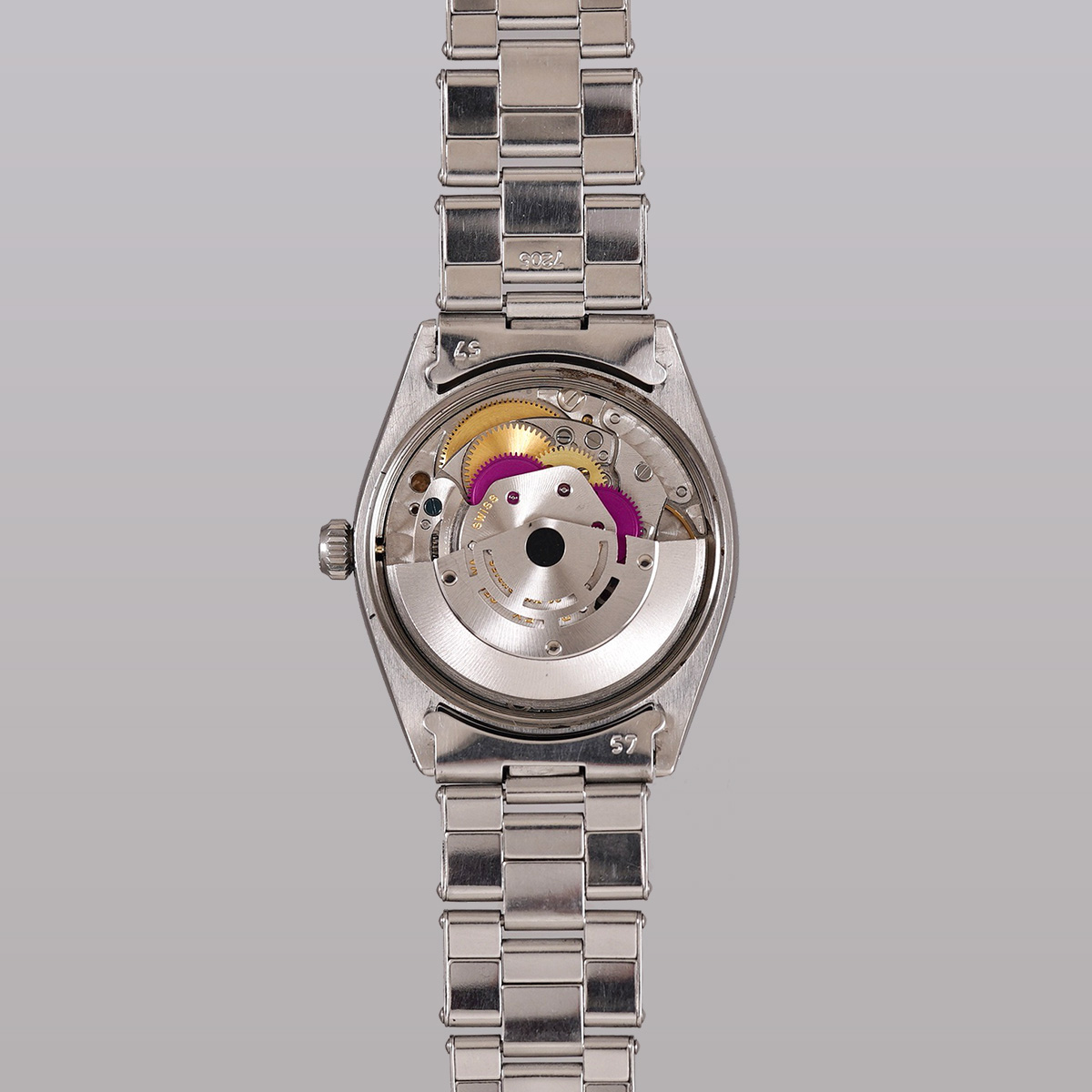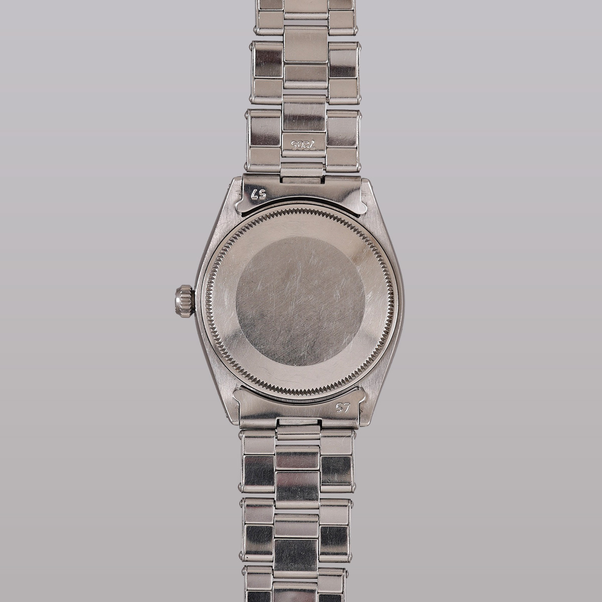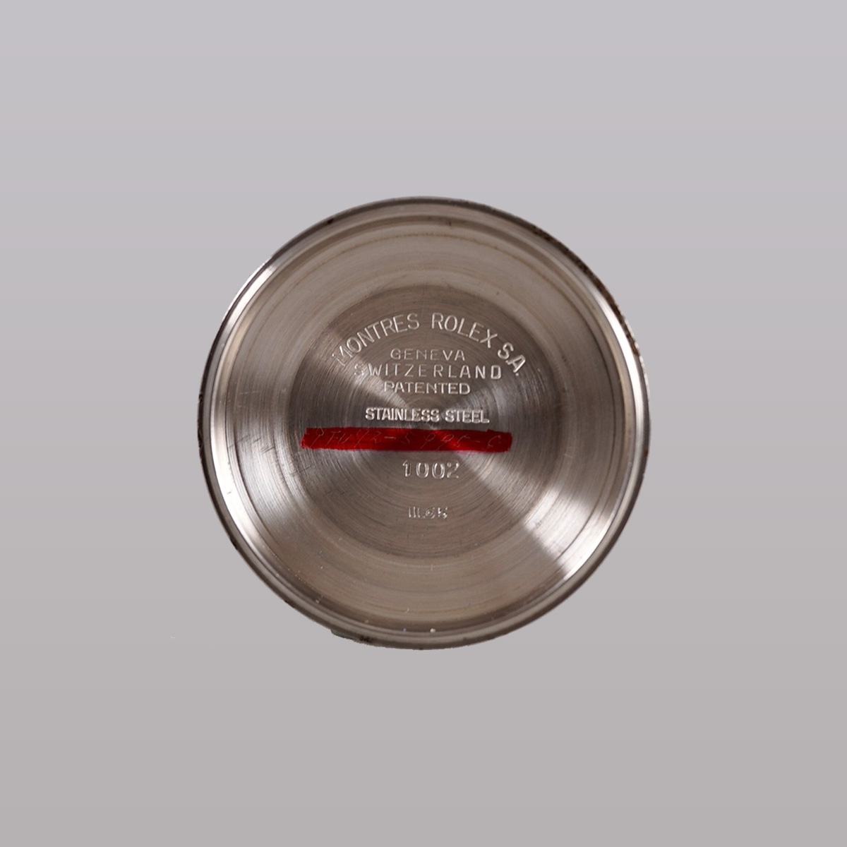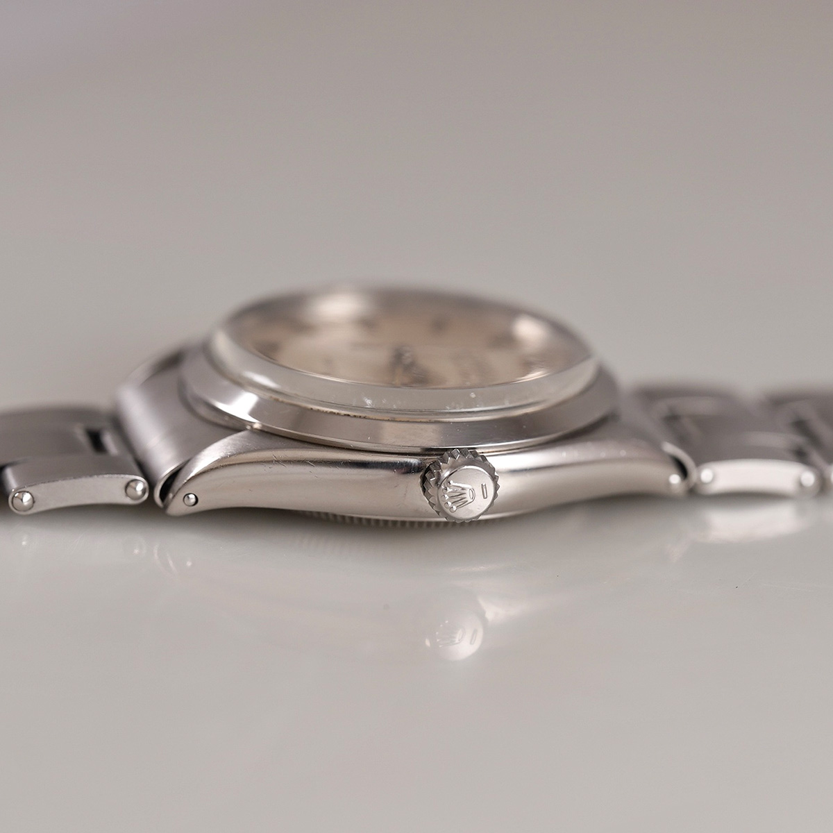ヴィンテージ.ロレックスの自動巻モデルの中でも、人気の高いRef.5500のエアキング。 オリジナルシルバーダイヤル+先の尖ったアルファ針仕様。 1958年頃にこの品番(Ref.5500)が誕生し、その初期の方でのみ採用されていたディテールになります。 オリジナルの文字盤はサンレイ仕上げになり、程良いエイジングが見られ、ヴィンテージ感ある一本。 シンプルな定番モデルならではの使いやすさは、老若男女問わず、オンオフ問わず全てのスタイルにマッチする優れもの。 エントリーモデルとしてはもちろん、セカンドモデルとしてもおすすめのモデルです。 人気の所以が分かります。 小傷はありますが、伸びの少ないFF57 ロレックス純正の通称「リベットブレス」3連ブレスを装着(腕周り 〜17.5cmほどまで装着可能:66年2期)、年式の整合性も取れています。 長さが割と細めなのでその分、価格に反映させていただいております。(※ブレスコマ足し別途で対応可能の場合もございます) 分解掃除を済ませ日差10秒程で稼働しております。 ※弊社の販売品は、自然故障につき12ヶ月の保証をつけて販売しておりますので、ご安心してご利用いただけます。 | |