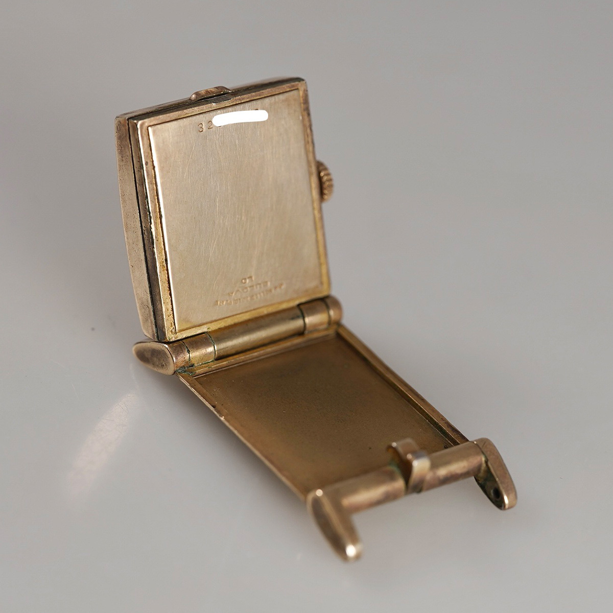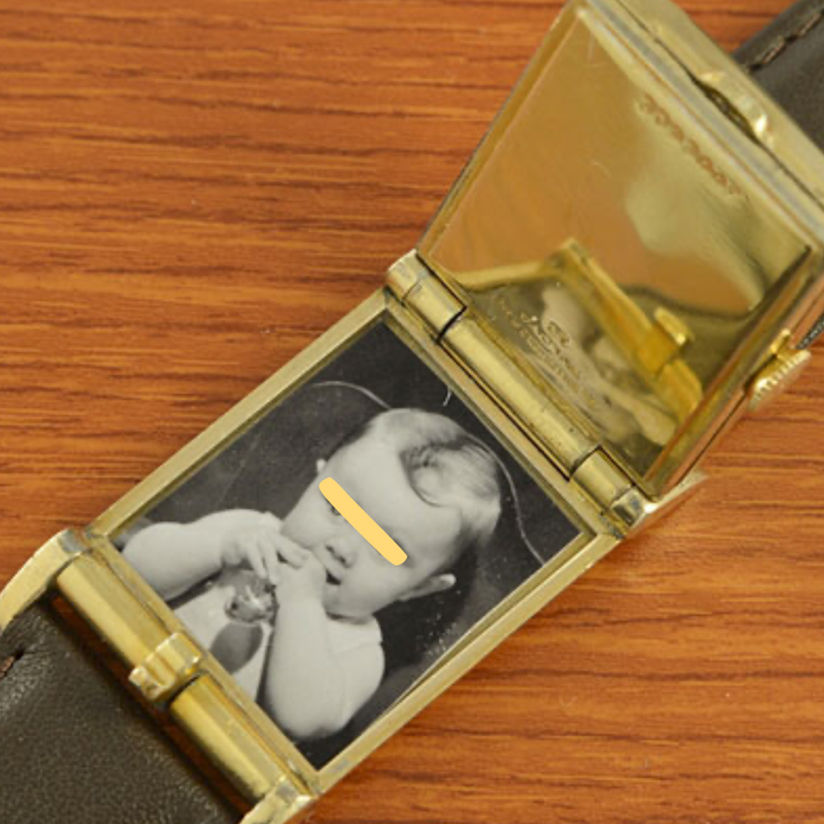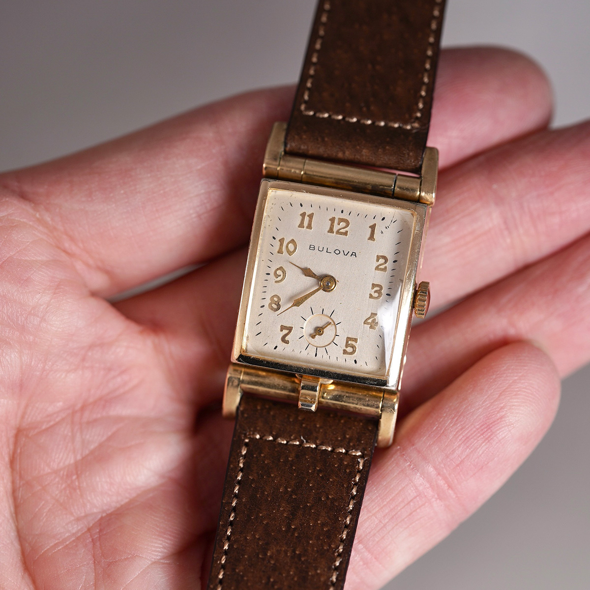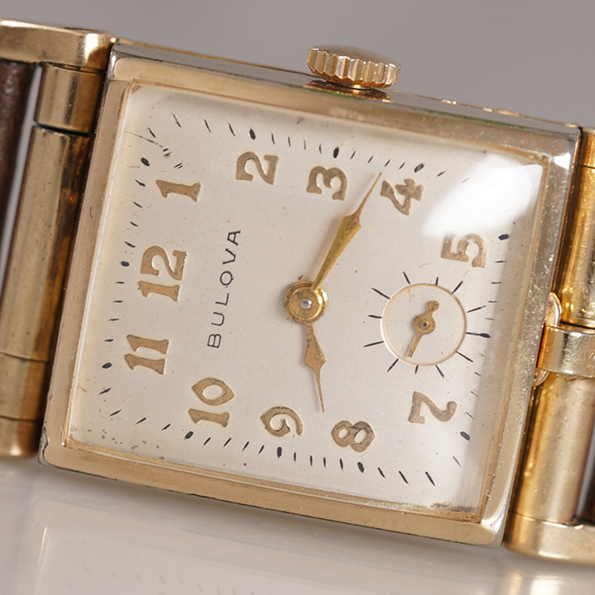 1950年代製.BULOVA(ブローバ)社の「PHOTO WATCH(フォト ウォッチ)」になります。 1940-50年代のアメリカを象徴するようなアルーデコ調.10KGF製.角金モデルになります。 文字盤にはアップライドアラビア数字が配され、長短針のシェイプデザインなど細かいところにこだわりを感じる一本です。 そして、この「PHOTO WATCH(フォト ウォッチ)」とは腕時計に写真を収めるというユニークな発想が一番の特徴。 家族を大切にするアメリカらしい腕時計と言えるのではないでしょうか(使用方法は様々かと)。 全体的に小傷等はありますが、気になるほどの箇所は無いかと思います。 アキュレイトフォルム社の革ベルトをセレクト。 分解掃除を済ませ日差30秒程で稼働しております。 | |