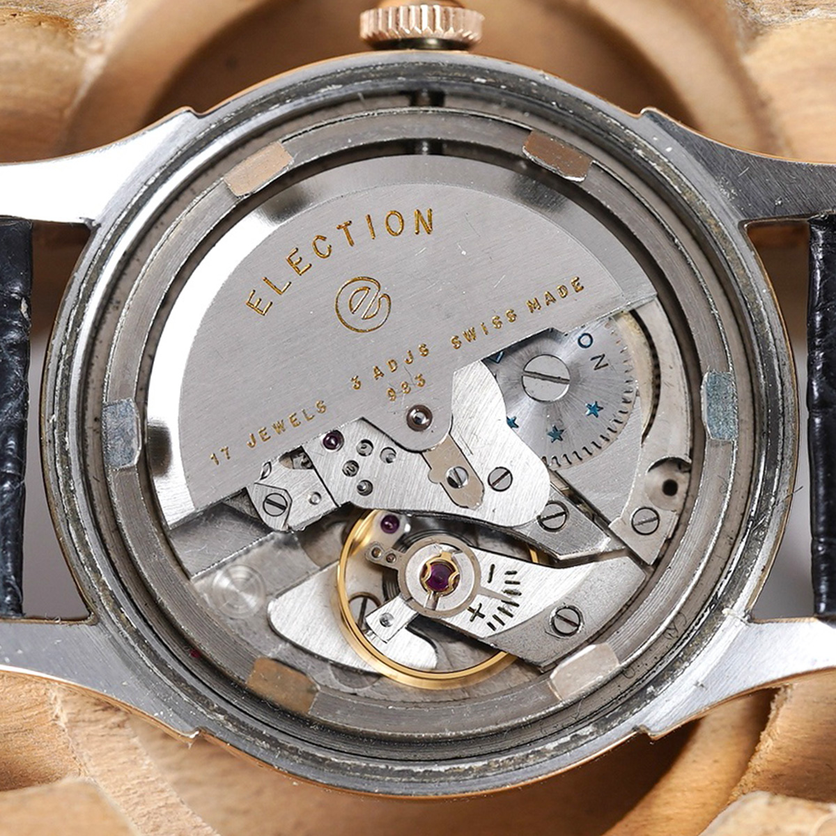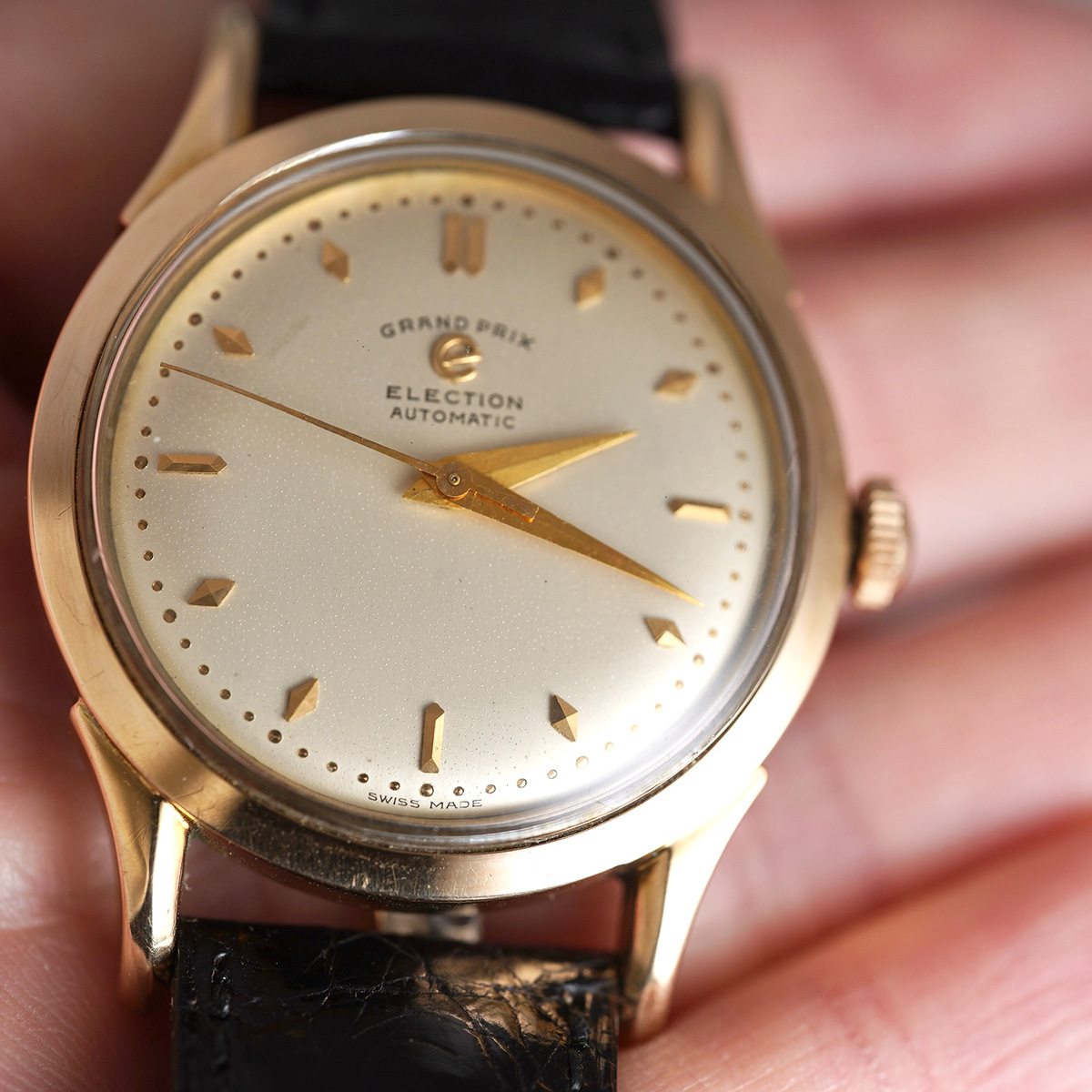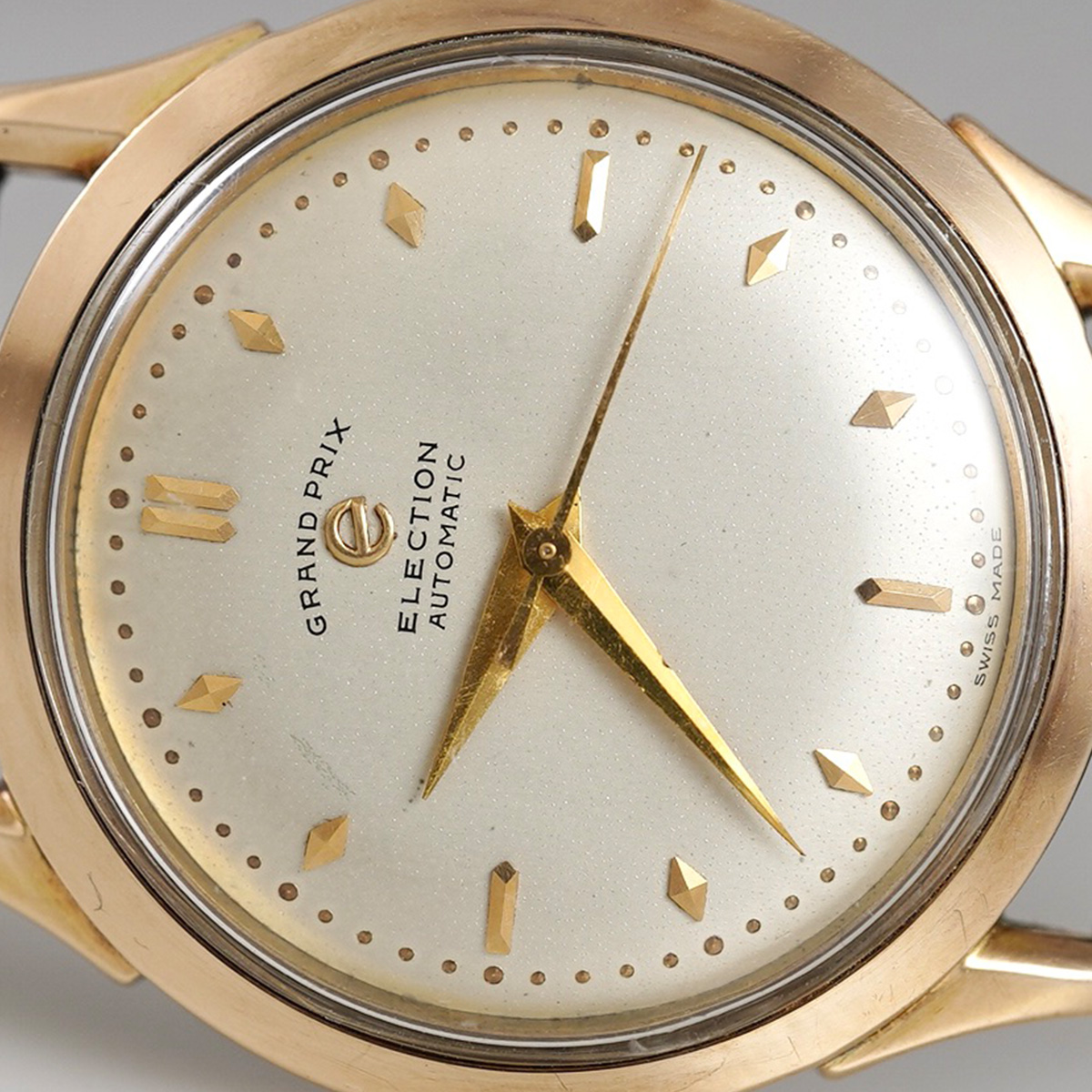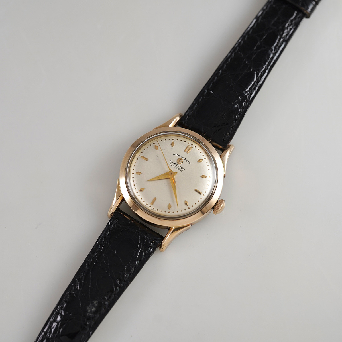 1950年代製.ELECTION「エレクション」社製造の.GRAND PRIXのオフホワイト文字盤。その文字盤にはブランドロゴのアルファベット「e」とモデル名の表記、シンプルな3針モデル。ダイヤモンドカットされたインデクスと砲弾型のインデックス、そしてパールインデックスを使用し、先の尖ったドーフィン針と合わせ、ヴィンテージ感はもちろん、手の込んだその作りに感心させられるディテールです。聞き慣れない社名になりますが、ELECTION社と言えば同年代のマニアックなクロノグラフを思い浮かべます。自社製ムーブメントを採用している歴史と実力のあるメーカーと言えるでしょう。黒い革ベルトをセレクト。分解掃除を済ませ日差20秒程で稼働しております。 | |