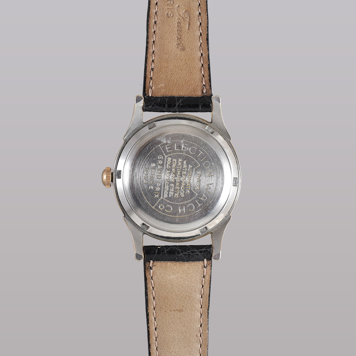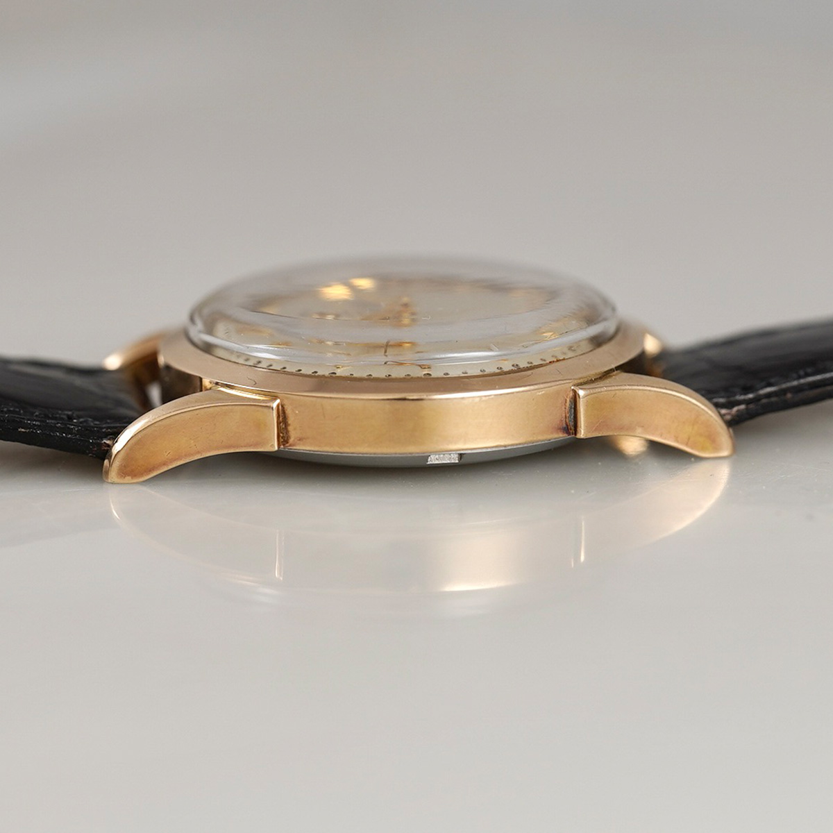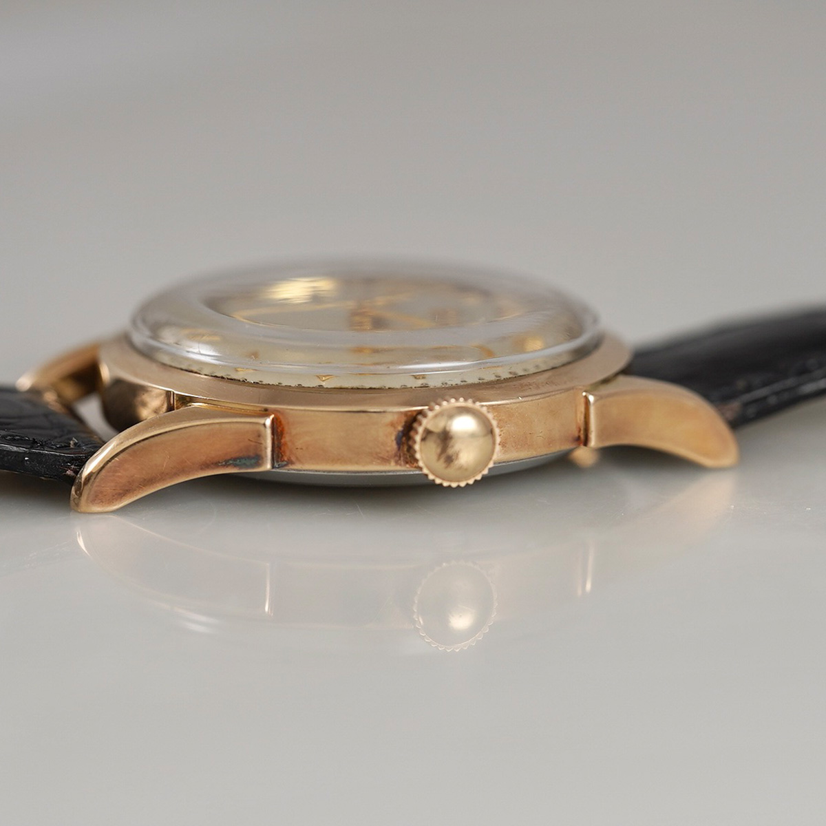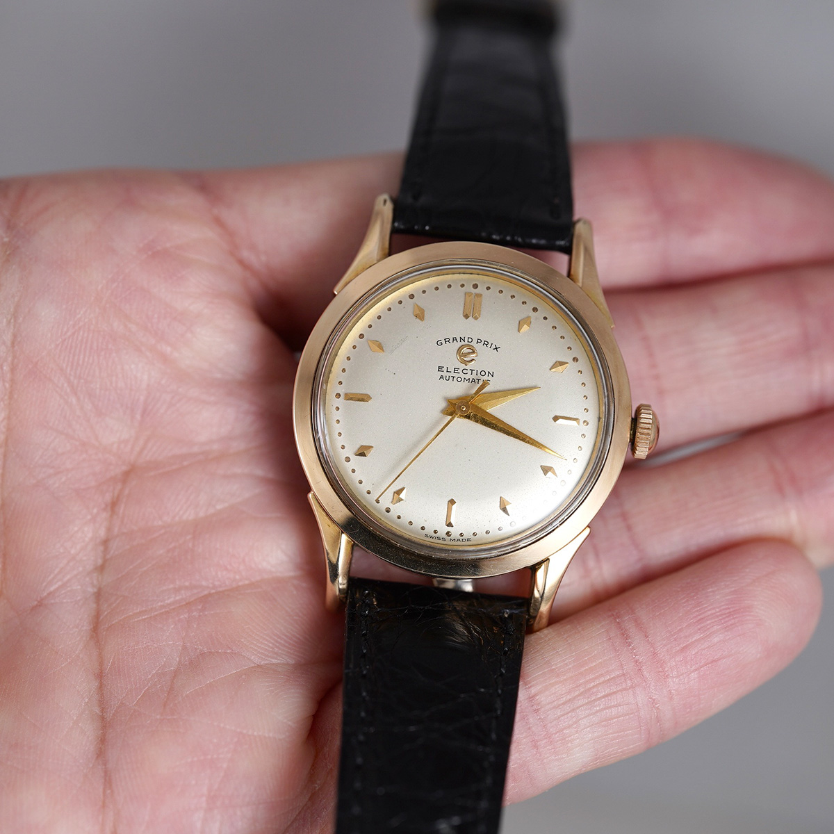 1950年代製.ELECTION「エレクション」社製造の.GRAND PRIXのオフホワイト文字盤。その文字盤にはブランドロゴのアルファベット「e」とモデル名の表記、シンプルな3針モデル。ダイヤモンドカットされたインデクスと砲弾型のインデックス、そしてパールインデックスを使用し、先の尖ったドーフィン針と合わせ、ヴィンテージ感はもちろん、手の込んだその作りに感心させられるディテールです。聞き慣れない社名になりますが、ELECTION社と言えば同年代のマニアックなクロノグラフを思い浮かべます。自社製ムーブメントを採用している歴史と実力のあるメーカーと言えるでしょう。黒い革ベルトをセレクト。分解掃除を済ませ日差20秒程で稼働しております。 | |