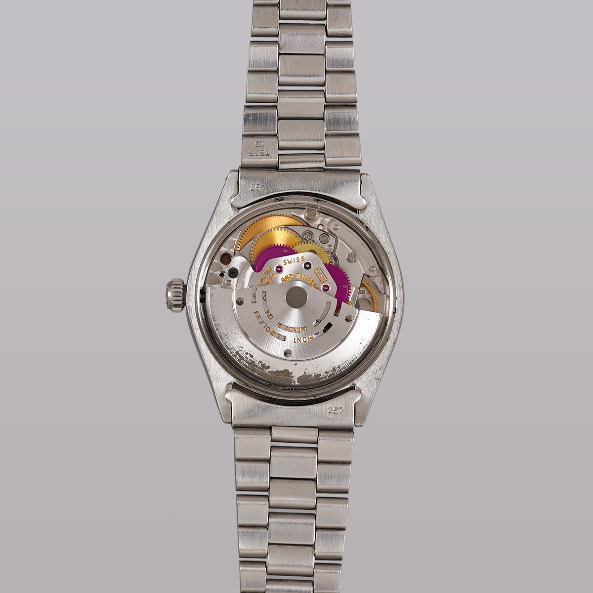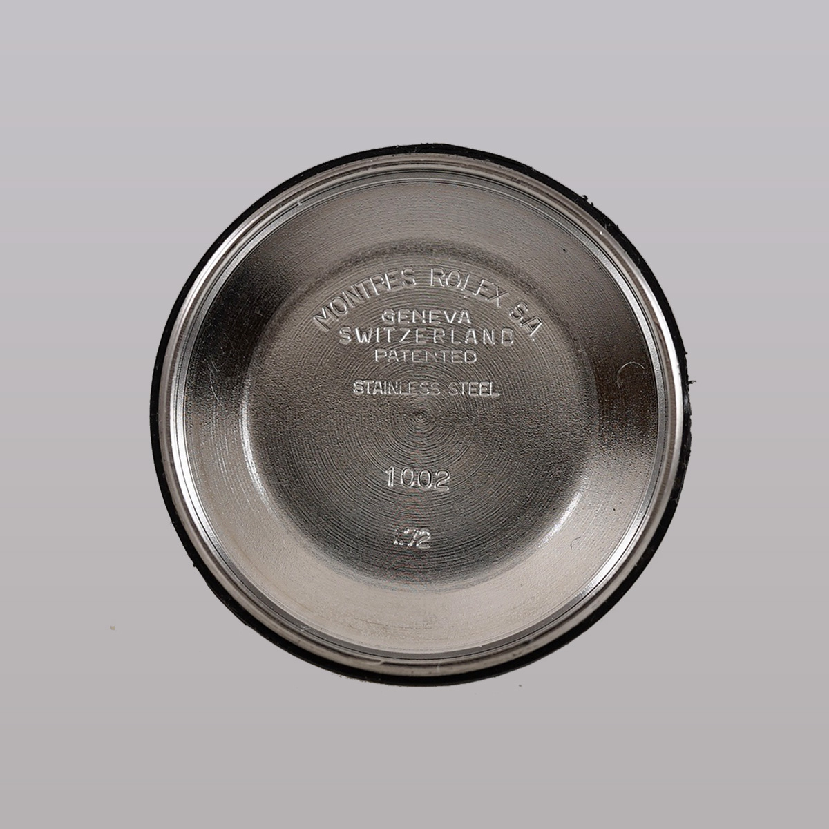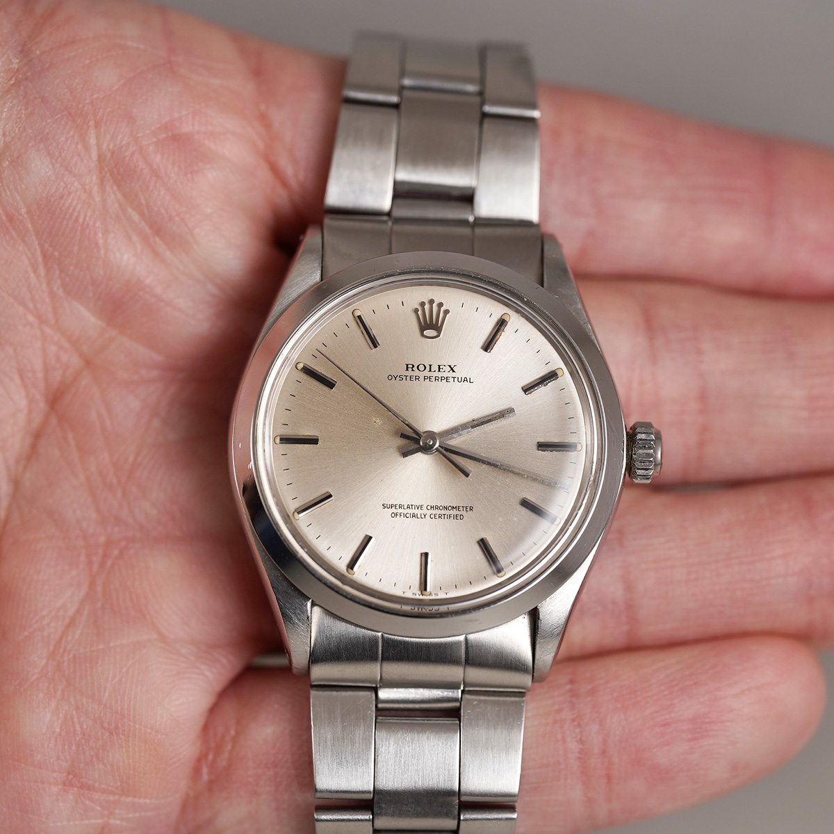 1972年製(裏蓋:I.72)エイジングを魅せるシルバーダイヤルのRef.1002。 日付無し、ドーム風防を装備したパーペチュアル(自動巻)モデル。 サンバースト仕上げのシルバー文字盤がエイジングを見せた個体です。 好き嫌いが分かれますが、ヴィンテージ感ある個性とした一本だと思います! 信頼性の高い自動巻「Cal.1570」を搭載。多少の傷・伸びは見られますが、年式の整合性の取れたロレックス純正 3連 FF357 の巻きブレス(3連ブレス)が付き、フル13コマ:〜20.5cmほどまで装着可能な状態です。 ※文字盤に小さなスポットがありますので、販売価格に反映しております。 分解掃除を済ませ日差10秒程で稼働しております。 | |