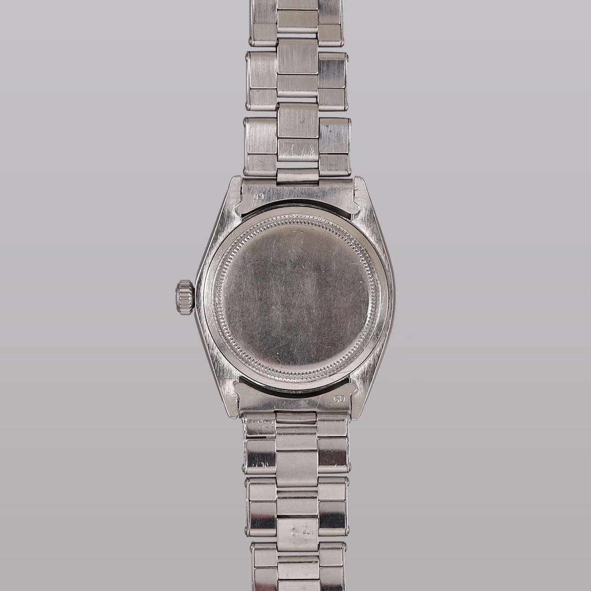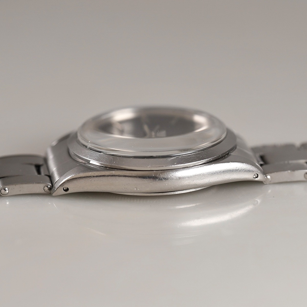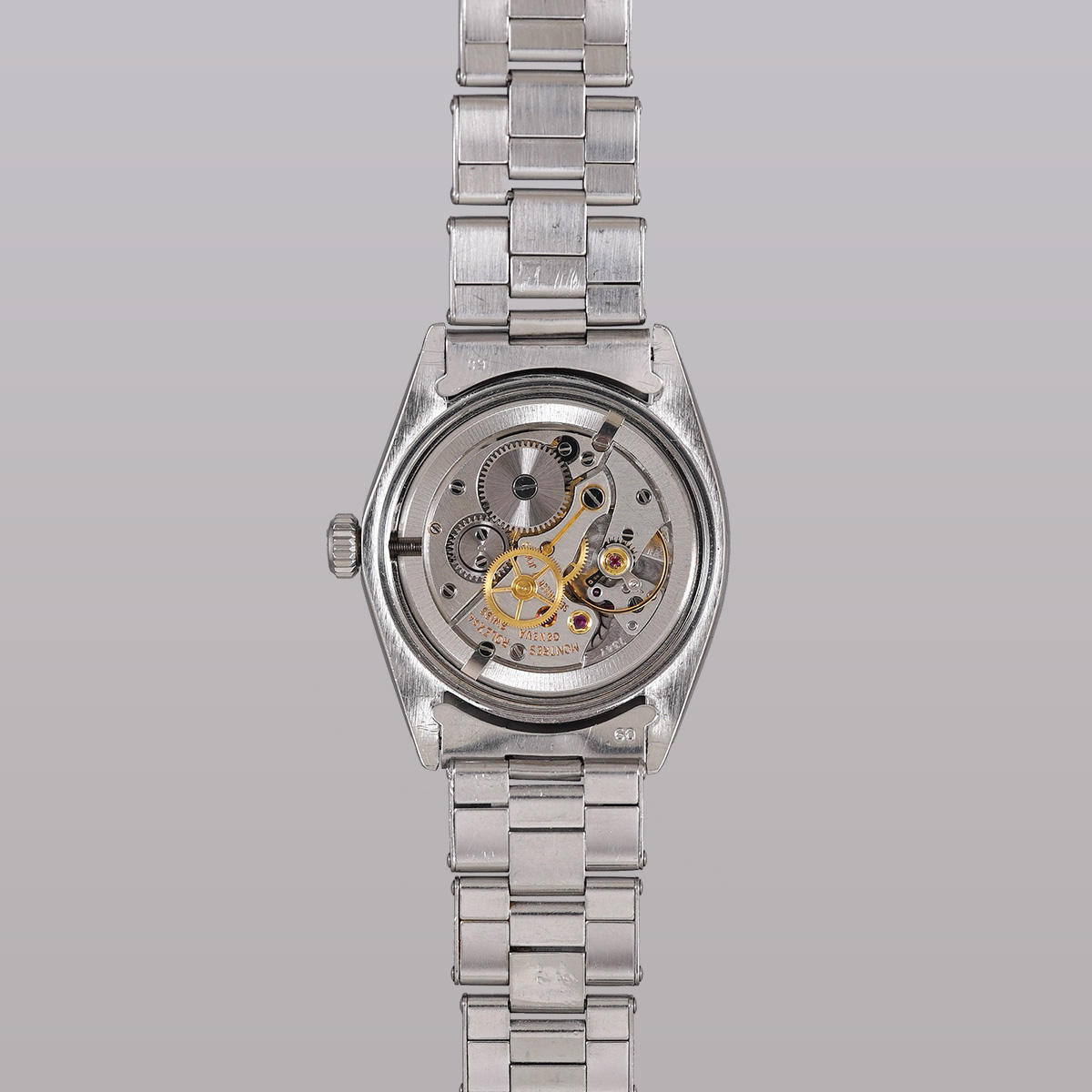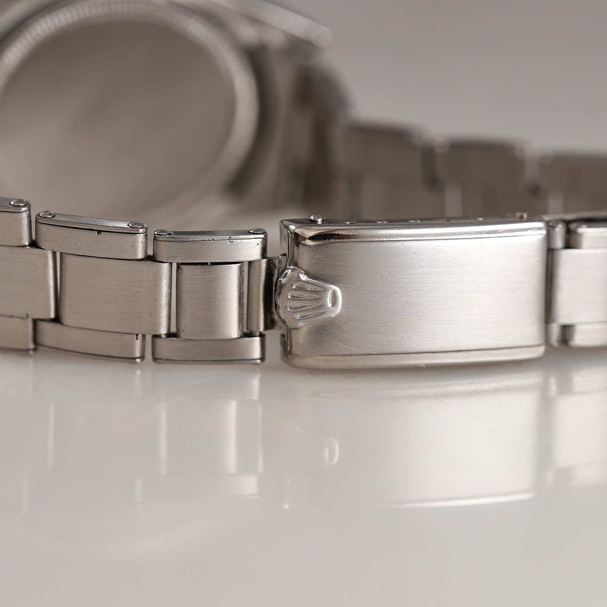 ロレックスのスタンダードモデル、オイスター.Ref.6426。 オリジナルの艶有り黒文字盤(ブラックダイヤル)になります。 1969年製造(裏蓋刻印/I.69)の日付無し(ノンデイトモデル)。 1950年代から1980年代後半までの長い期間製造されていたロレックスを代表するロングセラーモデル。 こちらの個体は人気の高いオリジナルの艶有り黒文字盤になり、雰囲気の良い一本です。 年々、オリジナルの色付き文字盤は人気が高いのですが、市場からは減ってきていますので、レアになってきています。 落ち着いた色味なので、どんなシーンにもマッチする優れもの。 傷みやすい文字盤には、少々エイジングが見られますが、十分な艶感を感じられるヴィンテージ感◎ 手巻きならではの腕乗りの良さと、このケース径は、男性でも、そして女性でも愛用出来得るサイズ感のモデルになります。 信頼性の高い手巻き「Cal.1225」を搭載。 外装は小傷はありますが、コンディションが良く、合わせて状態の良いロレックス純正.リベット3連ブレスは、FF60 / 12コマ:〜19.5cmほどまで装着可能な状態です。分解掃除を済ませ日差10秒程で稼働しております。 | |