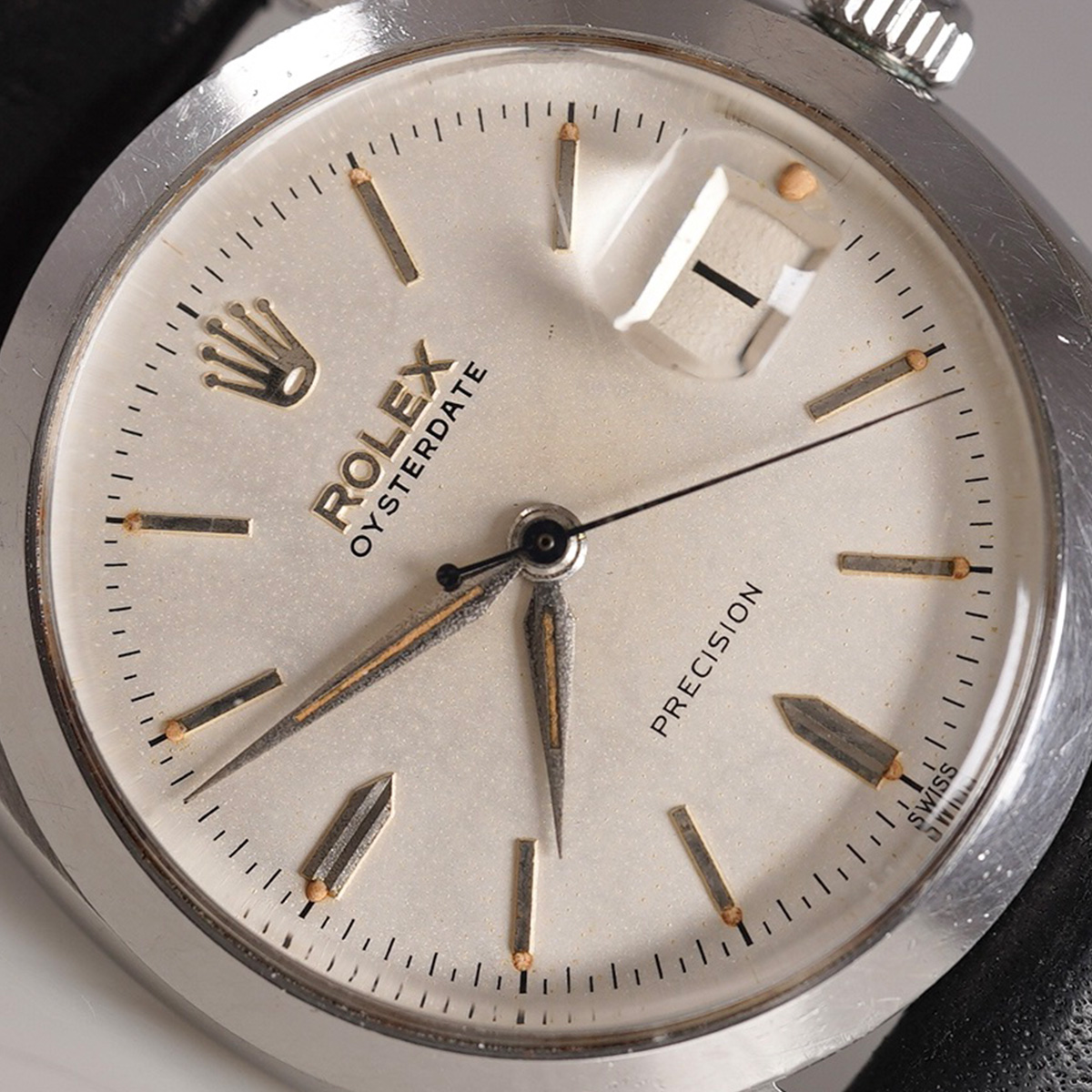 | Model | オイスターデイト アルファ針 ブルースチール ホワイト文字盤 Ref.6494 アップライドロゴ 1950年代製 手巻き |