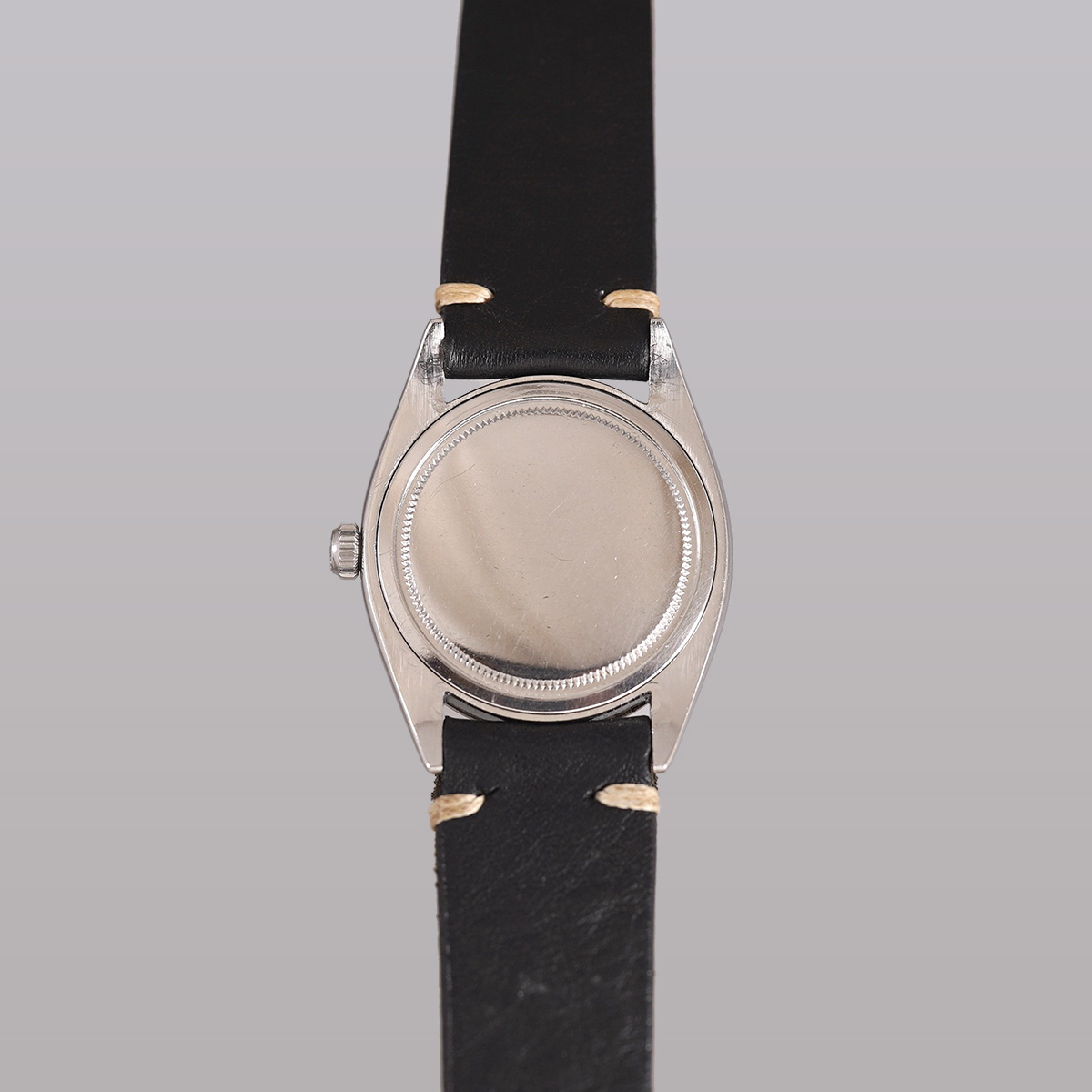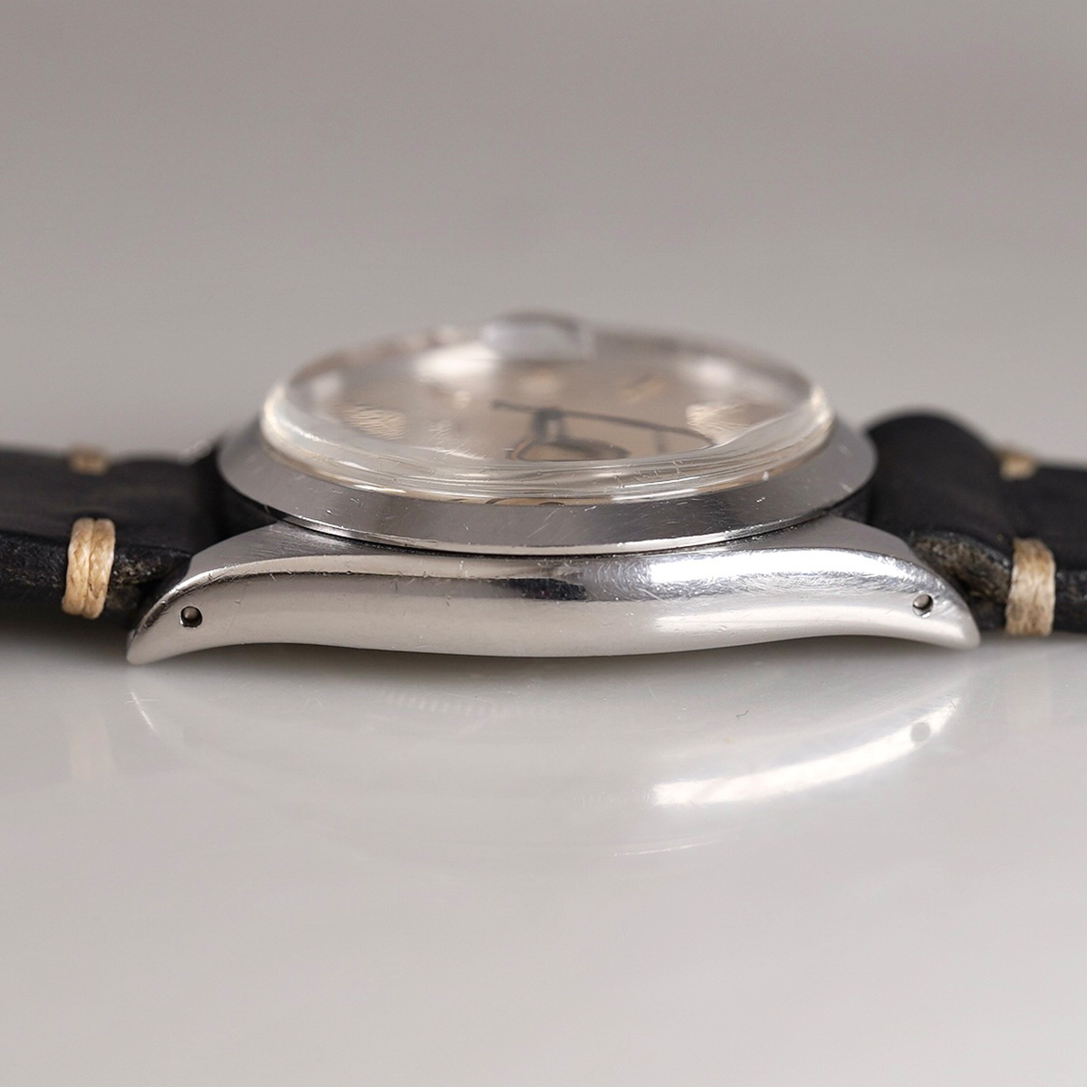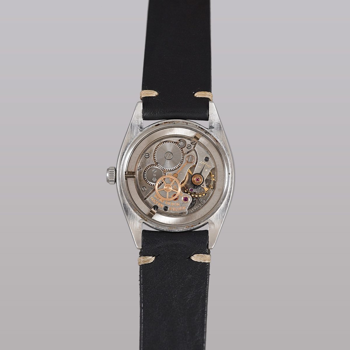 1959年製造(裏蓋I.59)のRef.6494 になります。長短針は先の尖ったアルファ針となり、秒針は青焼き(ブルースチール)になります。 文字盤はシルバーとは異なり、オフホワイトベースが経年変化によりエイジングを感じる表情。 アワーマーカーインデックスは細めのバータイプですが、6・9時位置は砲弾型インデックスを配しています。12時位置の王冠マークや浮き上がったブランドロゴは、この年式ならではになり、ヴィンテージロレックス(1950年代頃)の特徴が詰まった一本です。外装に小傷等ありますが、過度にポリッシュはされていない為、ケースは当時のオリジナルのフォルムを保って、しっかりとしています。ヴィンテージライクな革ベルトをセレクト。分解掃除を済ませ日差10秒程で稼働しております。 | |