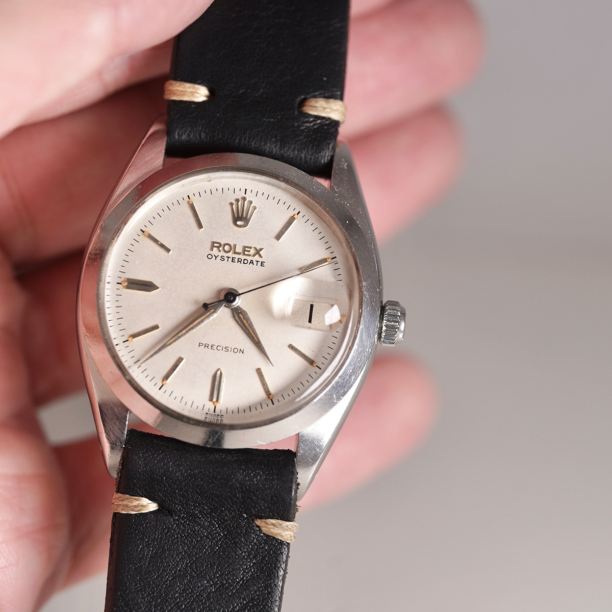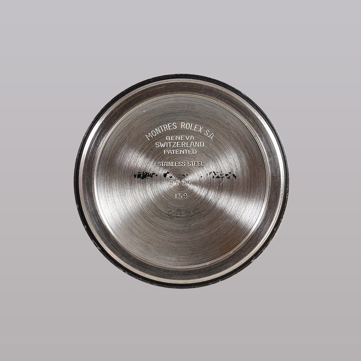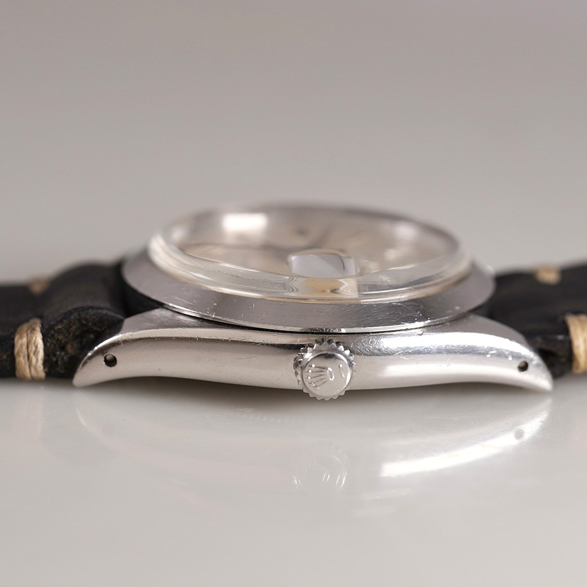 1959年製造(裏蓋I.59)のRef.6494 になります。長短針は先の尖ったアルファ針となり、秒針は青焼き(ブルースチール)になります。 文字盤はシルバーとは異なり、オフホワイトベースが経年変化によりエイジングを感じる表情。 アワーマーカーインデックスは細めのバータイプですが、6・9時位置は砲弾型インデックスを配しています。12時位置の王冠マークや浮き上がったブランドロゴは、この年式ならではになり、ヴィンテージロレックス(1950年代頃)の特徴が詰まった一本です。外装に小傷等ありますが、過度にポリッシュはされていない為、ケースは当時のオリジナルのフォルムを保って、しっかりとしています。ヴィンテージライクな革ベルトをセレクト。分解掃除を済ませ日差10秒程で稼働しております。 | |
