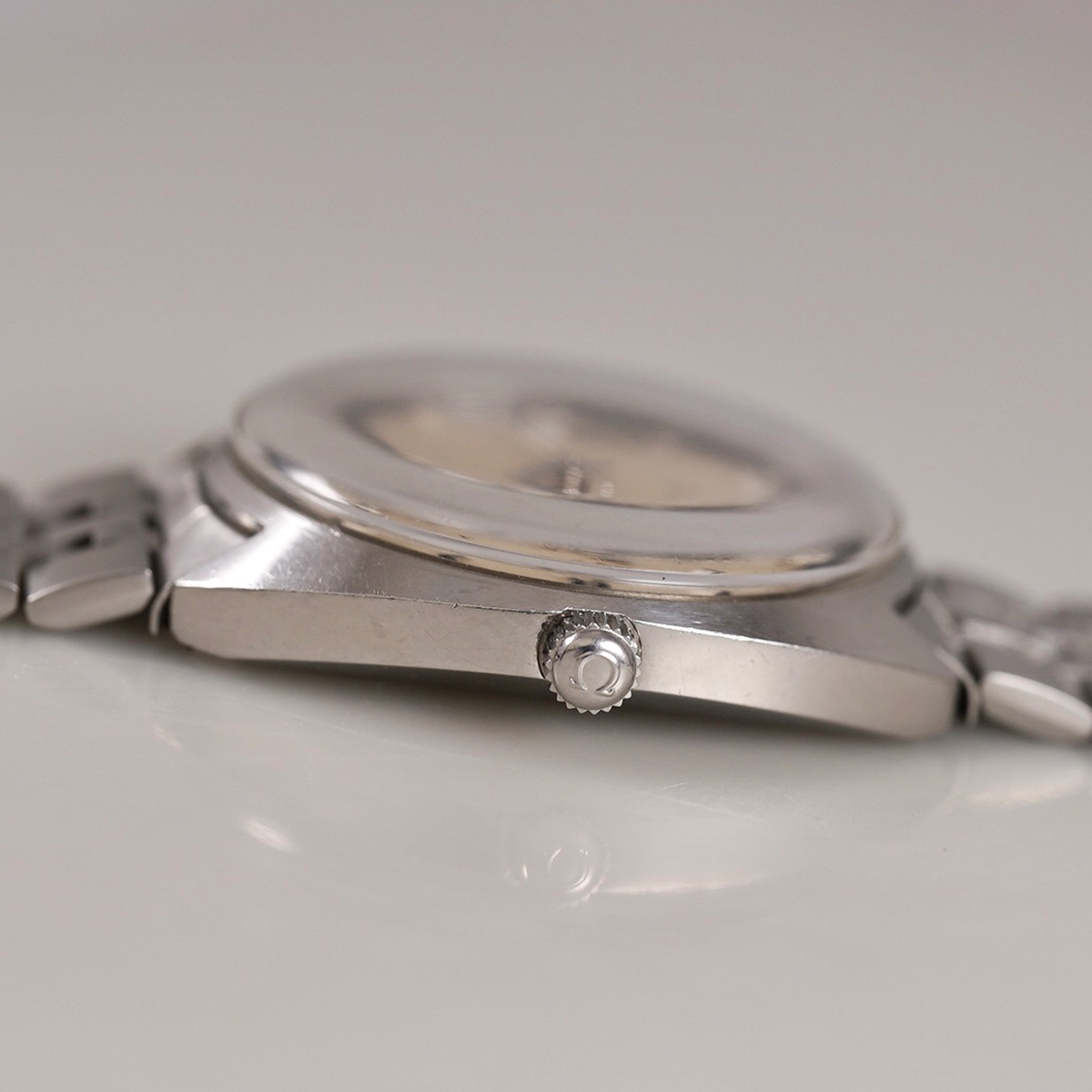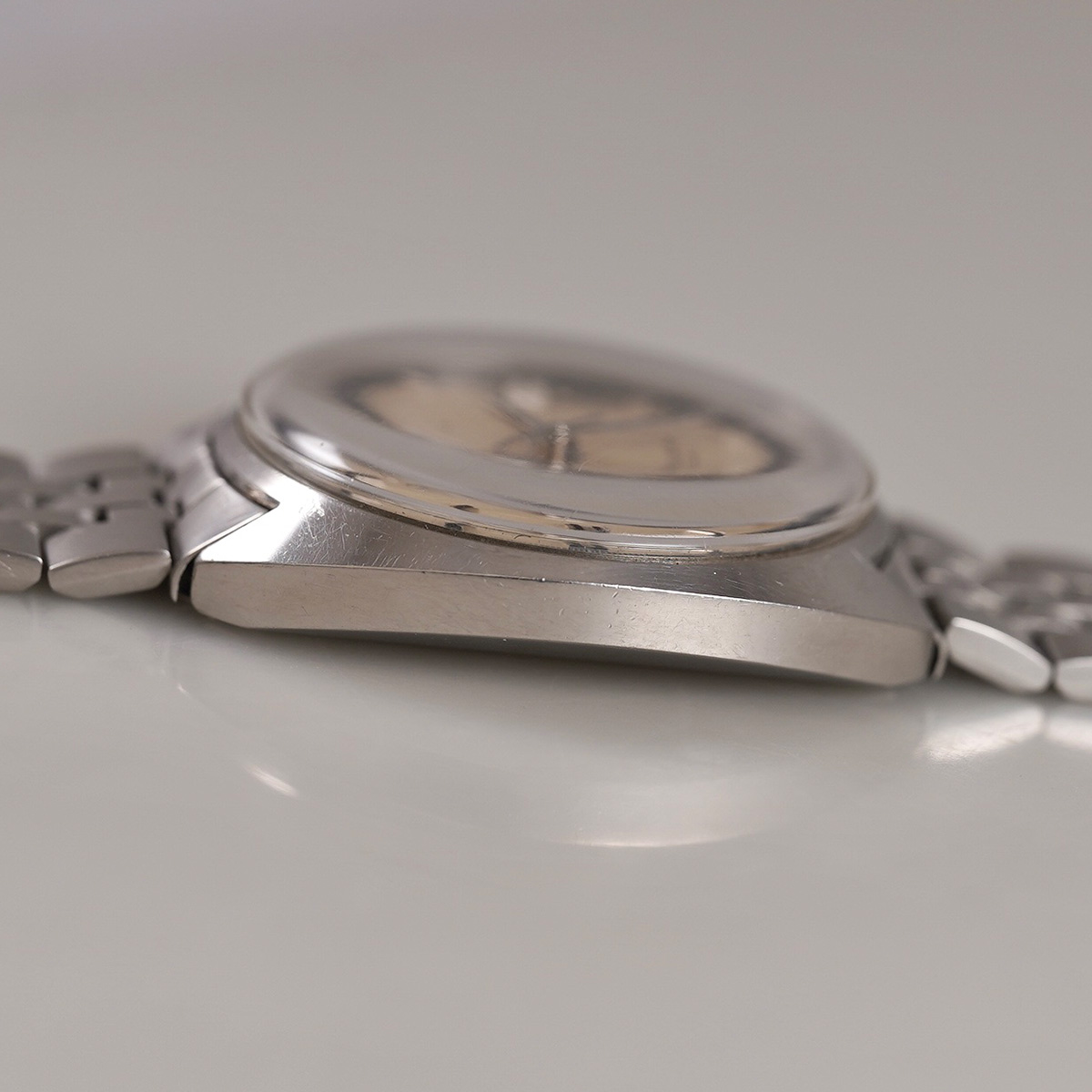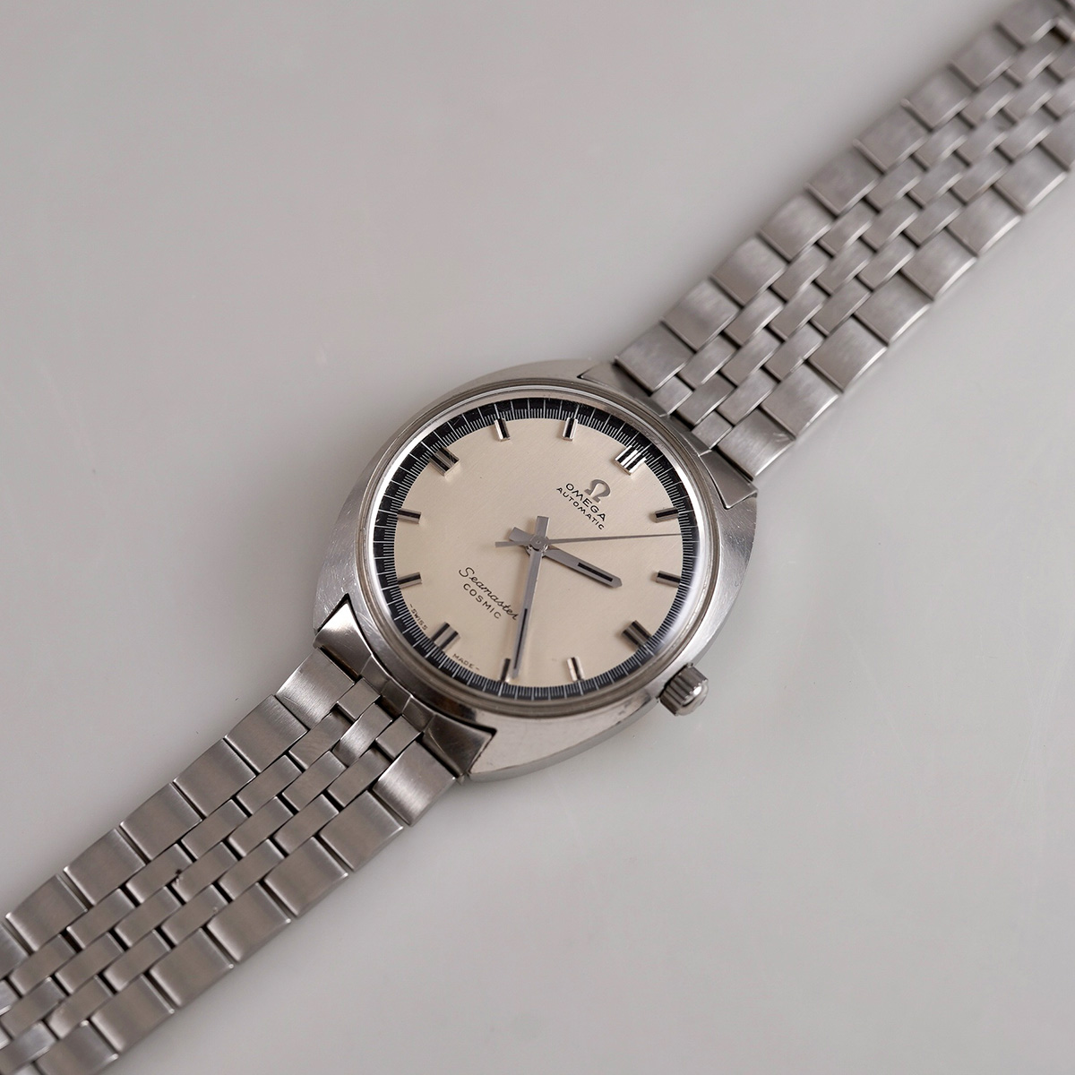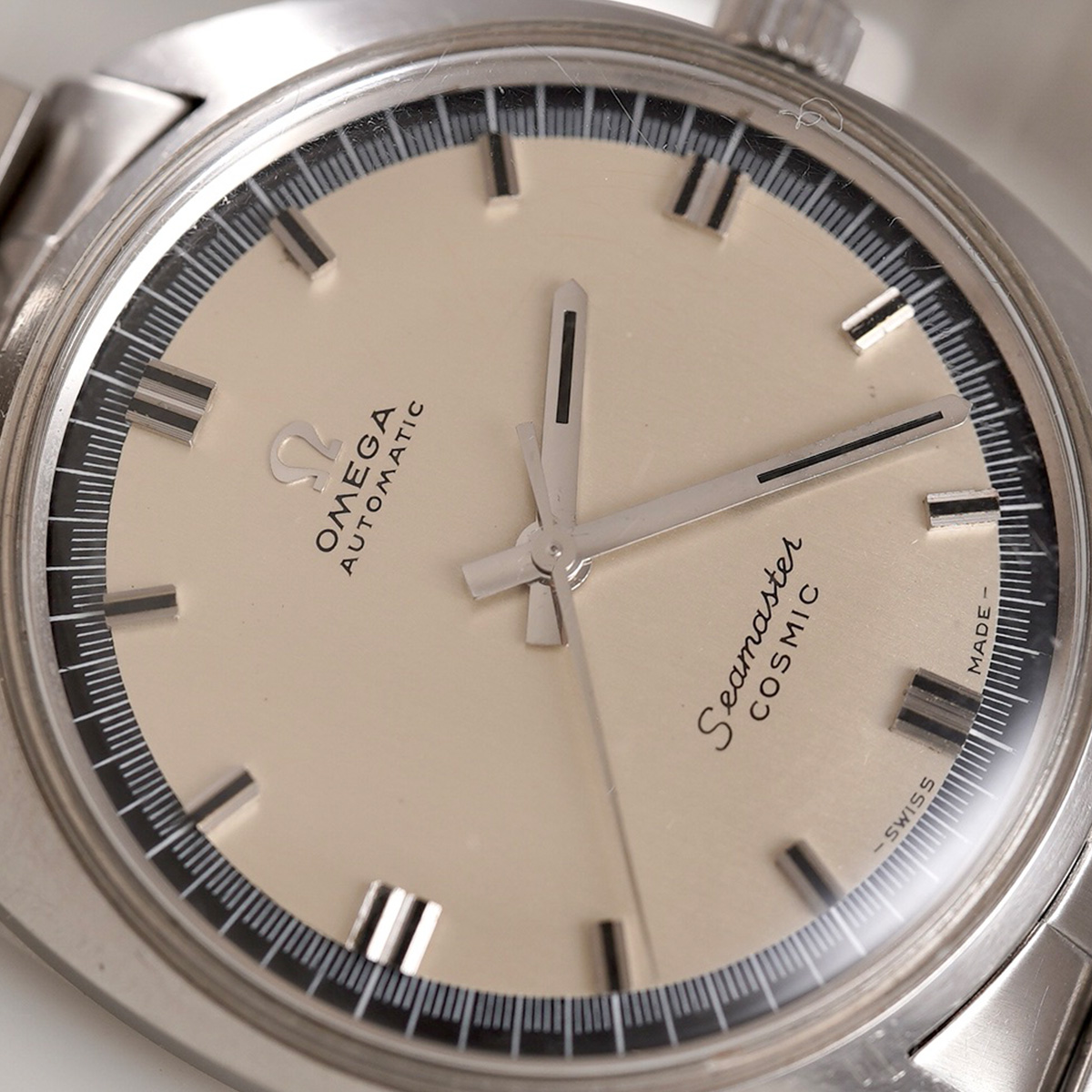 スタンダードなシーマスターを、よりスポーツウォッチへと進化させたと言われ、デザインされたモデル。宇宙を意味するペットネーム「SEAMASTER COSMIC(シーマスター・コスミック)」1960年代後半〜1970年代前半に生産されたモデルになり、こちらは、ミニッツトラックが目を惹く、通称「レイルウェイ」のツートンダイヤル。防水性を高める為、「ユニコック」と呼ばれる特徴的なワンピースケースが採用されています。文字盤、それぞれの針、外装ケース、ステンレススチール製の純正ブレス(FF026:腕周り〜18.5cmほどまで装着可能)と、いずれもオリジナルのコンディションを保ち、小傷等はありますが、概ねコンディション良好な一本と言えるでしょう。 ムーブメントは日付無し(カレンダー機能無し)自動巻Cal.552を搭載。分解掃除を済ませ日差15秒程で稼働しております。 | |