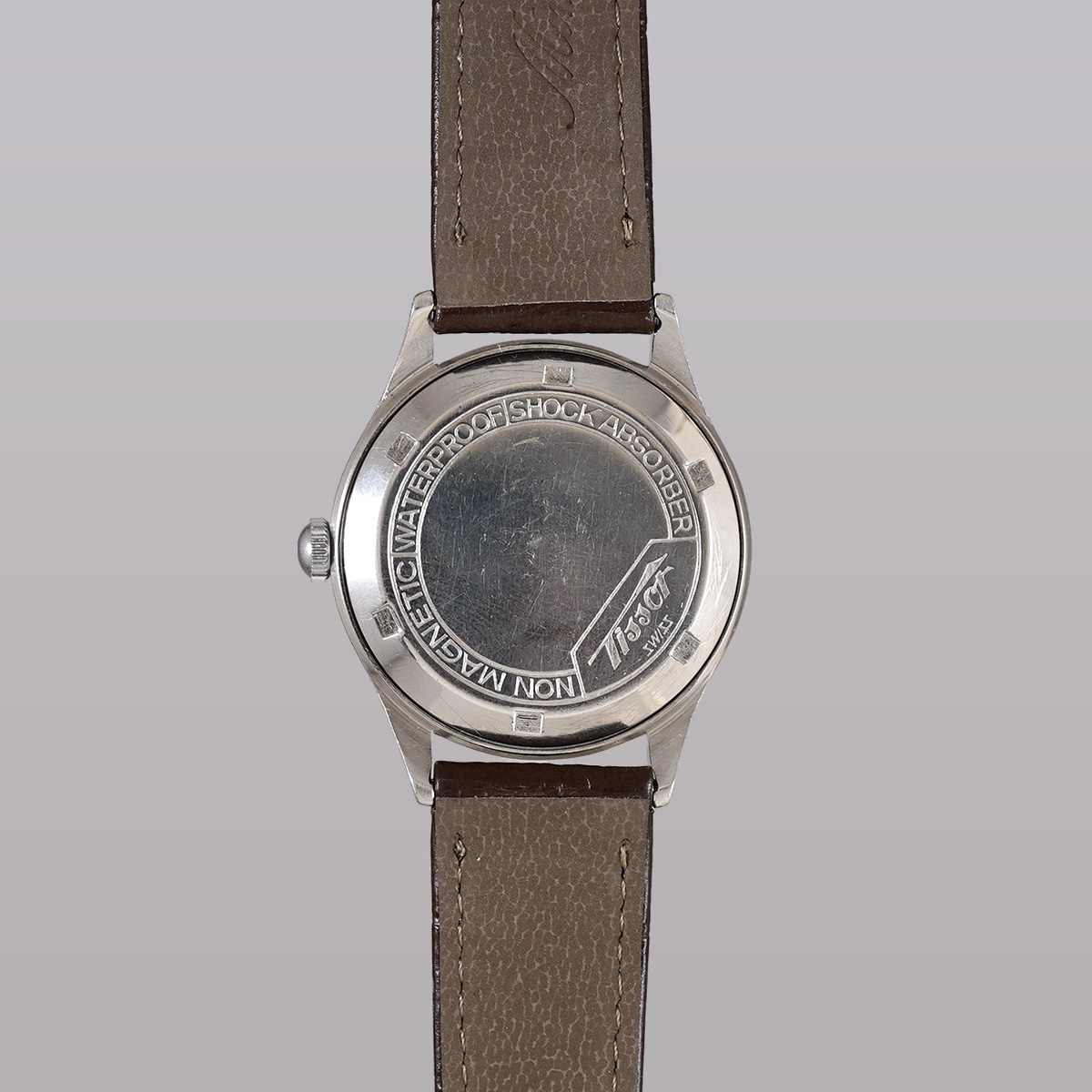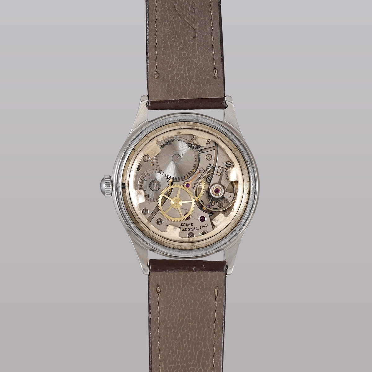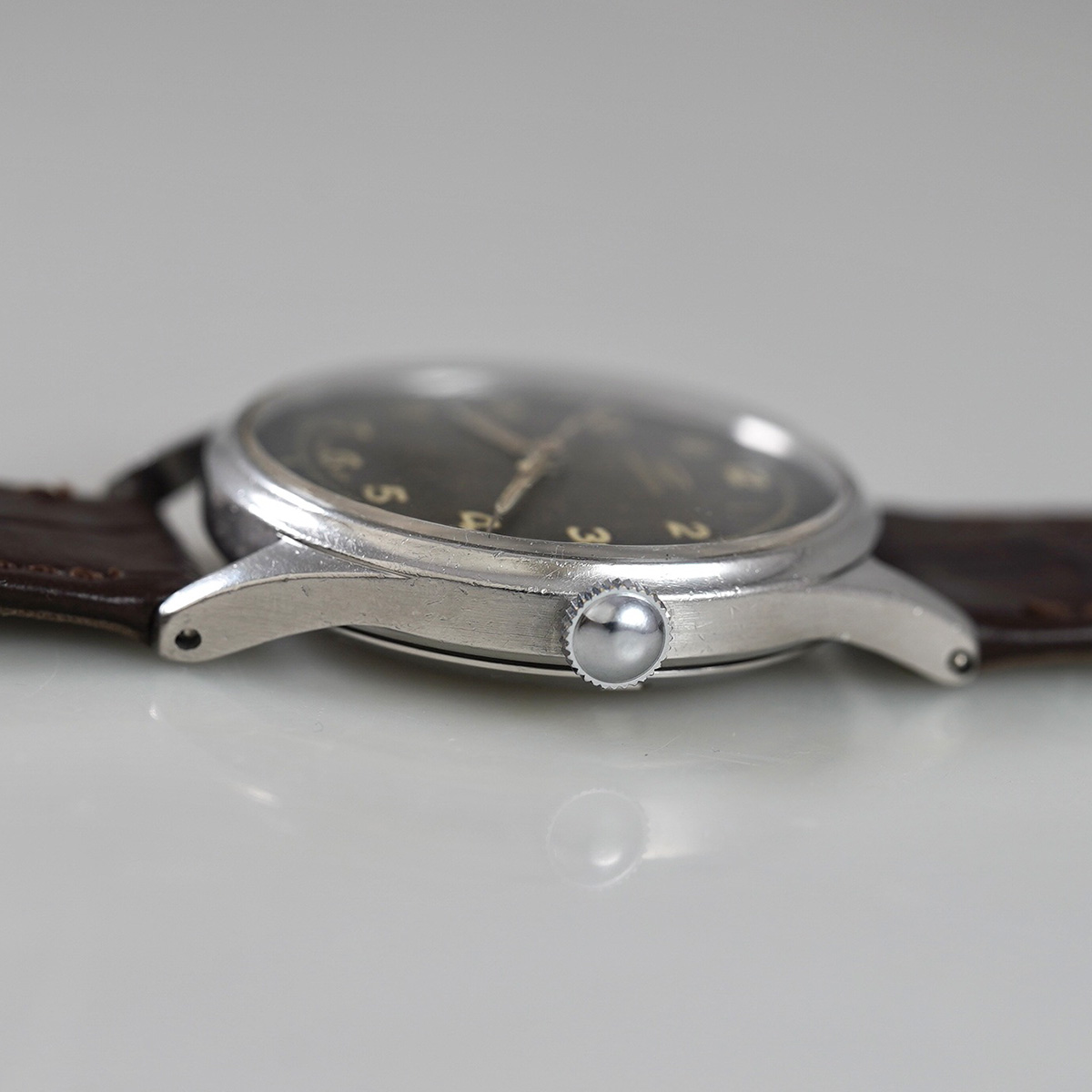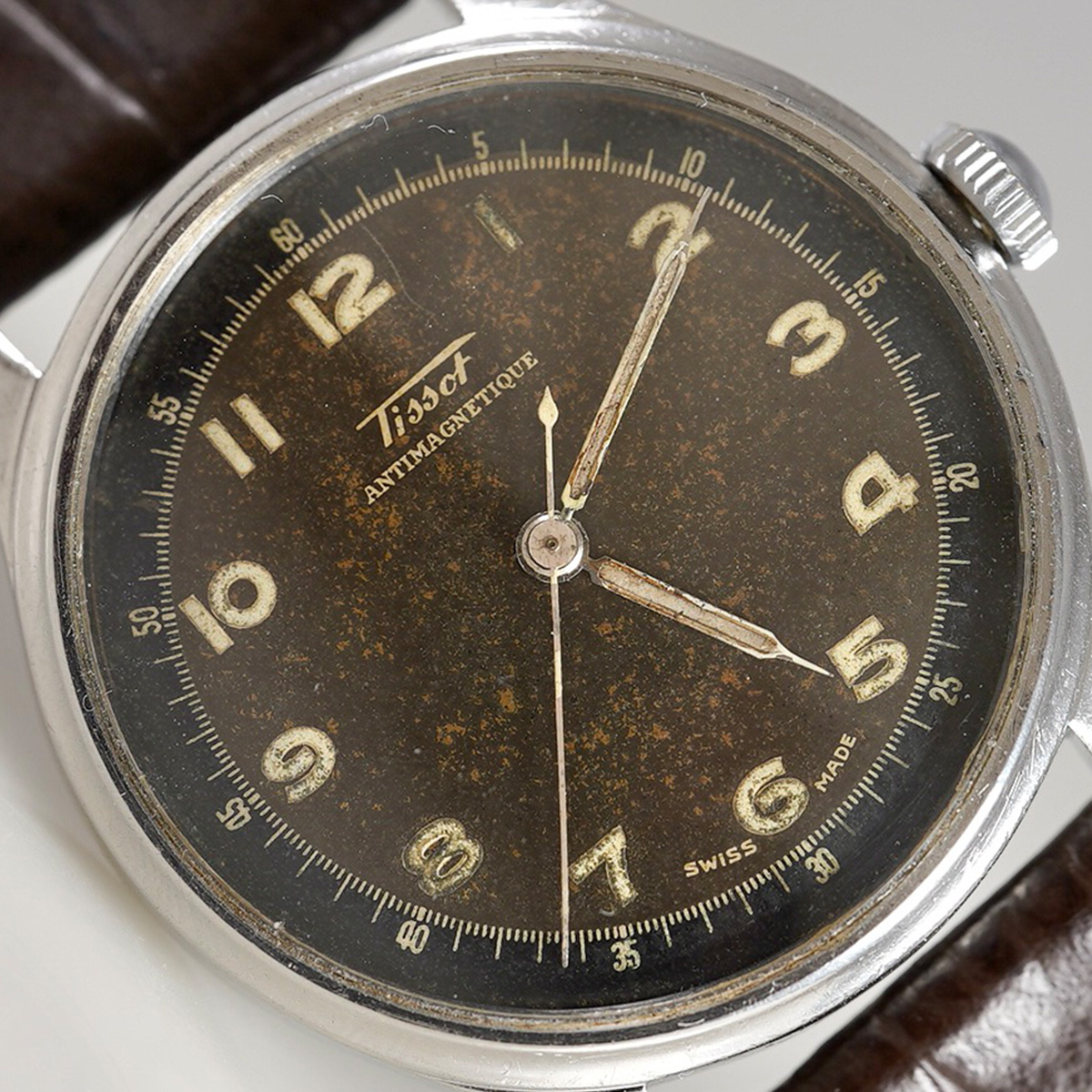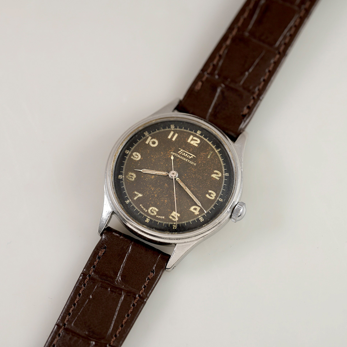 1940年代製.TISSOT(ティソ)の手巻き式、ラウンドモデルになります。 ブラックミラーダイヤルが経年変化を見せ、ブラウンチェンジと化した個体です。 外周部もブラック仕上げになり、金色のミニッツのメモリを配した、ヴィンテージらしい一本。 視認性の高いアラビック数字のアワーマーカーは、多少の経年変化は見られますが、全体的な雰囲気にマッチしたコンディションです。 外装は、小傷はありますが、オリジナルのフォルムを保っています。 裏蓋はスクリューバック式。 茶色の革ベルトをセレクト。 分解掃除済みで日差20秒程度で稼働しています。 | |