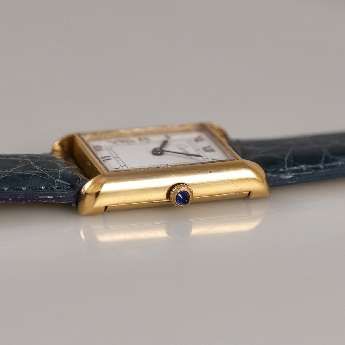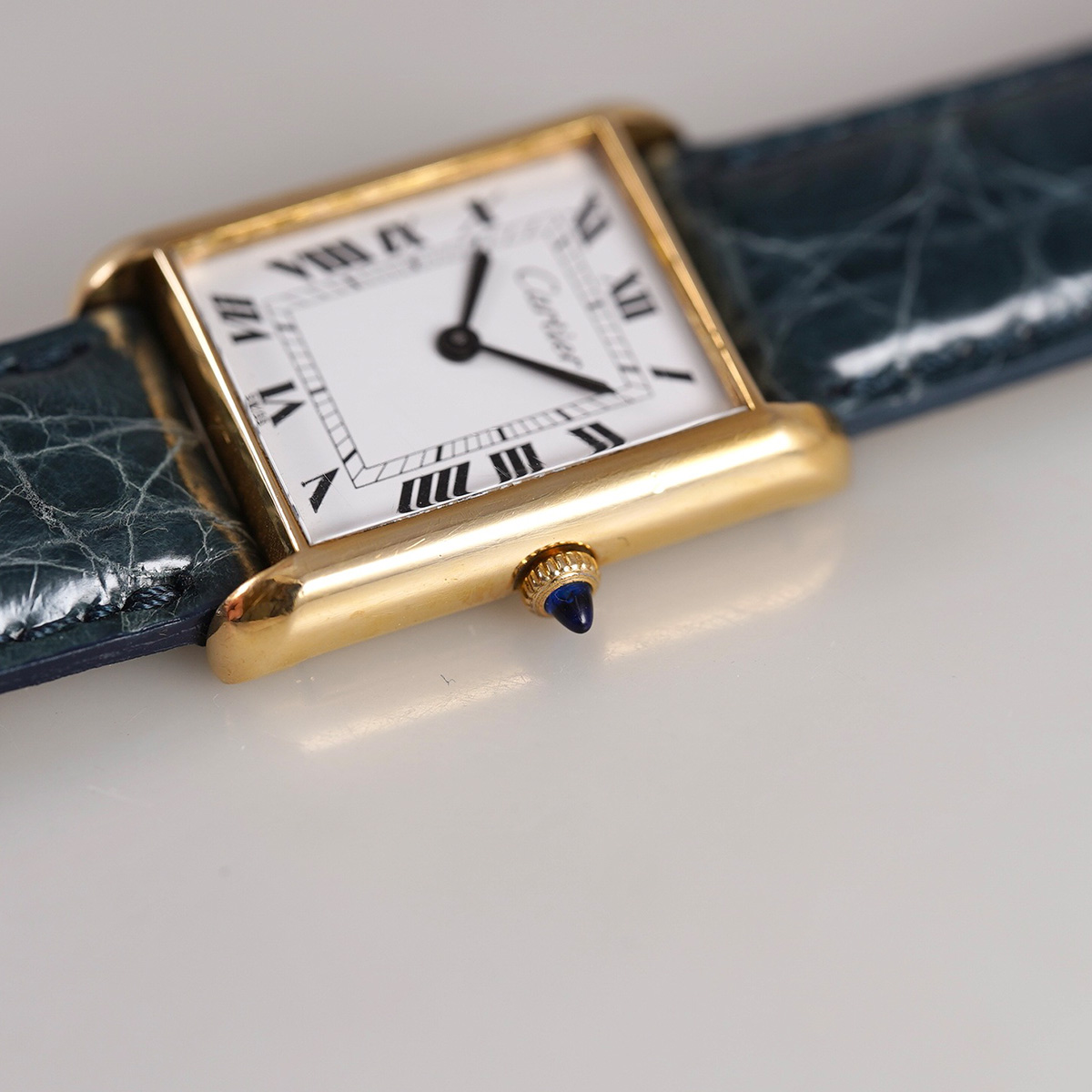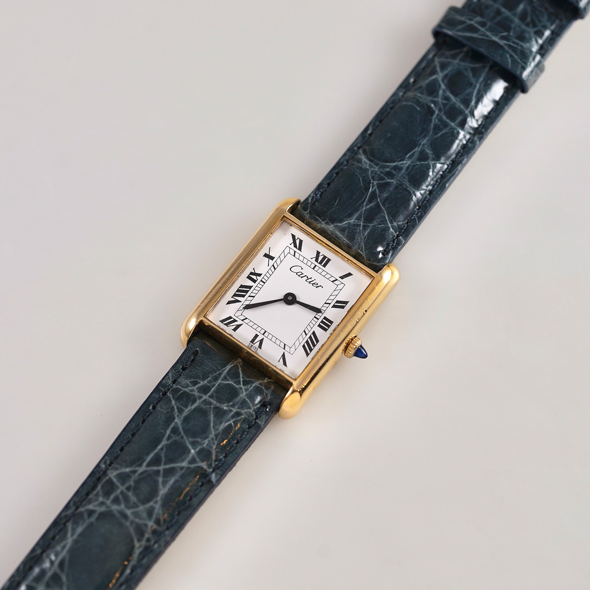 誕生からすでに100年以上、永遠に作り続けられるCARTIERの名作タンク。その歴史の中で、1970年代に始まるディフュージョンラインであるMUST de TANK(マスト タンク)以前に製造された、通称「プレマスト」です。 外装ケースは18金張り仕様で、ダイヤルに「must de」表記が入らないホワイトローマン仕様。 ヒビ割れしやすいダイヤルは、少々の汚れは見られますが目立つヒビ割れは見られない良好なコンディション。 針は黒色になり文字盤のローマン字とマッチしています。 リューズは当時のカボションが残り、欠けや損傷のない良好な状態。 青系のワニ革ベルトをセレクト。 当時の純正尾錠付き。分解掃除済みで日差20秒程度で稼働しています。 | |