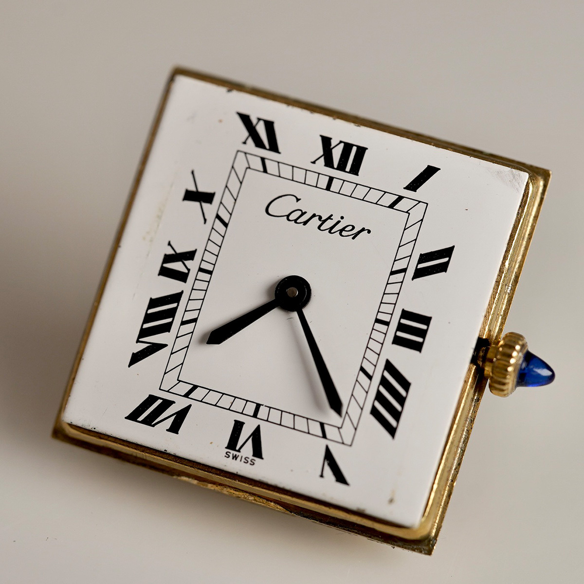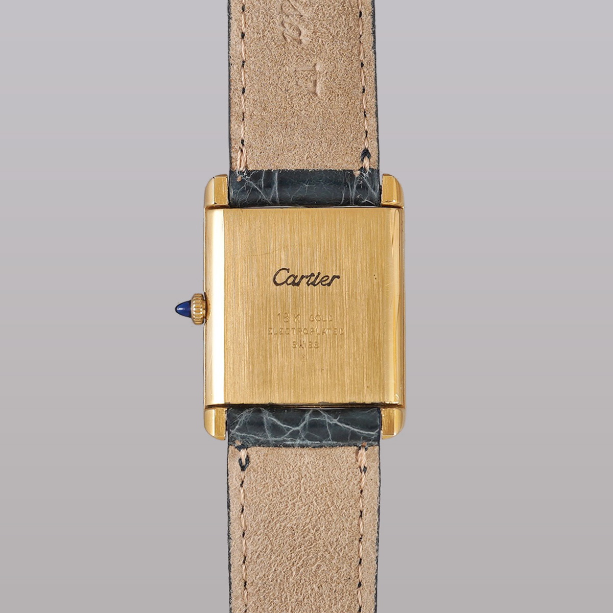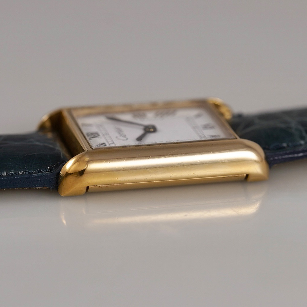 誕生からすでに100年以上、永遠に作り続けられるCARTIERの名作タンク。その歴史の中で、1970年代に始まるディフュージョンラインであるMUST de TANK(マスト タンク)以前に製造された、通称「プレマスト」です。 外装ケースは18金張り仕様で、ダイヤルに「must de」表記が入らないホワイトローマン仕様。 ヒビ割れしやすいダイヤルは、少々の汚れは見られますが目立つヒビ割れは見られない良好なコンディション。 針は黒色になり文字盤のローマン字とマッチしています。 リューズは当時のカボションが残り、欠けや損傷のない良好な状態。 青系のワニ革ベルトをセレクト。 当時の純正尾錠付き。分解掃除済みで日差20秒程度で稼働しています。 | |