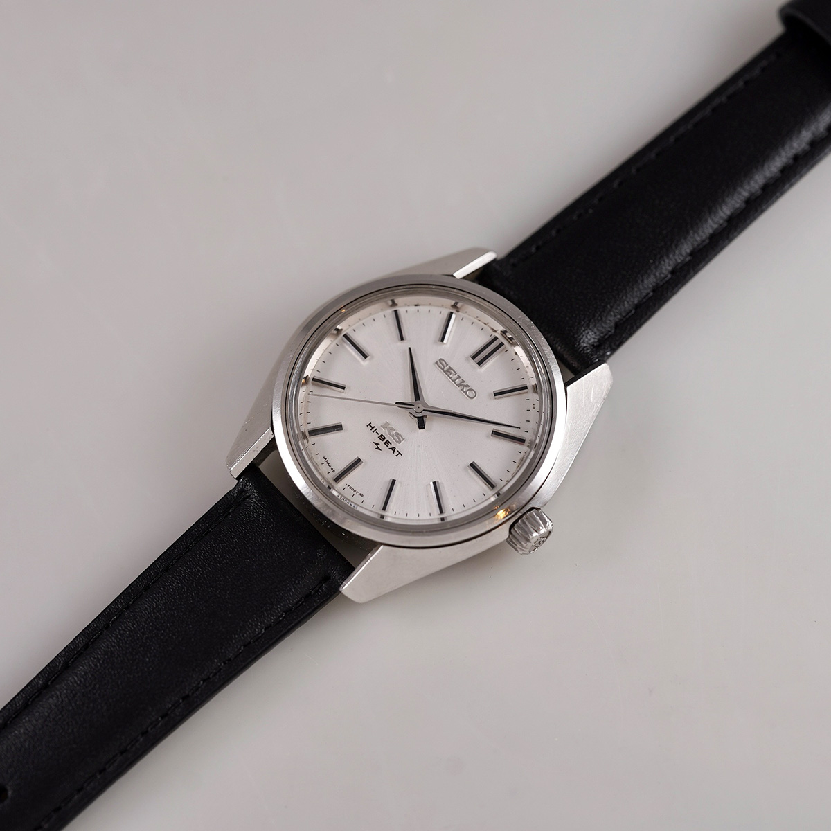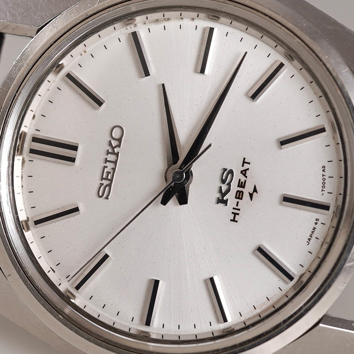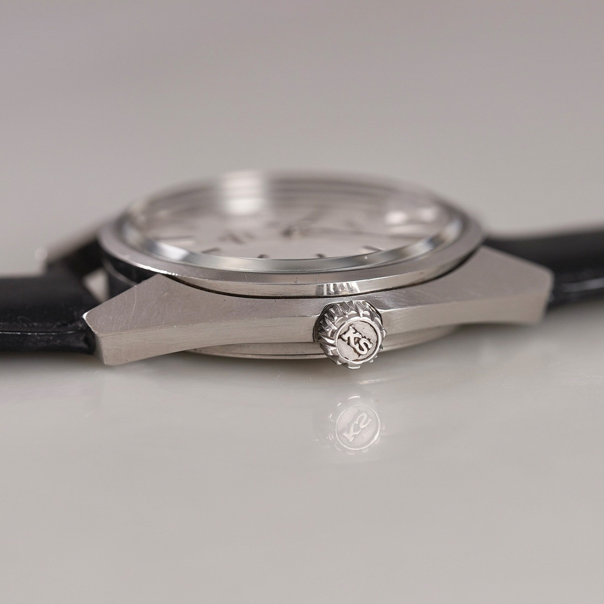 歴代キングセイコーの中でもレアな一本である、通称「45KS」から 45-7001 になります。 この「45KS」には何種類かのケース形状があります。外装コンディションや、文字盤コンディションの良い個体が極端に少なく、納得出来る個体と出会う機会に恵まれました。亀戸工場が、諏訪工場に負けず劣らずの時計を製造するため、当時の技術力を注ぎ込んだモデルと言われ、キングセイコーで初のハイビートムーブメントを搭載したモデル。 文字盤はノンデイト仕様のシルバーダイヤルで、ブラック塗装の針やインデックスが配されたバランスの良い顔立ちです。 全体的に綺麗な状態で、シルバー色のサンレイ仕上げの文字盤はややエイジングが見られますが、目立つ痛みは無いと思います。 外装には多少の小傷が見られるものの、ケースのエッジやフォルムは維持されており、裏蓋の刻印や劣化していることの多いKSメダリオンも中々のコンディションを保っています。Made in JAPAN、本当にカッコいい一本です。後年のSEIKO社.純正革ベルトをセレクト。分解掃除を済ませ日差15秒程で稼働しております。 | |