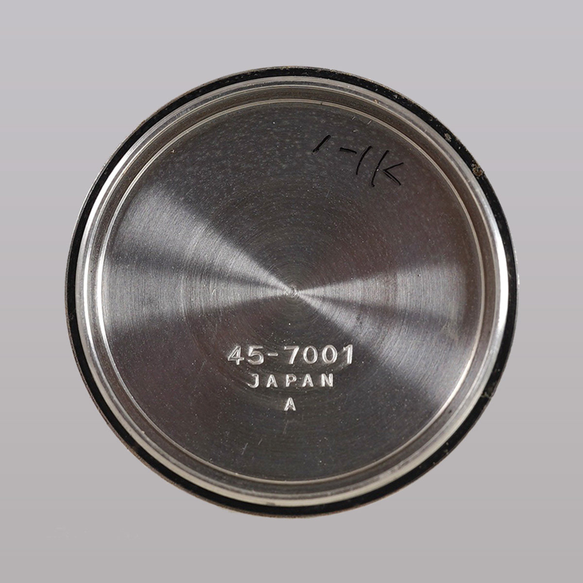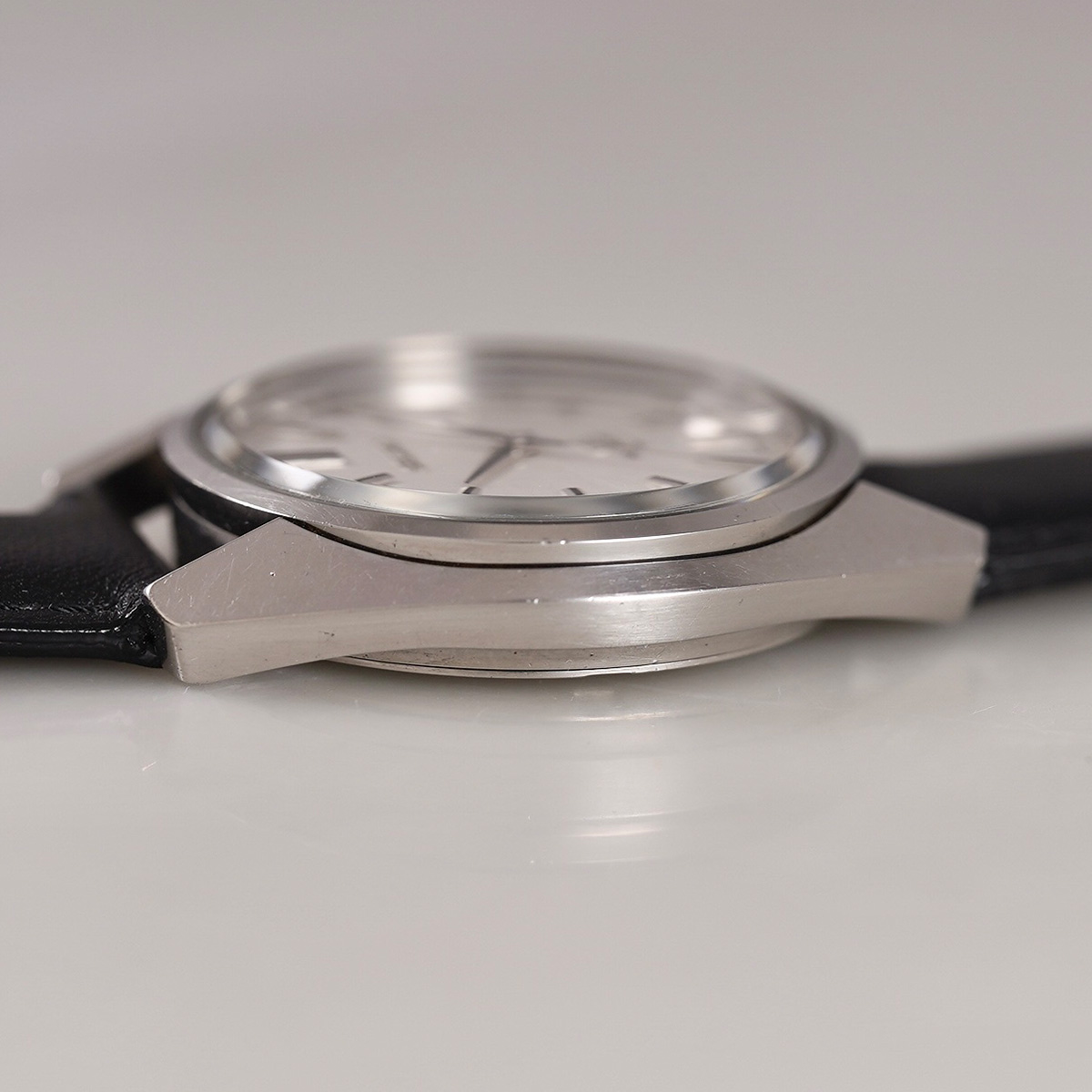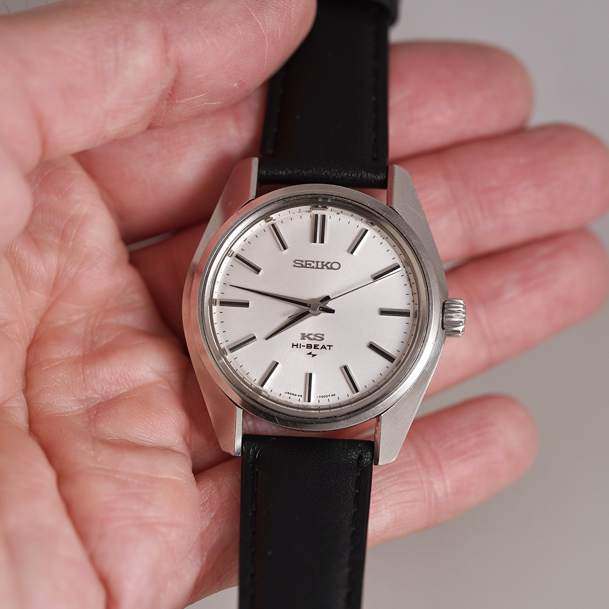 歴代キングセイコーの中でもレアな一本である、通称「45KS」から 45-7001 になります。 この「45KS」には何種類かのケース形状があります。外装コンディションや、文字盤コンディションの良い個体が極端に少なく、納得出来る個体と出会う機会に恵まれました。亀戸工場が、諏訪工場に負けず劣らずの時計を製造するため、当時の技術力を注ぎ込んだモデルと言われ、キングセイコーで初のハイビートムーブメントを搭載したモデル。 文字盤はノンデイト仕様のシルバーダイヤルで、ブラック塗装の針やインデックスが配されたバランスの良い顔立ちです。 全体的に綺麗な状態で、シルバー色のサンレイ仕上げの文字盤はややエイジングが見られますが、目立つ痛みは無いと思います。 外装には多少の小傷が見られるものの、ケースのエッジやフォルムは維持されており、裏蓋の刻印や劣化していることの多いKSメダリオンも中々のコンディションを保っています。Made in JAPAN、本当にカッコいい一本です。後年のSEIKO社.純正革ベルトをセレクト。分解掃除を済ませ日差15秒程で稼働しております。 | |