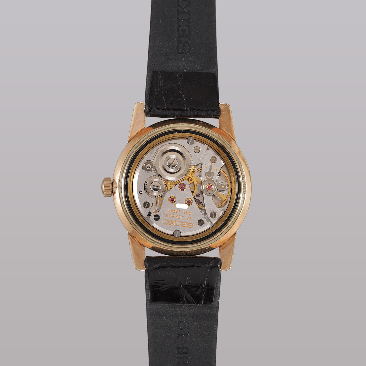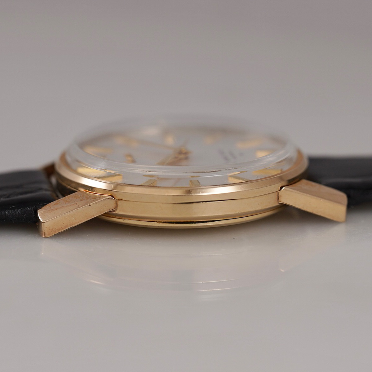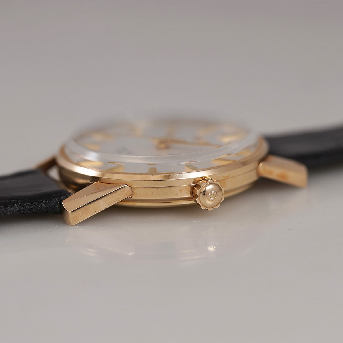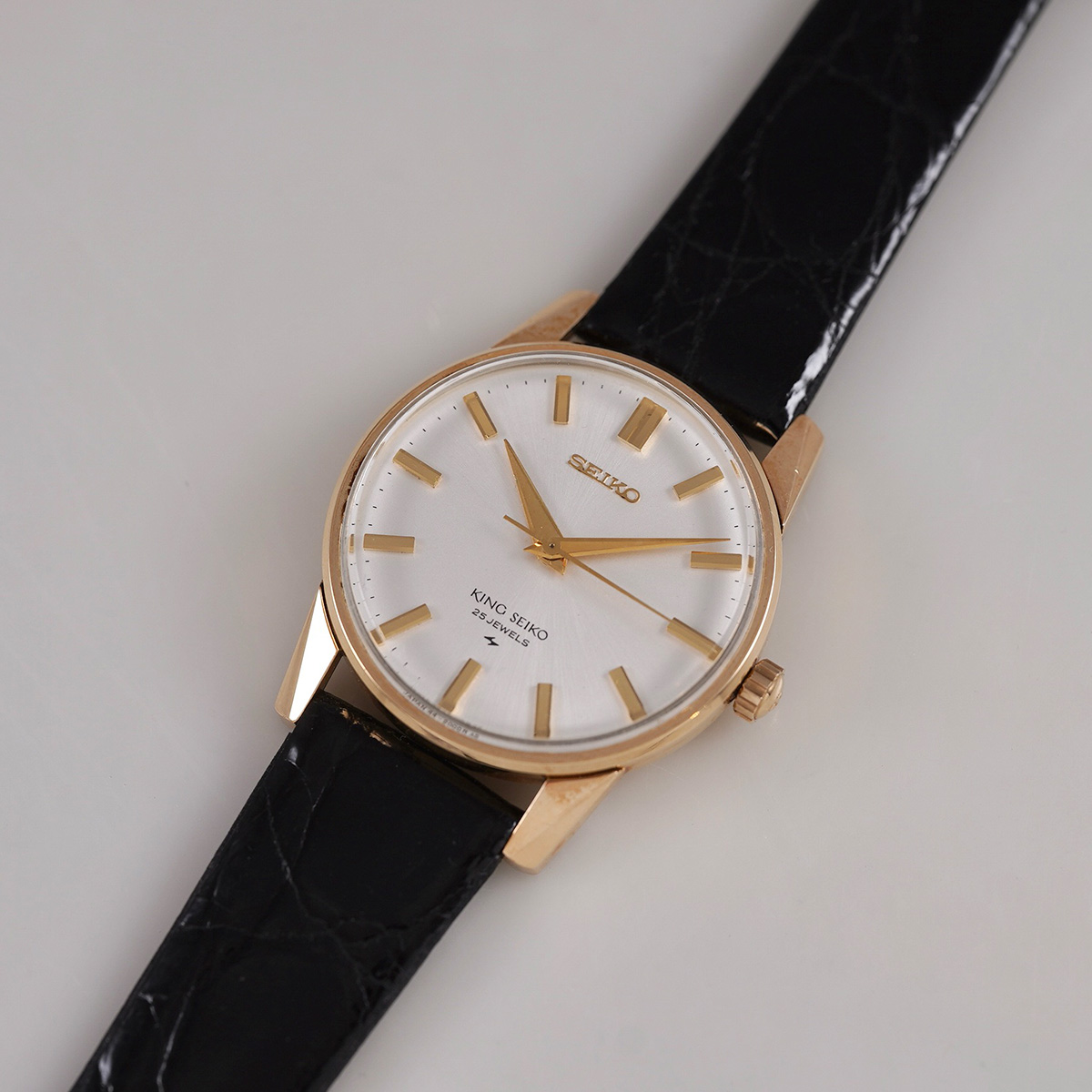 1966年製.キングセイコーの2nd(セカンド)モデル後期型、金張りケースのAGF.44-2000 。1st(ファースト)モデルからの変更点としては、文字盤の表記とハック機能が追加されました。 裏蓋は圧入式のスナップバック式になり、盾メダリオンは健在。 また、ケースのラグを太く設計したことで耐久性も向上しています。ムーブメントはCal.44A。44-2000の前期ではカマ型のバーが見られますが、こちらはカマ無しの後期モデル。 ケースはAGF仕上げ(金張り)で、シルバー色のダイアルとの組み合わせで高級感を感じることができます。 サンレイ仕上げの文字盤はもちろん、それぞれの針、インデックスもコンディション良好。 小傷はありますが、致命的な箇所は無く、ケースもコンディション◎ 後年のSEIKO社製.革ベルト+尾錠付きをセレクト。分解掃除を済ませ日差20秒程で稼働しております。 ※弊社の販売品は、自然故障につき12ヶ月の保証をつけて販売しておりますので、ご安心してご利用いただけます。 | |