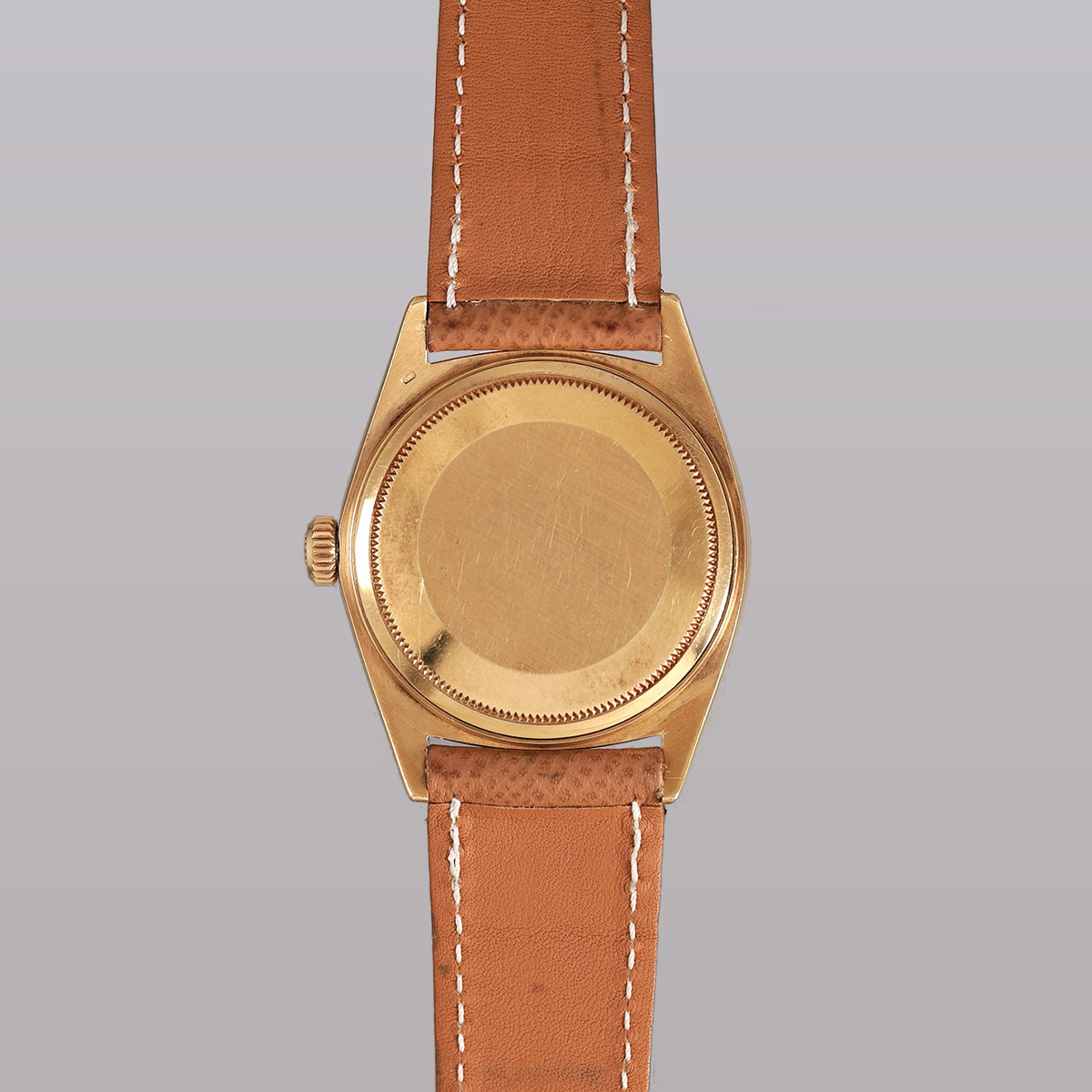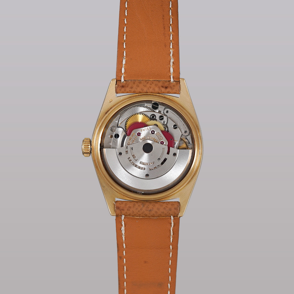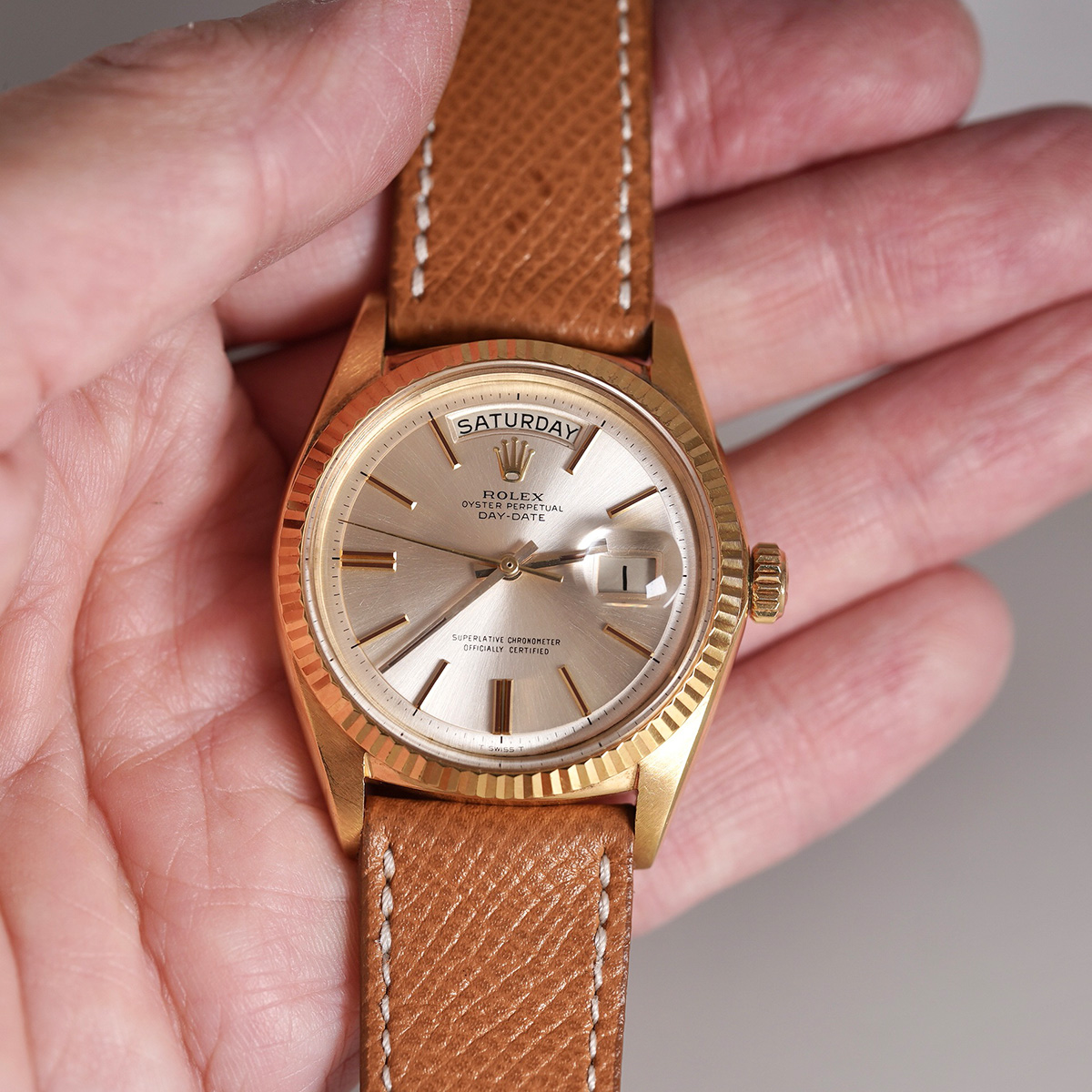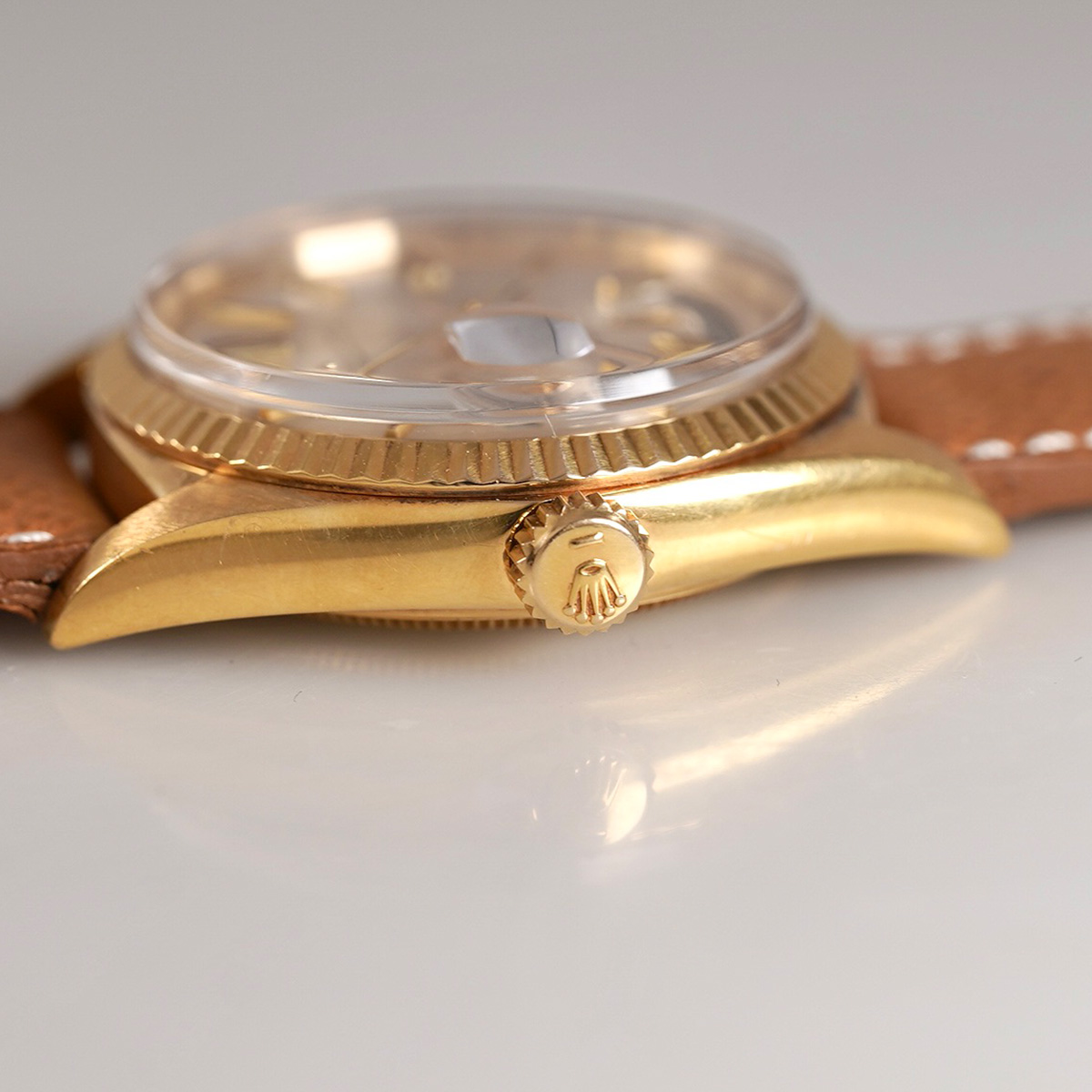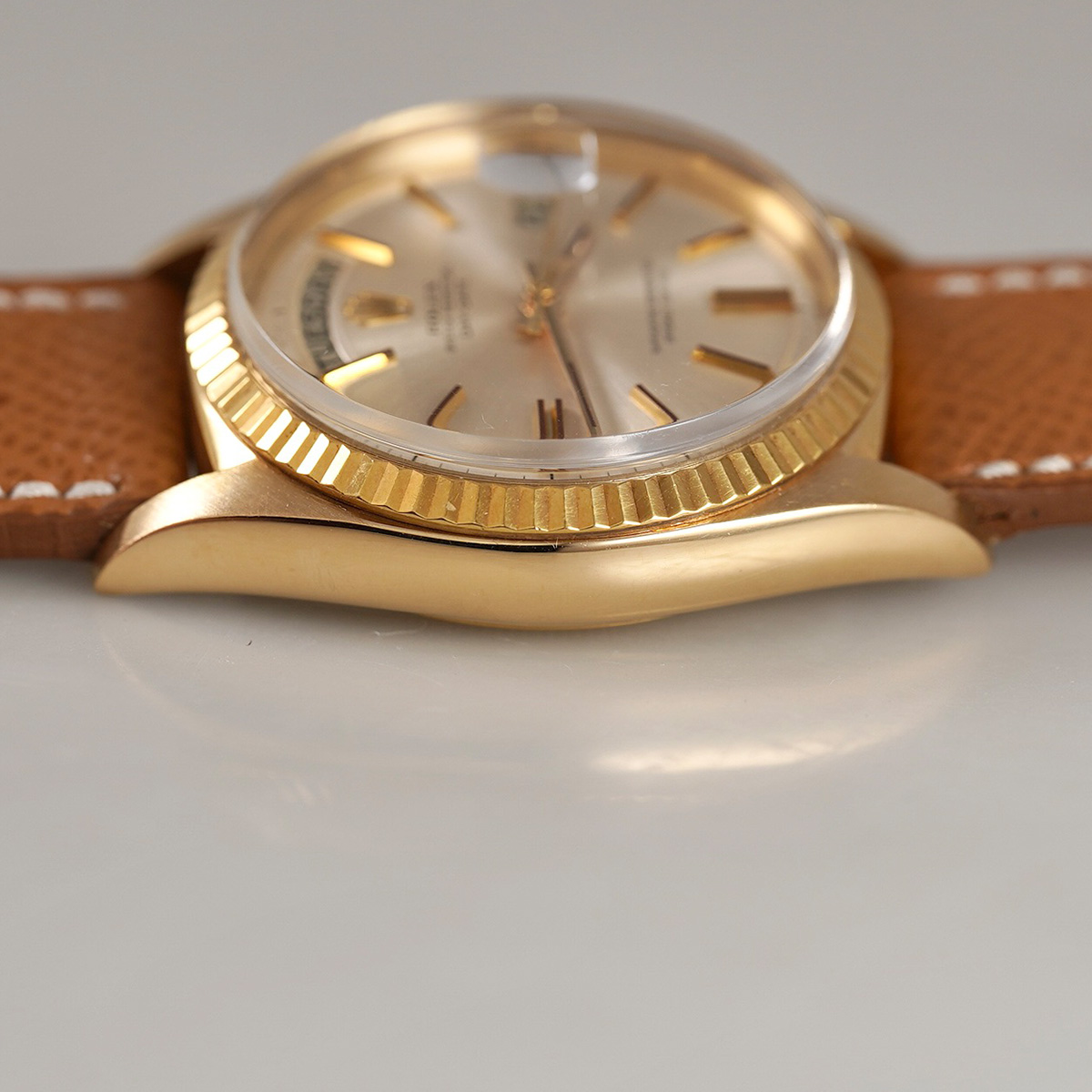 プレジデントモデルと呼ばれる、ロレックス社の1966年製. DAY-DATE(デイデイト)。 金無垢とプラチナのみで展開されていて、オイスターケースとフルーテッドベゼルの輝きが美しく、重厚感があり、同社を代表するモデルの一本。 フルスペルで表示される曜日表記はどこか愛嬌すら感じるディテール。 こちらの個体は珍しい夜光無し(ノールミナス)モデル。 針とインデックスも夜光無しです。 ややエイジングの見られる文字盤はサンレイ仕上げになり、外周に段がつき、インデックスはアップライド式。 細かいですが、ヴィンテージならではのポイントです。 ムーブメントはデイデイト専用、自動巻 Cal.1556を搭載。 小傷はありますが、ケースは過度な磨きはされておらずオリジナルのフォルムを保っております。茶系の革ベルトをセレクト。分解掃除を済ませ日差10秒程で稼働しております。 | |