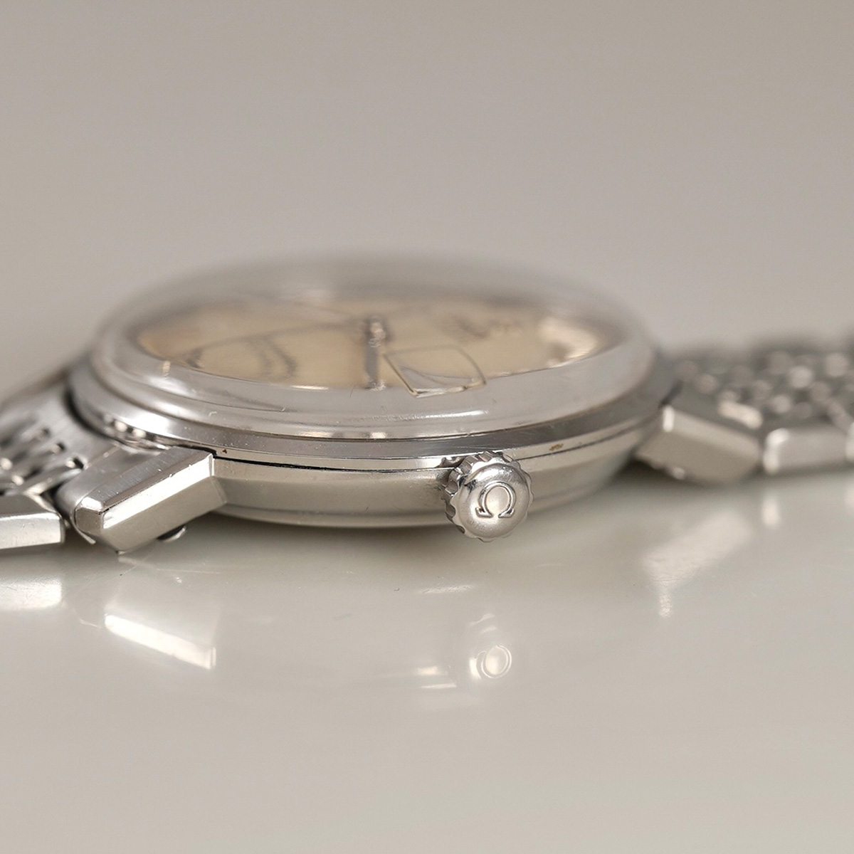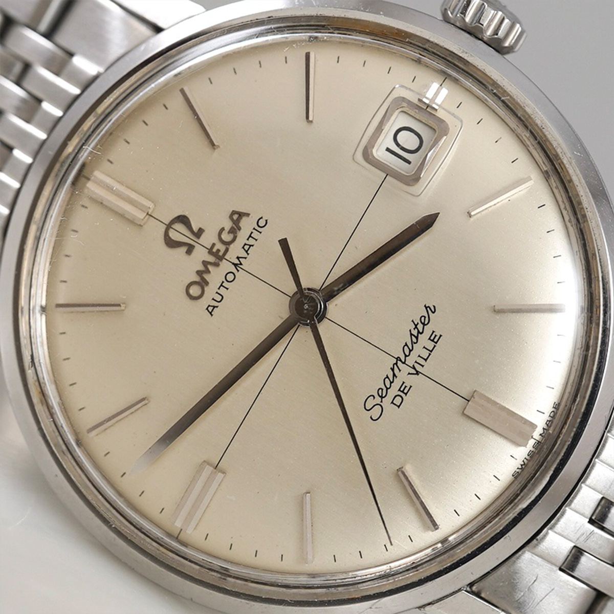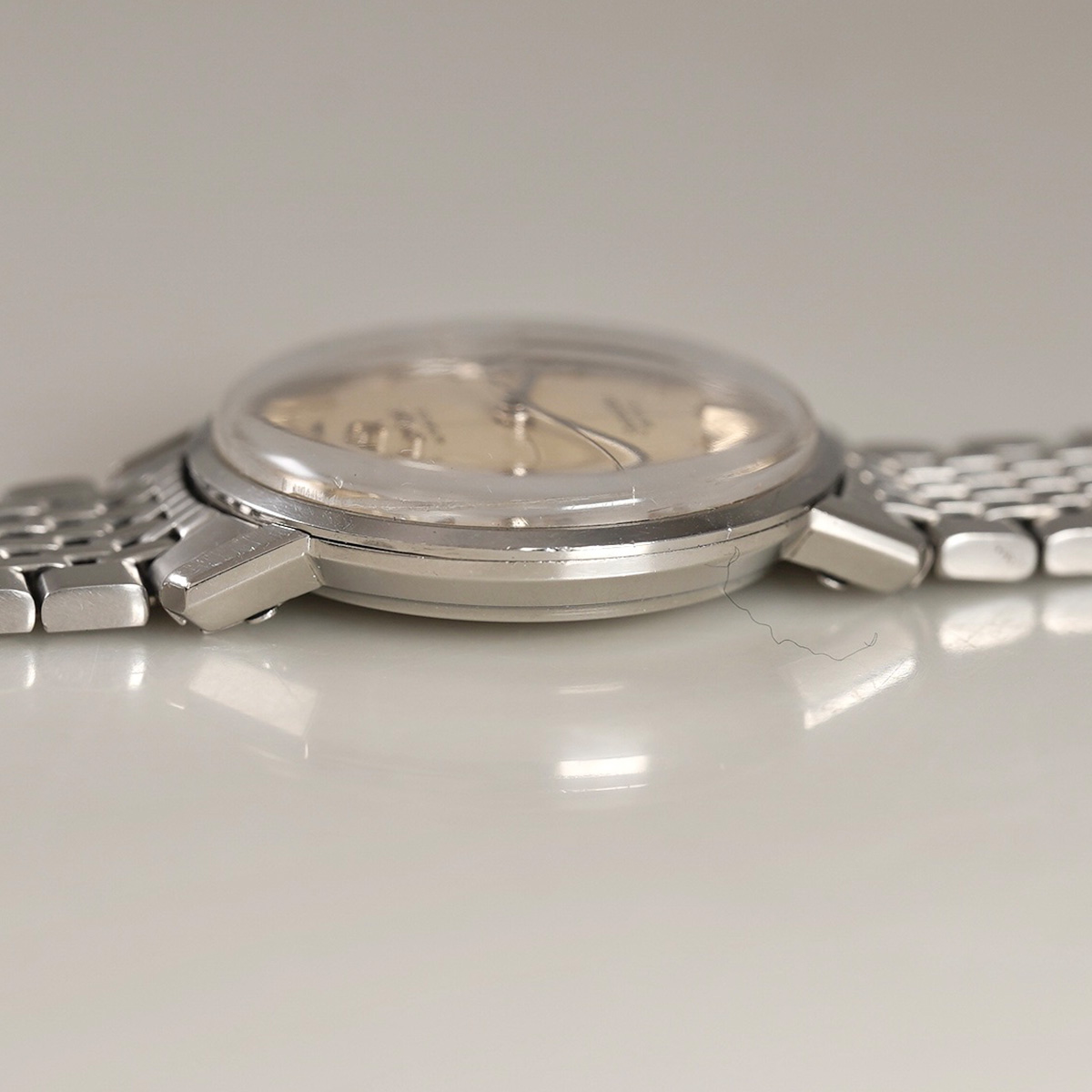 1966年製(参考資料.シリアルナンバーより)Seamaster DE VILLE(シーマスター・デヴィル)。 シーマスターの派生モデルとして登場し、DE VILLE(デヴィル)として1967年ごろから独立していますので、それ以前の限られた期間にのみ製造されていた、知る人ぞ知る割と希少なモデルになります。 年代らしいやや湾曲した文字盤にはアップライド仕様のブランドロゴΩとOMEGAがセットされ、シンプルなシルバー文字盤には十字のクロスラインがデザインされています。 年式なりのエイジングは見られますが、見苦しさはありません。 多少の緩みはありますが、こちらも当時からの希少な純正SSブレスが装着され充分な長さ(腕周り〜20.5cmほど)。 全体的に小傷等はありますが、オリジナルのケースフォルムを保っています。オメガ社を代表する自動巻ムーブメントCal.565を搭載。分解掃除を済ませ日差15秒程で稼働しております。 | |