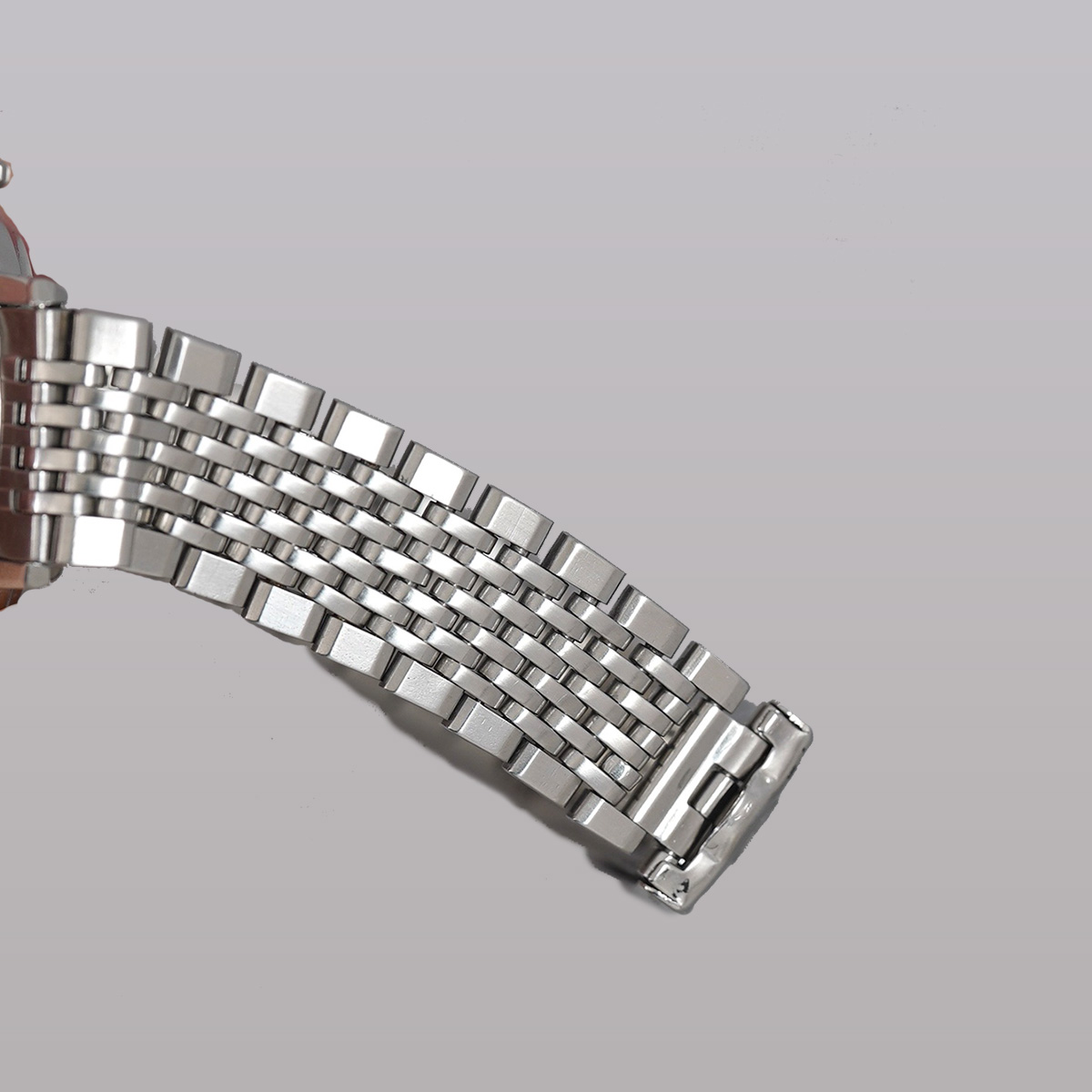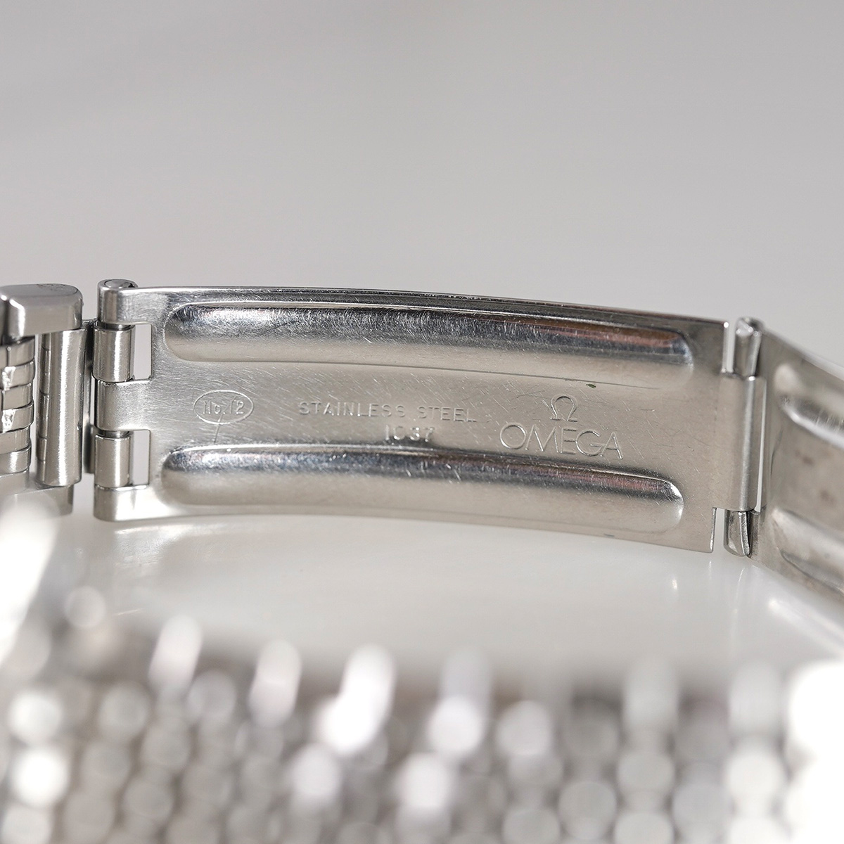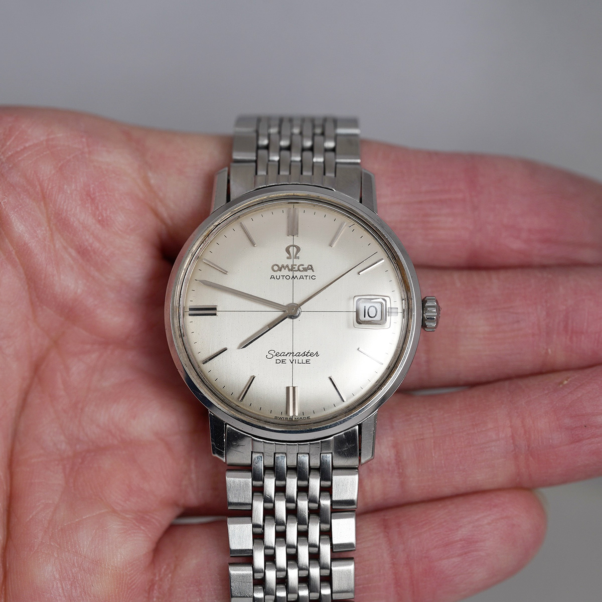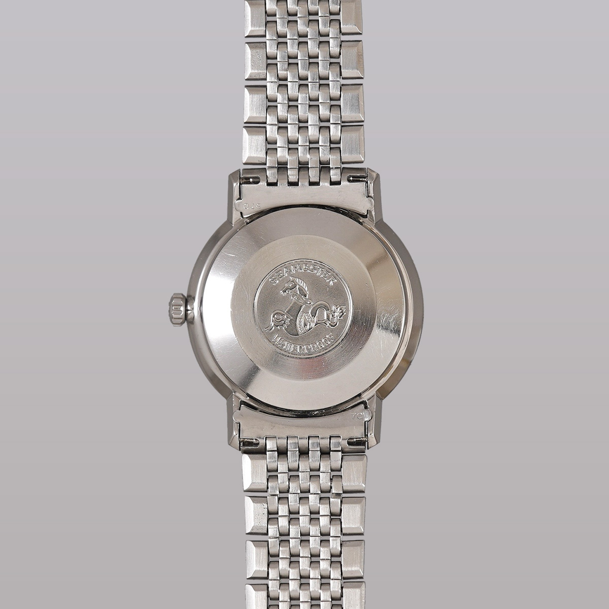 1966年製(参考資料.シリアルナンバーより)Seamaster DE VILLE(シーマスター・デヴィル)。 シーマスターの派生モデルとして登場し、DE VILLE(デヴィル)として1967年ごろから独立していますので、それ以前の限られた期間にのみ製造されていた、知る人ぞ知る割と希少なモデルになります。 年代らしいやや湾曲した文字盤にはアップライド仕様のブランドロゴΩとOMEGAがセットされ、シンプルなシルバー文字盤には十字のクロスラインがデザインされています。 年式なりのエイジングは見られますが、見苦しさはありません。 多少の緩みはありますが、こちらも当時からの希少な純正SSブレスが装着され充分な長さ(腕周り〜20.5cmほど)。 全体的に小傷等はありますが、オリジナルのケースフォルムを保っています。オメガ社を代表する自動巻ムーブメントCal.565を搭載。分解掃除を済ませ日差15秒程で稼働しております。 | |