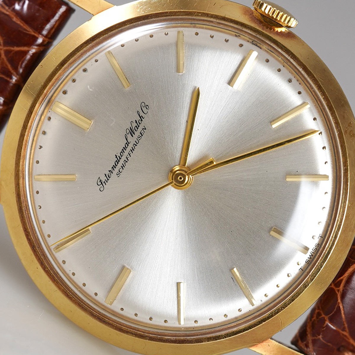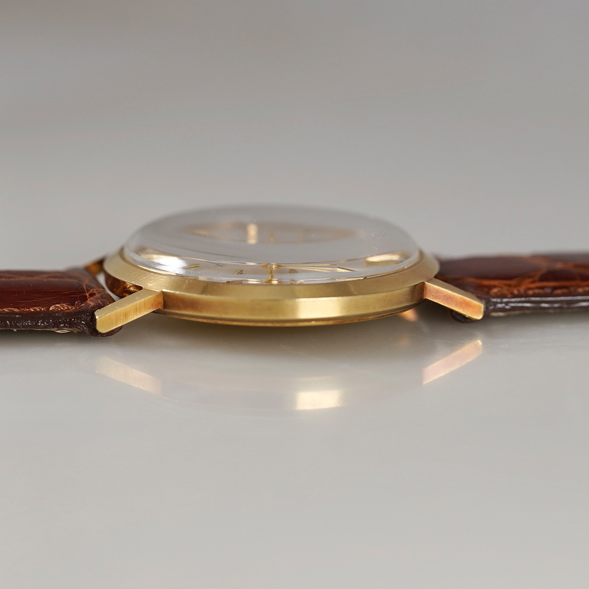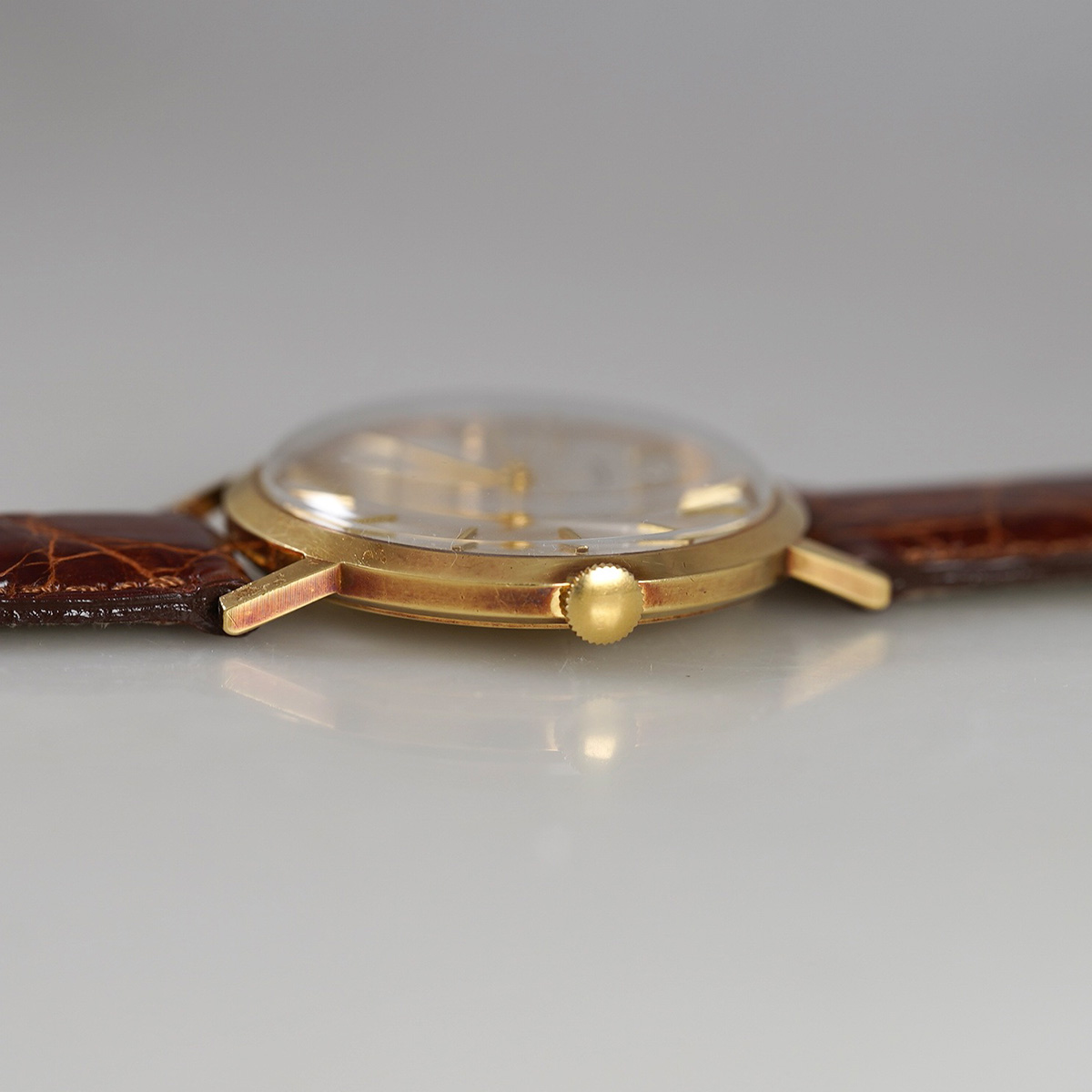 1966年頃製造(参考資料参照より)の18金無垢のドレスウォッチ。ラウンドモデルに3針のシンプルで完成された一本。 手巻きならではの薄型ケースは袖口の収まりが良く、ゴールド色の多い金無垢ケースに収められたシャンパンゴールド文字盤は清潔感があります。文字盤にエイジング等は見られますが、見苦しい感じは無く、ゴールド色のそれぞれの針と多面インデックス、パールドットの輝きが優美な印象。ケースは当時のフォルムを保った良好なコンディション。同年代の純正GF.尾錠付きになります。分解掃除を済ませ日差15秒程で稼働しております。茶系ワニ革ベルトをセレクト。 | |