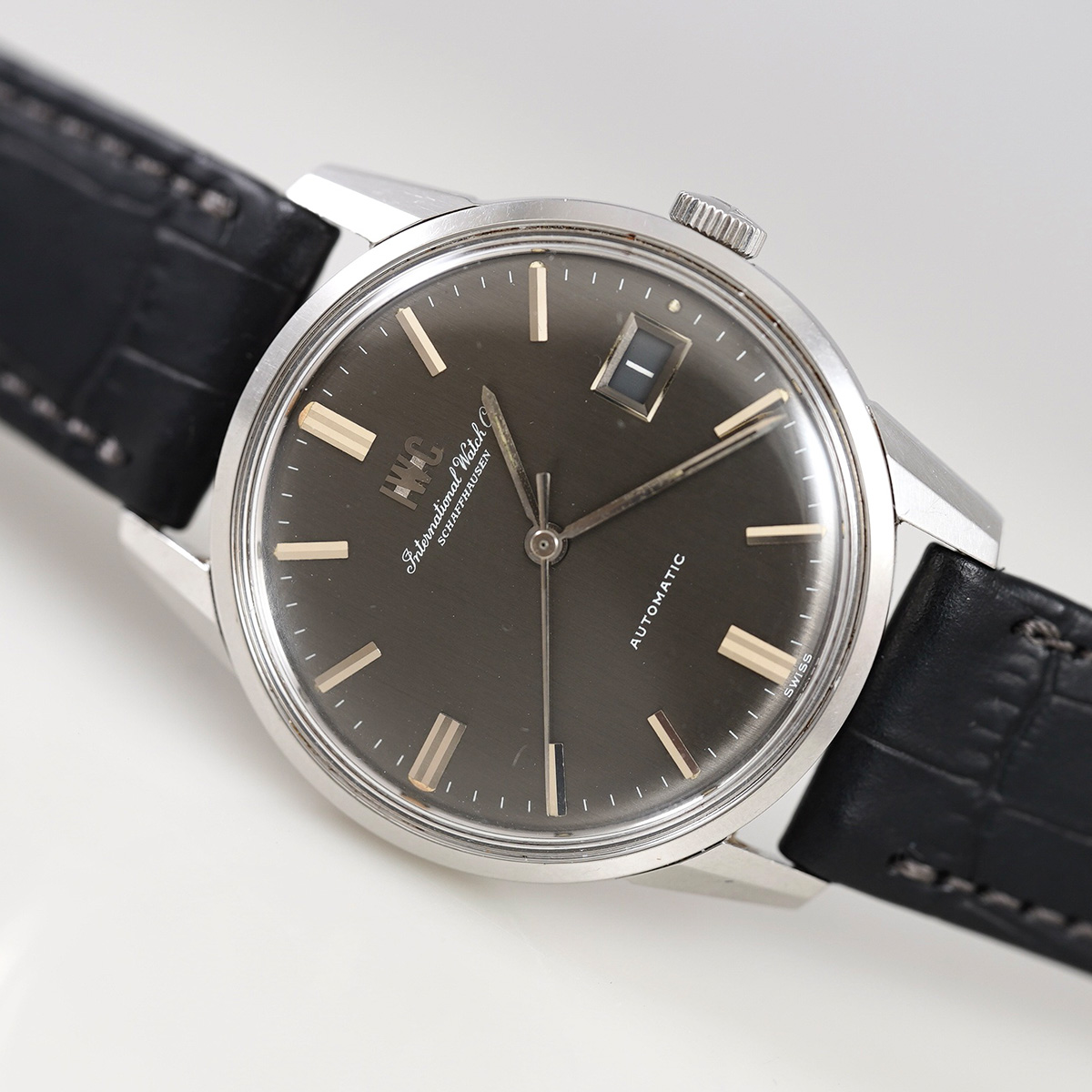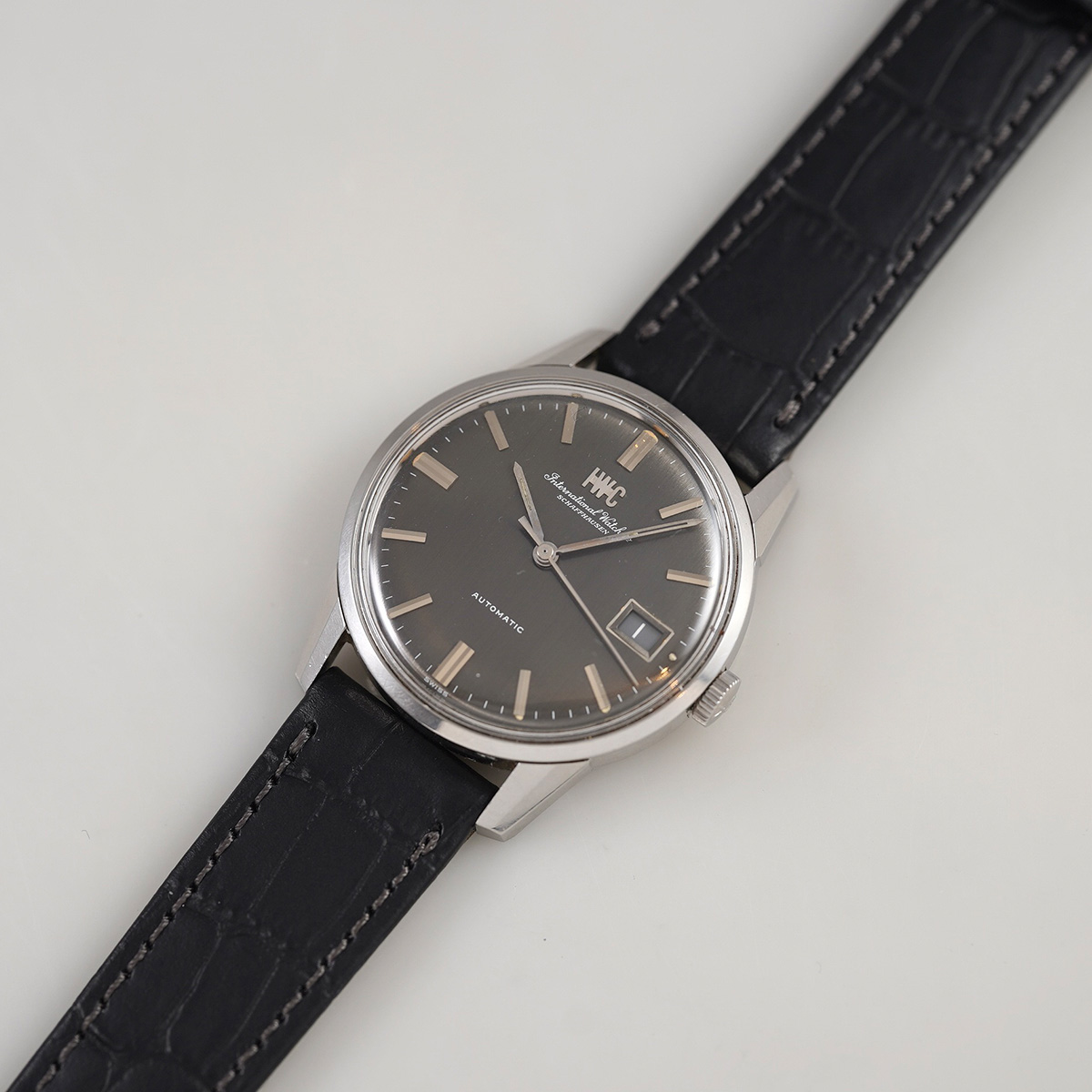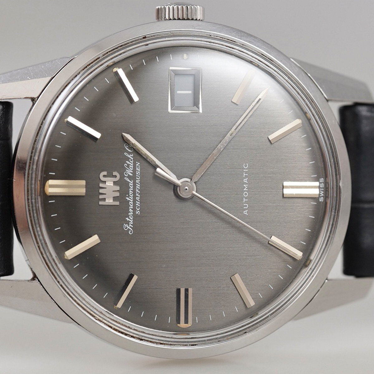1969年頃製造(参考資料参照より)の深みのあるグレー文字盤の R810 ラウンドモデル。縦のヘアライン加工が施された、クールなデザイン。IWCのみに関わらずダークグレーダイヤルは珍しく、デイト表示の背景にも同色のグレーが採用されることで、白文字のデイト表示が視認性に富んでいます。 アップライド式のバーインデックスとブランドロゴの「IWC」はグレーダイヤルの中で光が当たる度にキラキラと高級感を感じます。 外装ケースは小傷等はありますが、過度な磨きはされておらず、当時からのオリジナルのフォルムを保っています。 痛みやすいこの年代のカラーダイヤルは、エイジングが進みやすい傾向にありますが、年式を考えると良好なコンディションです。分解掃除を済ませ日差15秒程で稼働しております。黒系革ベルトをセレクト。 | |