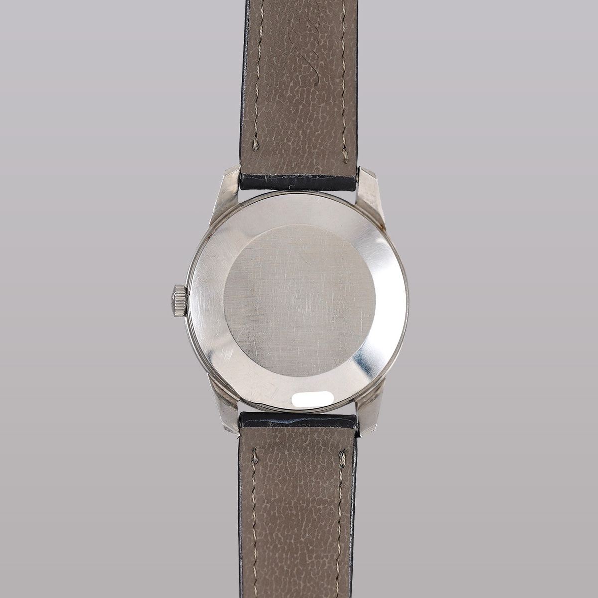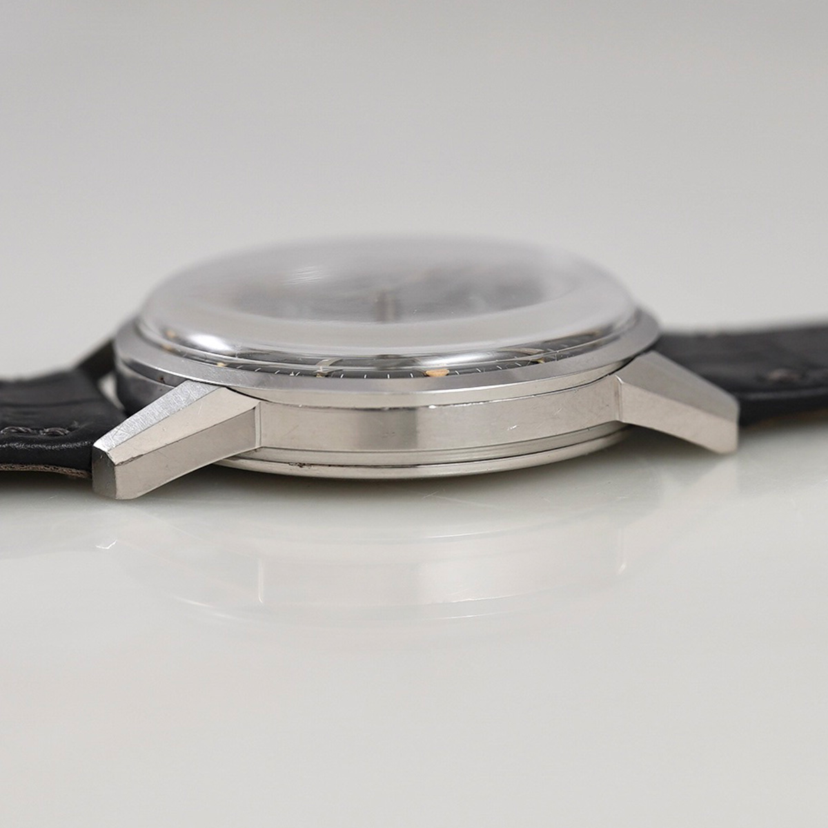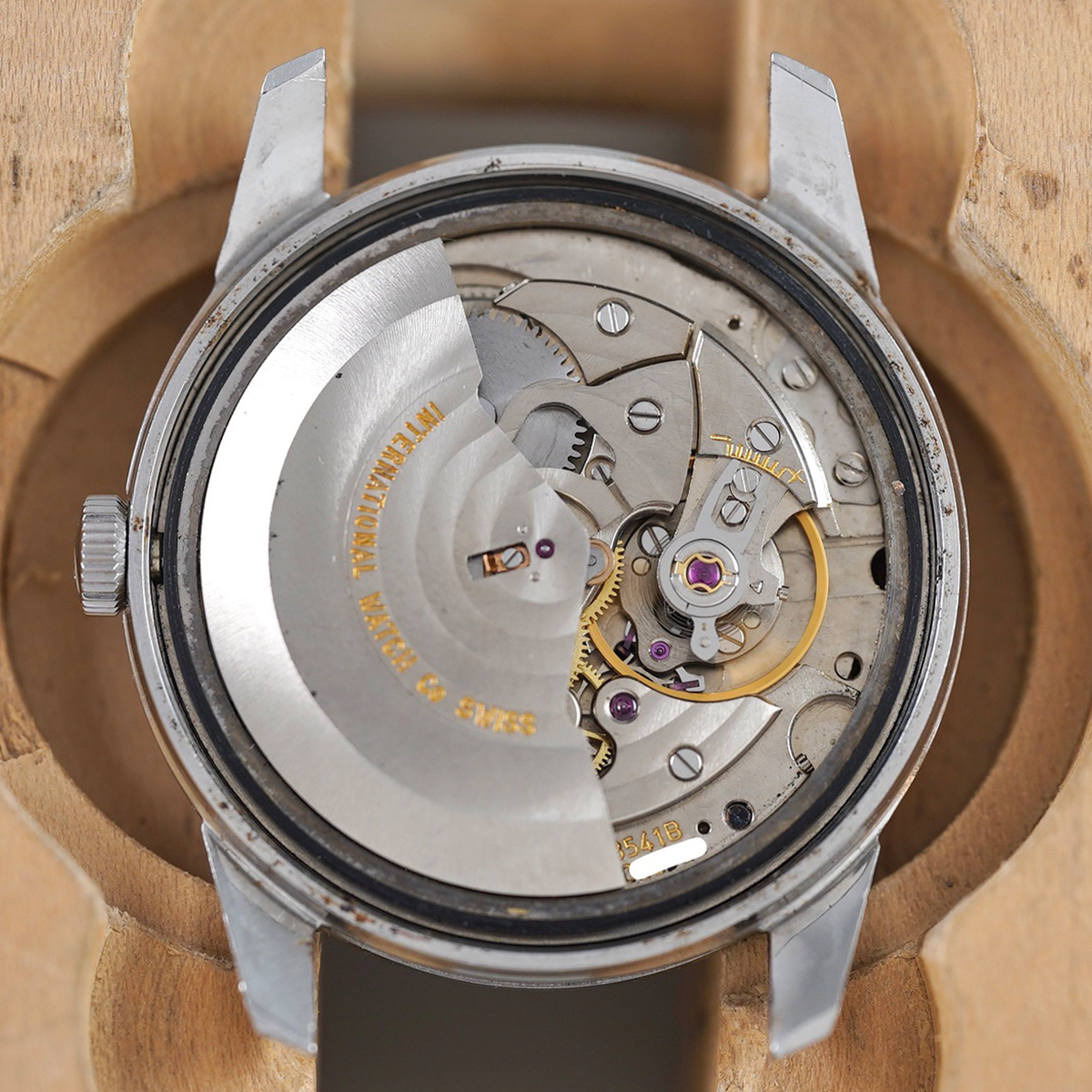 1969年頃製造(参考資料参照より)の深みのあるグレー文字盤の R810 ラウンドモデル。縦のヘアライン加工が施された、クールなデザイン。IWCのみに関わらずダークグレーダイヤルは珍しく、デイト表示の背景にも同色のグレーが採用されることで、白文字のデイト表示が視認性に富んでいます。 アップライド式のバーインデックスとブランドロゴの「IWC」はグレーダイヤルの中で光が当たる度にキラキラと高級感を感じます。 外装ケースは小傷等はありますが、過度な磨きはされておらず、当時からのオリジナルのフォルムを保っています。 痛みやすいこの年代のカラーダイヤルは、エイジングが進みやすい傾向にありますが、年式を考えると良好なコンディションです。分解掃除を済ませ日差15秒程で稼働しております。黒系革ベルトをセレクト。 | |