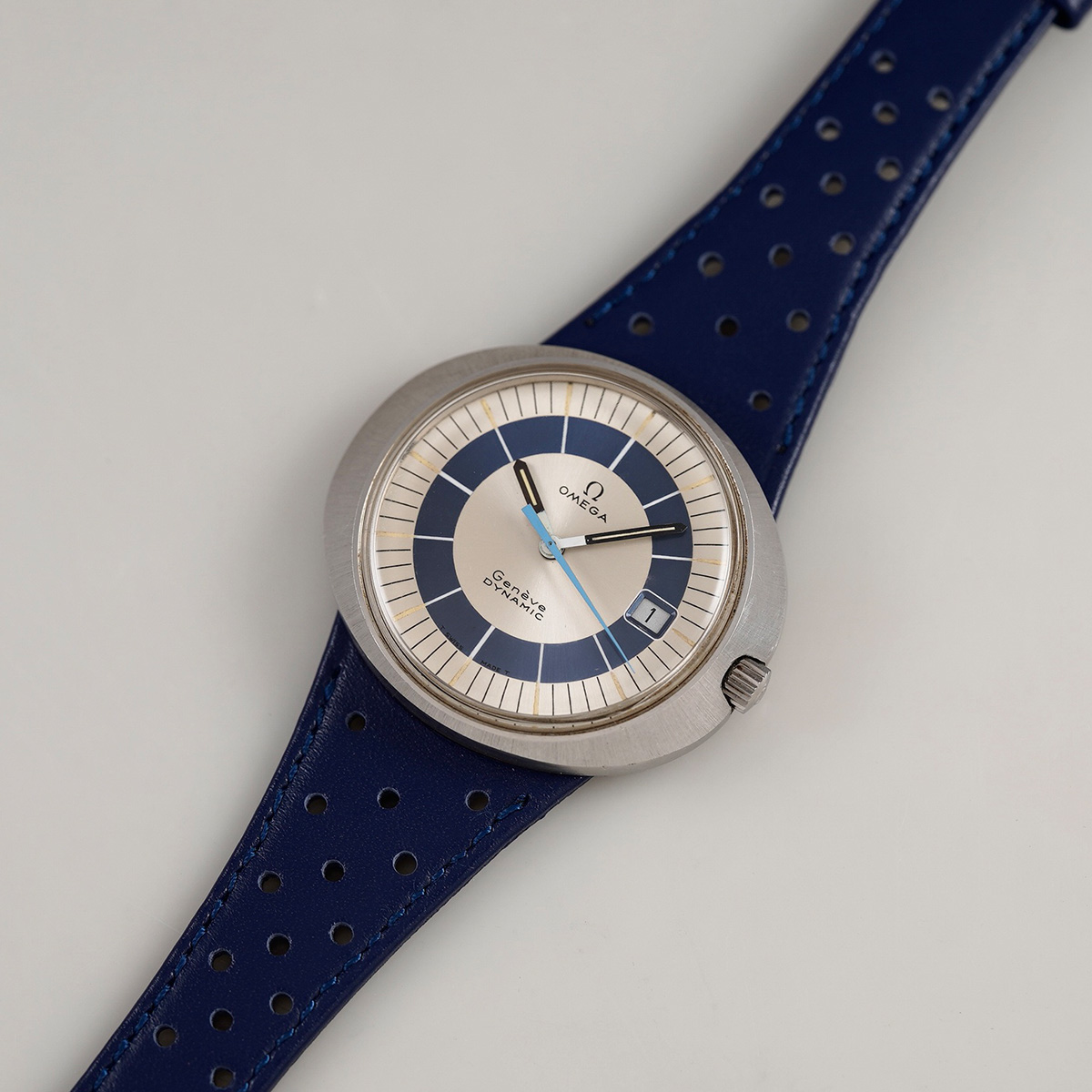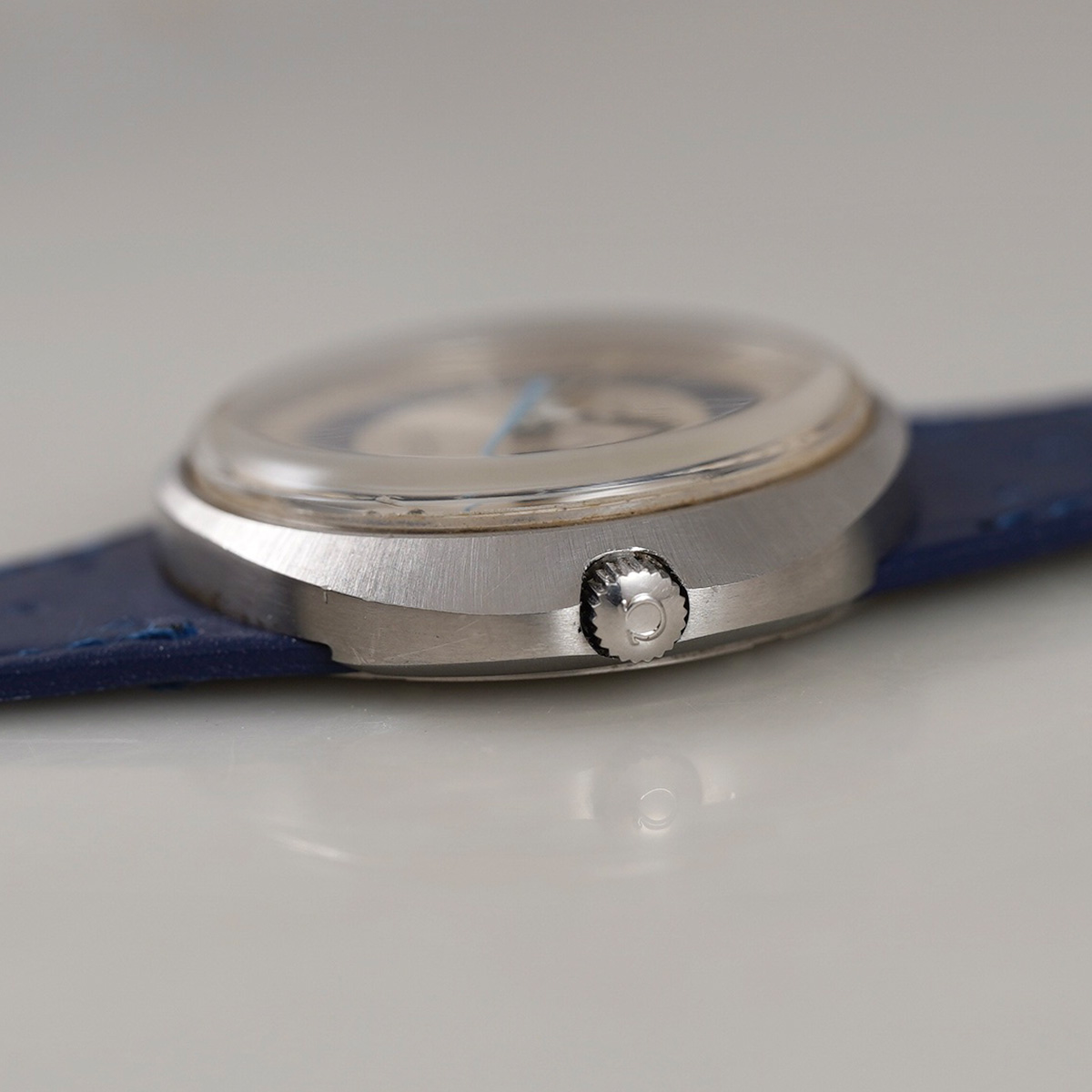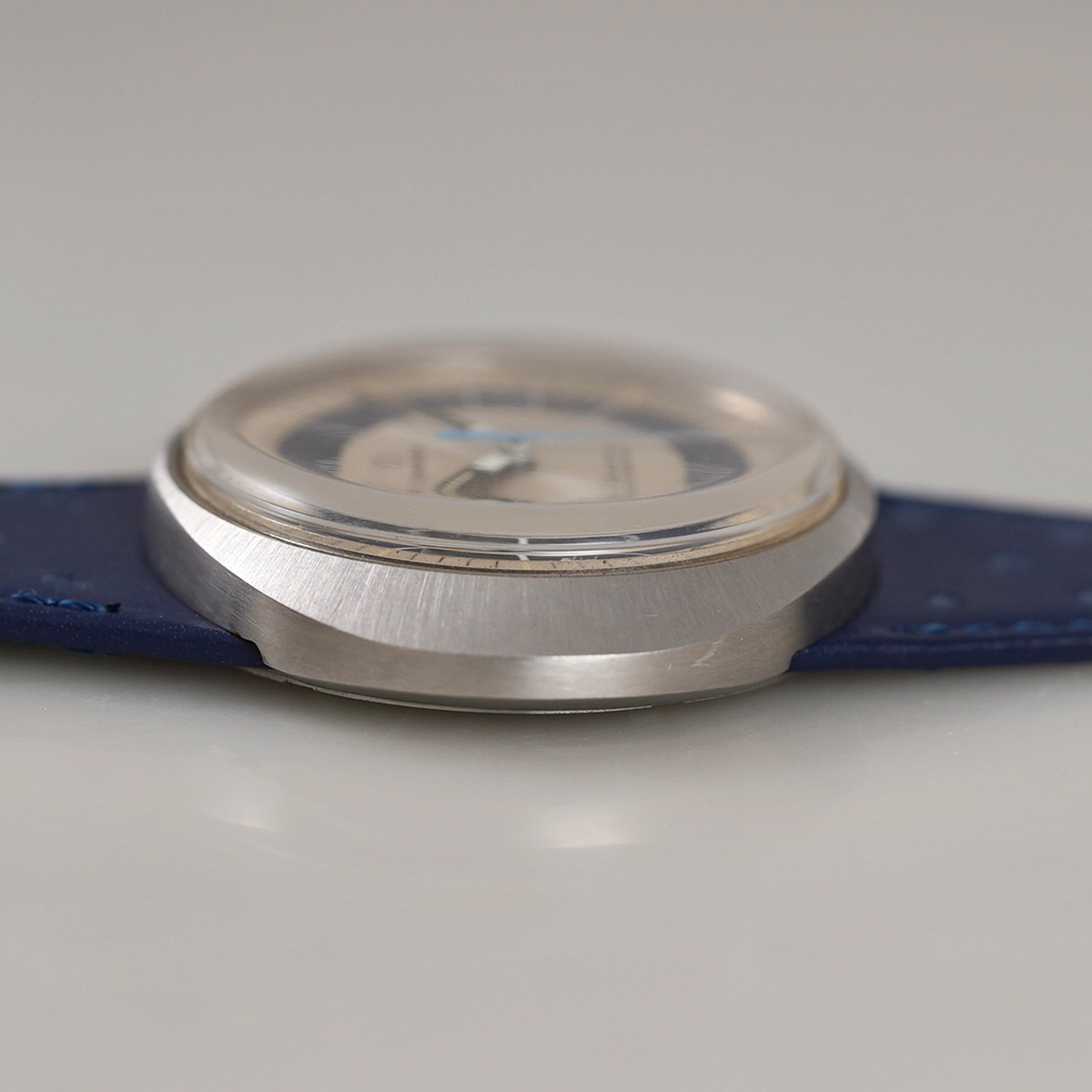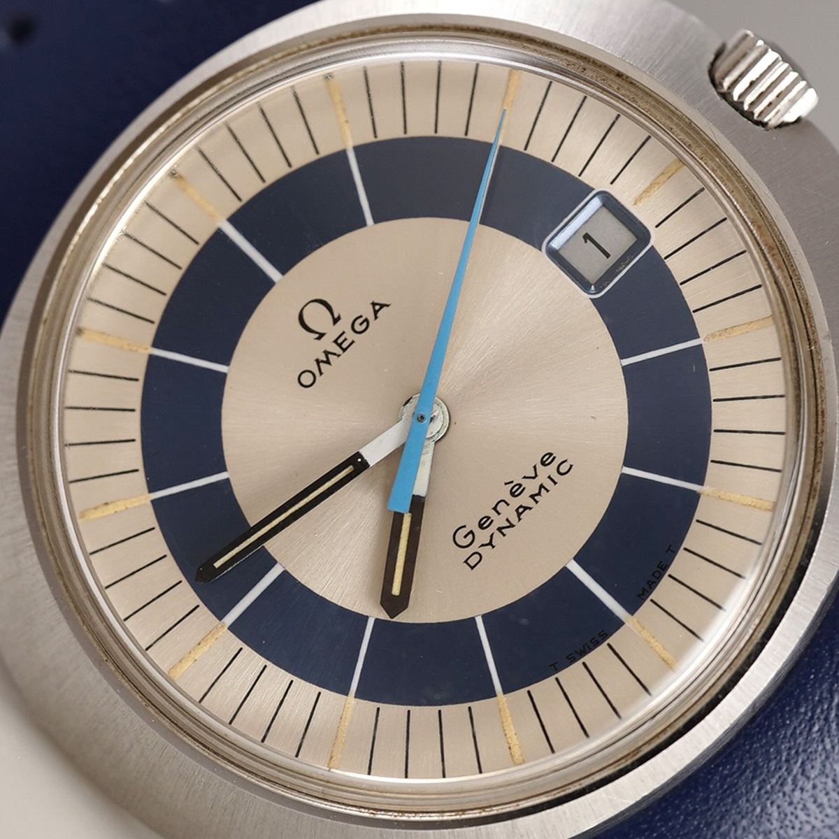 年代らしい特徴的な目を惹くデザインとして、昔から人気の高い「ジュネーブ・ダイナミック」。この時代のオメガ社を代表するモデルと言っても過言ではないかと思います。 ややエイジングの見られるオリジナルのツートンダイヤル、それぞれの針は概ねコンディション良好。 ケースは裏蓋一体型の防水性を高めたワンピース構造になっており、裏のスクリューリングを外すとケース本体とブレス(台座ごと)が分かれる他に類を見ない独特な設計を採用しています。 ムーブメントは手巻き式.cal613を搭載しています。 リューズを一段引いて針回し、その状態からさらに一段引き出すことにより(収まった状態から二段目)カレンダーの早送り機能となります。分解掃除を済ませ日差15秒程で稼働しております。当時からのオリジナル尾錠付き(革ベルトは後年社外オーダー革ベルトに交換しております)。 | |