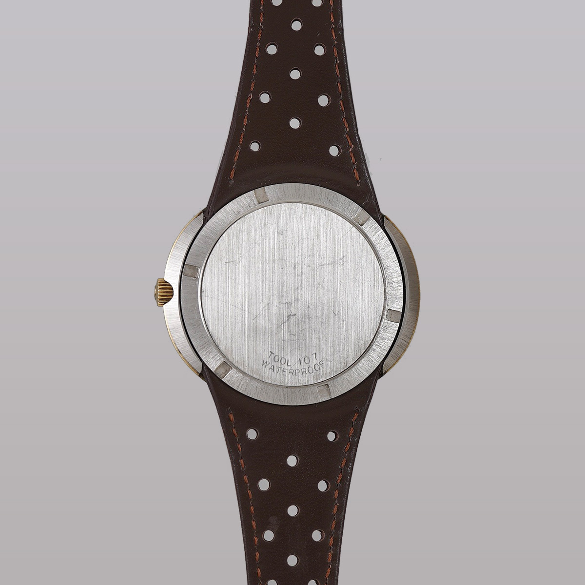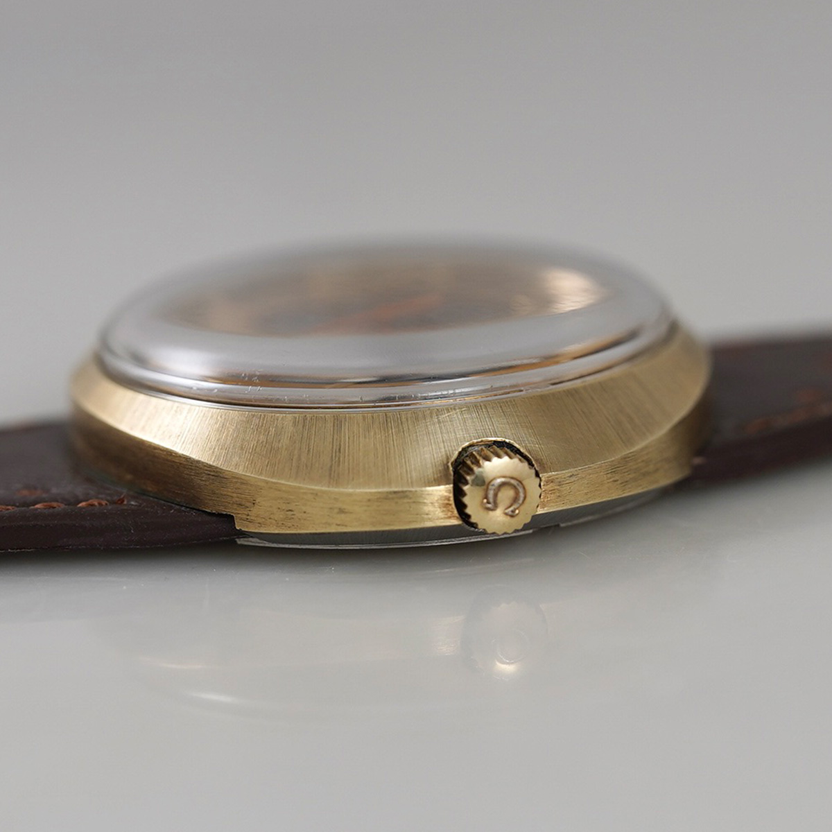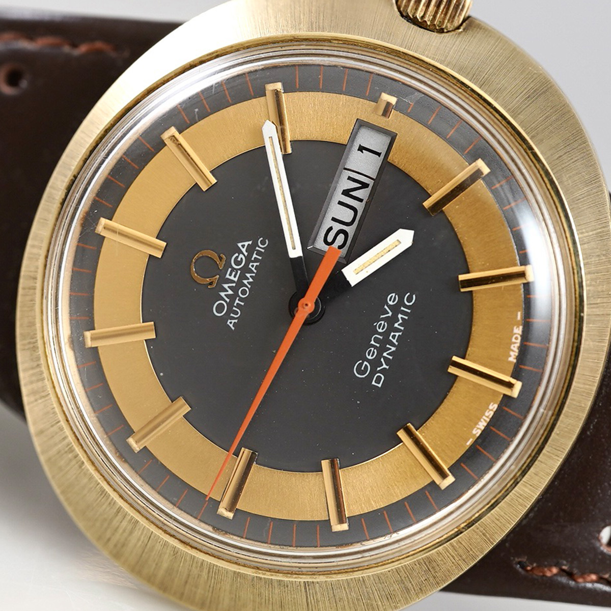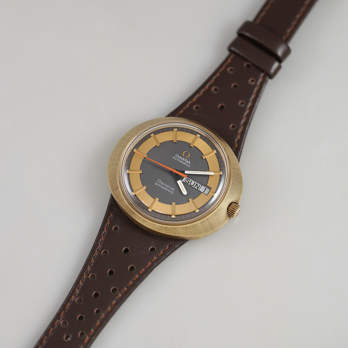 年代らしい特徴的な目を惹くデザインとして、昔から人気の高い「ジュネーブ・ダイナミック」のこちらは珍しいゴールド色ケース(GF x SS)タイプ。 この時代のオメガ社を代表するモデルと言っても過言ではないかと思います。 グレーベースのオリジナルのツートンダイヤルにゴールド巻きのサークルとインデックス、視認性も考えられたそれぞれの配色と絶妙な表情です。 文字盤、それぞれの針は概ねコンディション良好。 ケースは裏蓋一体型の防水性を高めたワンピース構造になっており、裏のスクリューリングを外すとケース本体とブレス(台座ごと)が分かれる他に類を見ない独特な設計を採用しています。 ムーブメントは自動巻式.cal752を搭載しています。 リューズを一段引いて針回し、その状態からさらに一段引き出すことにより(収まった状態から二段目)カレンダーの早送り機能となります。曜日のみの早送り機能はありません。 分解掃除を済ませ日差20秒程で稼働しております。 当時からのオリジナル尾錠付き(革ベルトは後年社外オーダー革ベルトに交換しております)。 | |