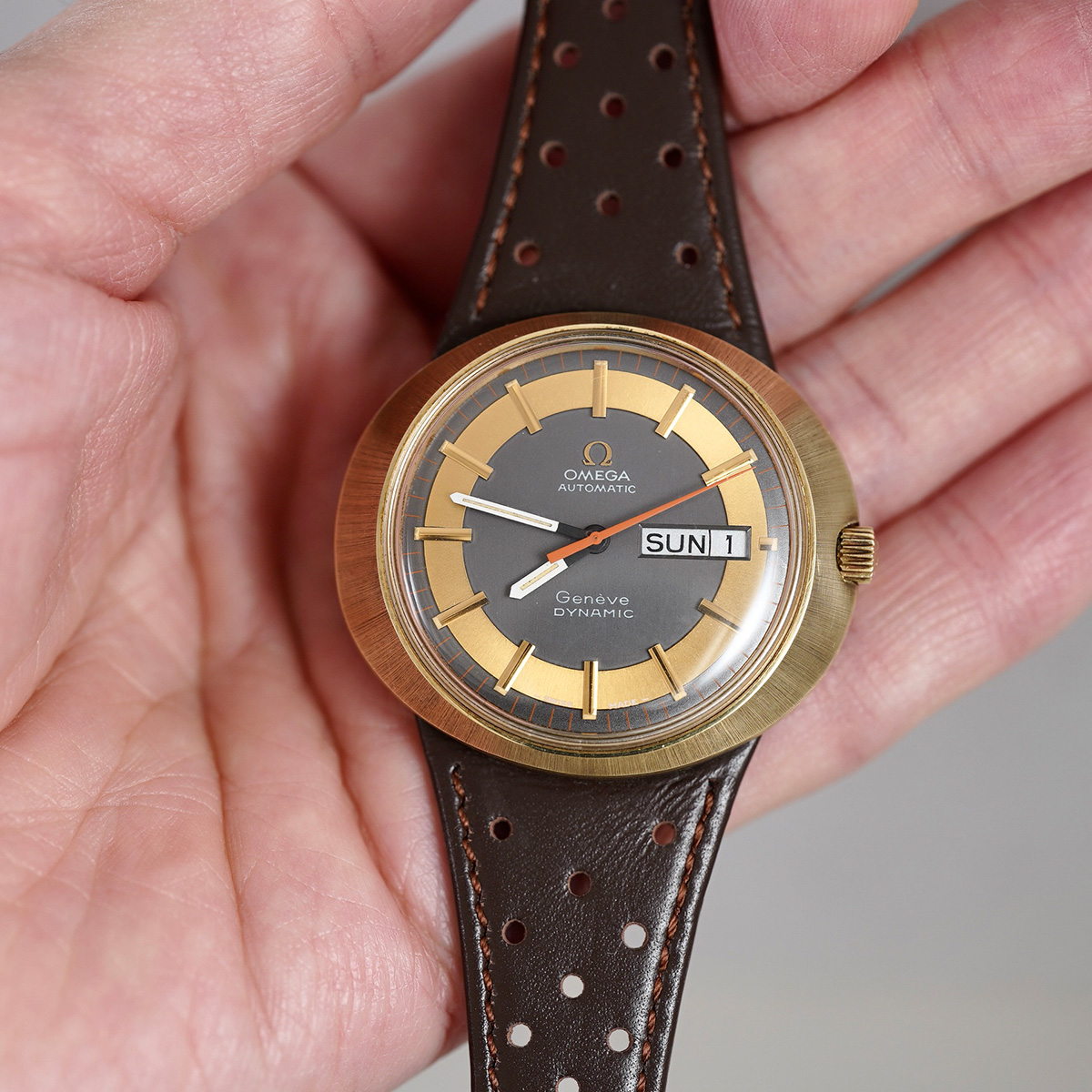 | Model | ジュネーブダイナミック 希少ゴールドxグレーダイヤル ST166.079 自動巻 1970年代製 純正尾錠付き |
