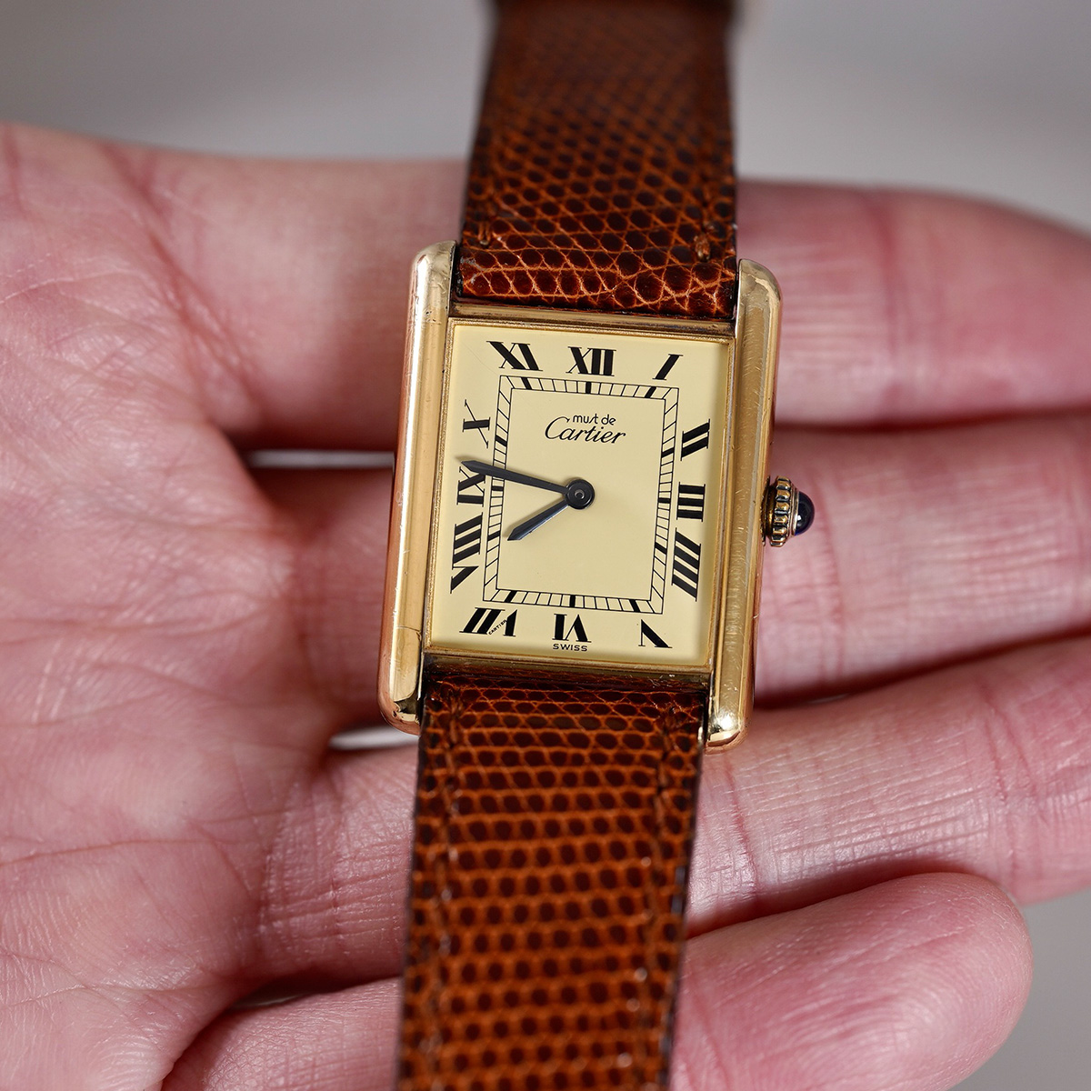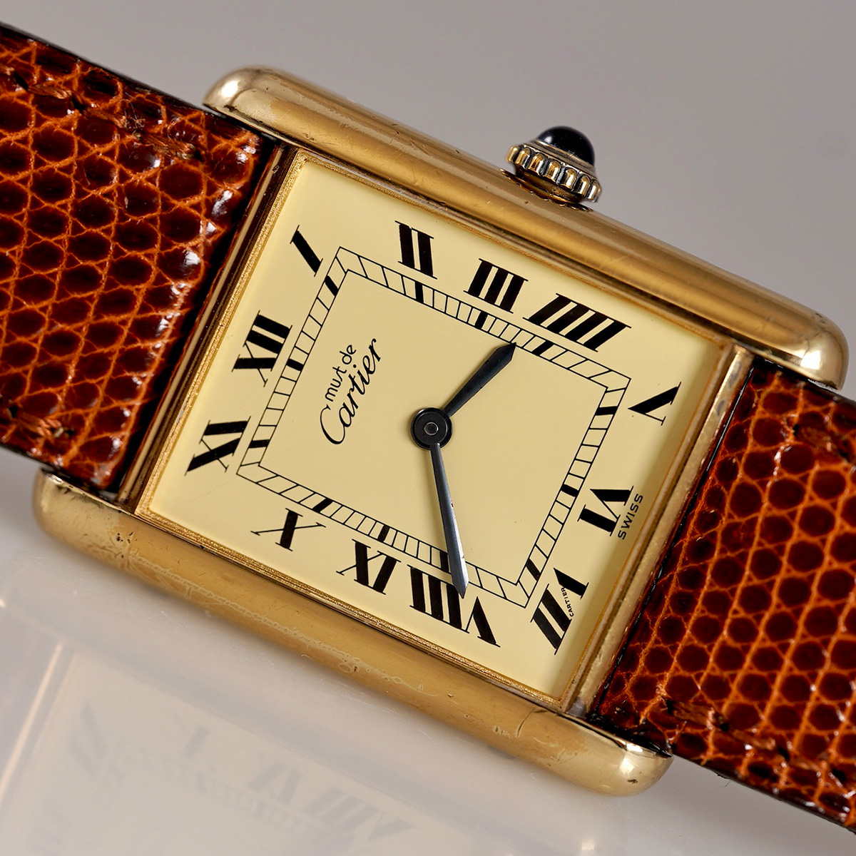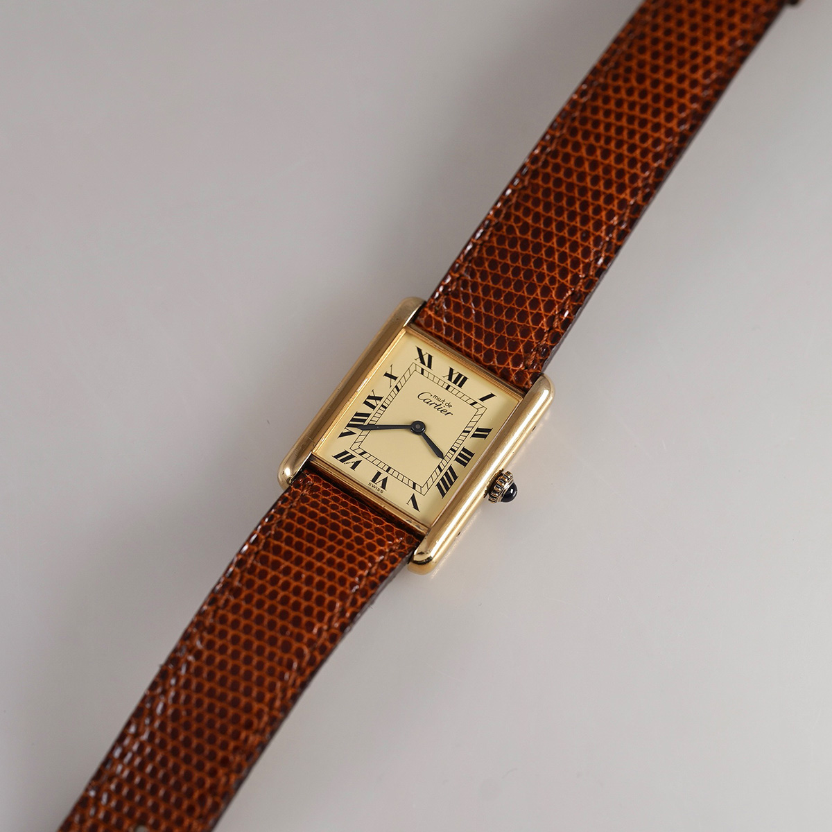 1919年誕生以来、継続して作り続けられるCARTIERの名作タンクから、1970年代から始まるディフュージョンラインであるマストシリーズの定番.アイボリーローマンダイヤル.LMサイズの手巻きになります。 外装ケースは<vermeil(ヴェルメイユ)>という、シルバーの上に厚く金を貼る加工技術が用いられ、手間とコストがかかっているため高級感を感じる仕上げ。 ケースに小傷はありますが、見苦しい箇所は無く、使用上は問題ありません。 同モデルの中でも非常人気の高い「マストタンク」と言ったらコレ!っと言う.アイボリーローマンスダイヤルです。 純正のローマン文字盤に目立つような痛みは見られません。 革ベルトと尾錠はカルティエ製の純正品が装着されています。 分解掃除を済ませ日差20秒程で稼働しております。 | |