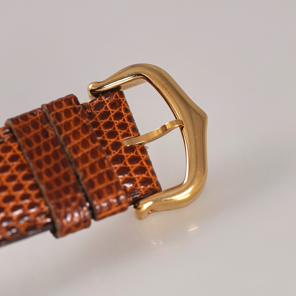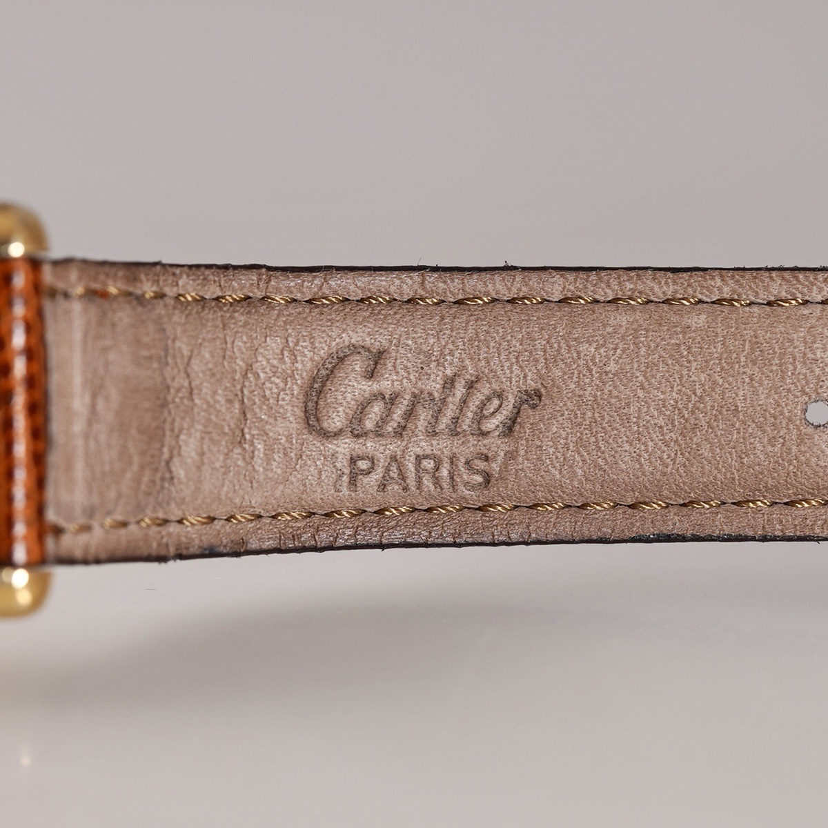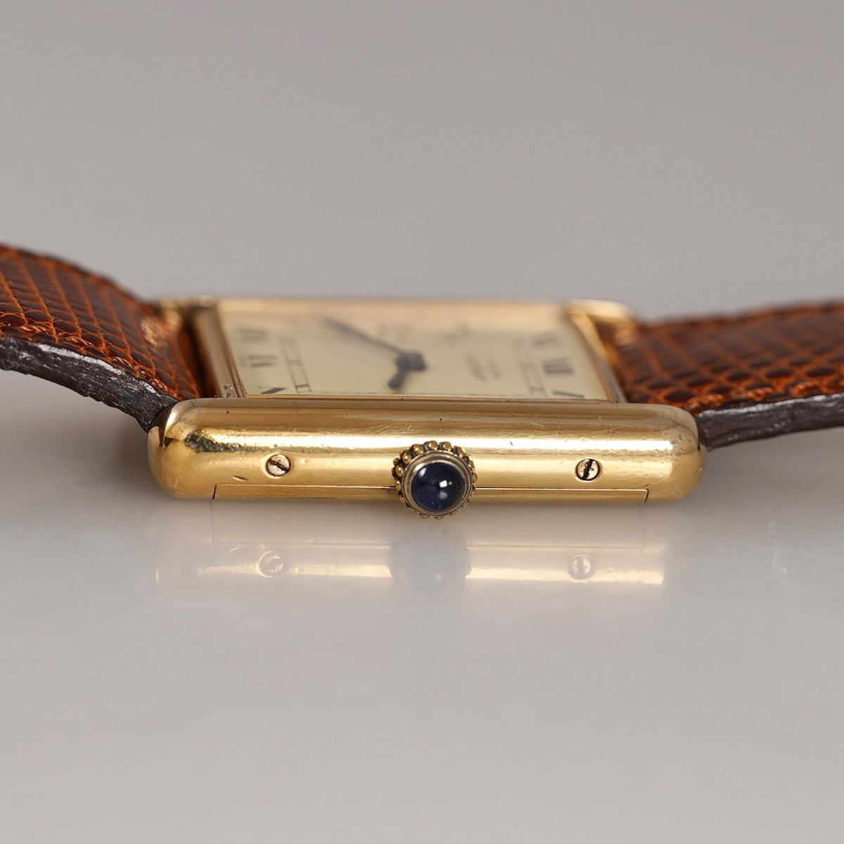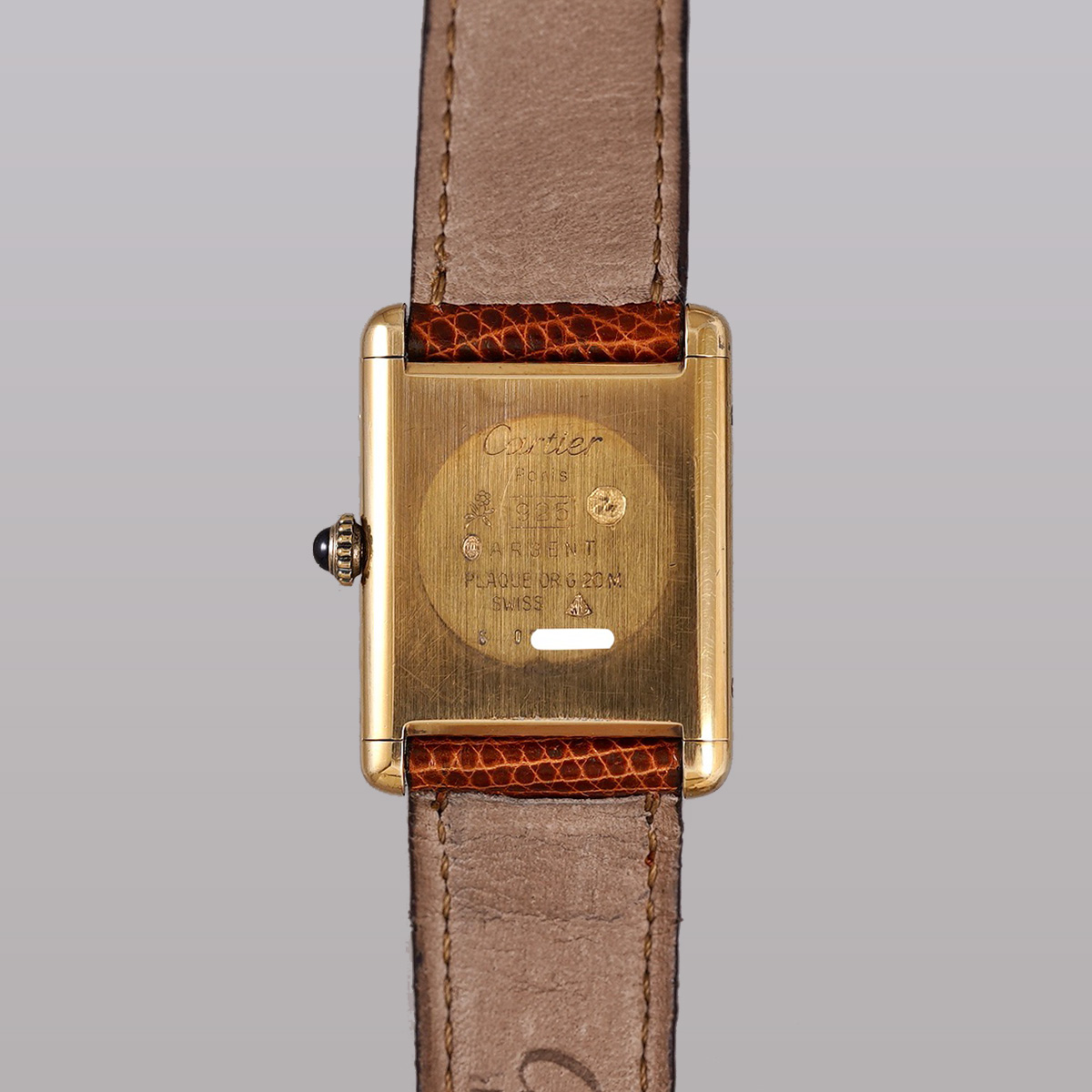 1919年誕生以来、継続して作り続けられるCARTIERの名作タンクから、1970年代から始まるディフュージョンラインであるマストシリーズの定番.アイボリーローマンダイヤル.LMサイズの手巻きになります。 外装ケースは<vermeil(ヴェルメイユ)>という、シルバーの上に厚く金を貼る加工技術が用いられ、手間とコストがかかっているため高級感を感じる仕上げ。 ケースに小傷はありますが、見苦しい箇所は無く、使用上は問題ありません。 同モデルの中でも非常人気の高い「マストタンク」と言ったらコレ!っと言う.アイボリーローマンスダイヤルです。 純正のローマン文字盤に目立つような痛みは見られません。 革ベルトと尾錠はカルティエ製の純正品が装着されています。 分解掃除を済ませ日差20秒程で稼働しております。 | |