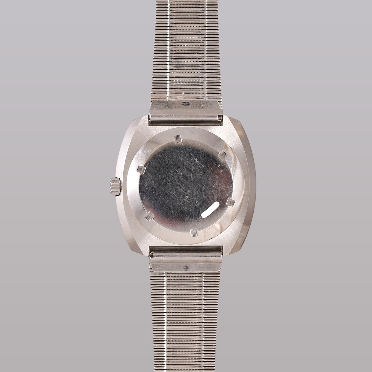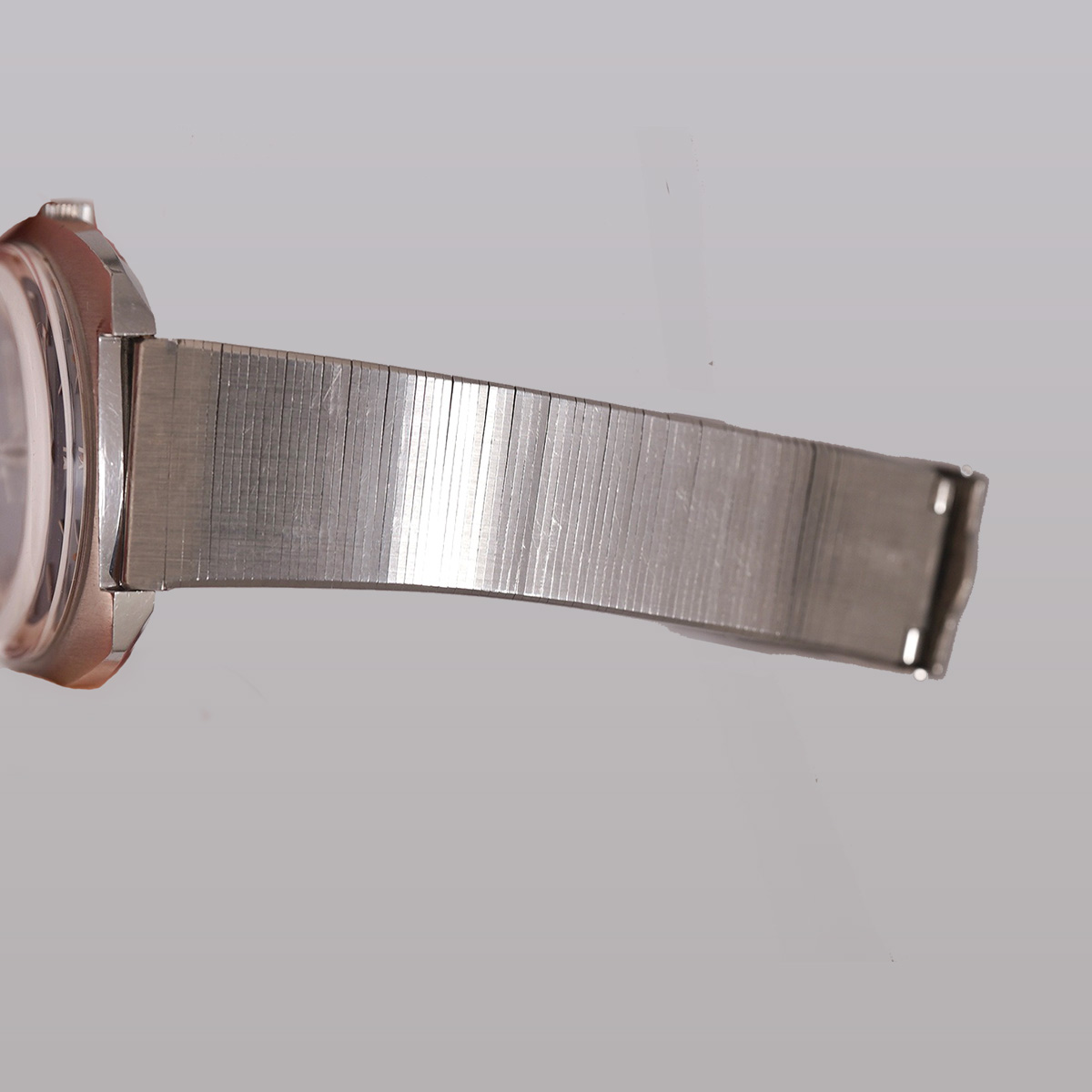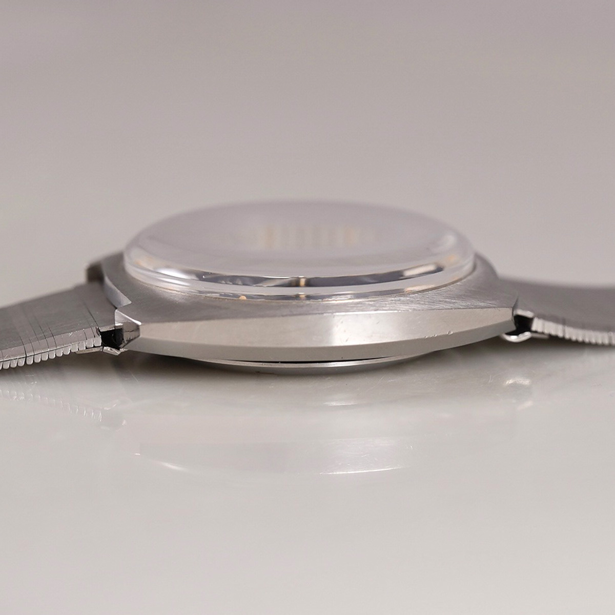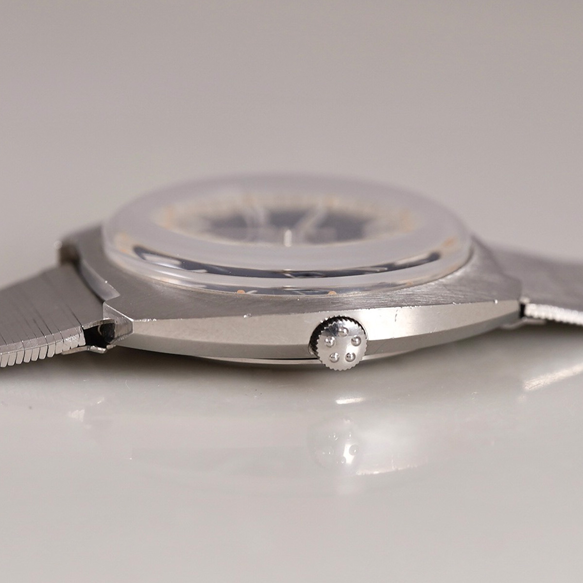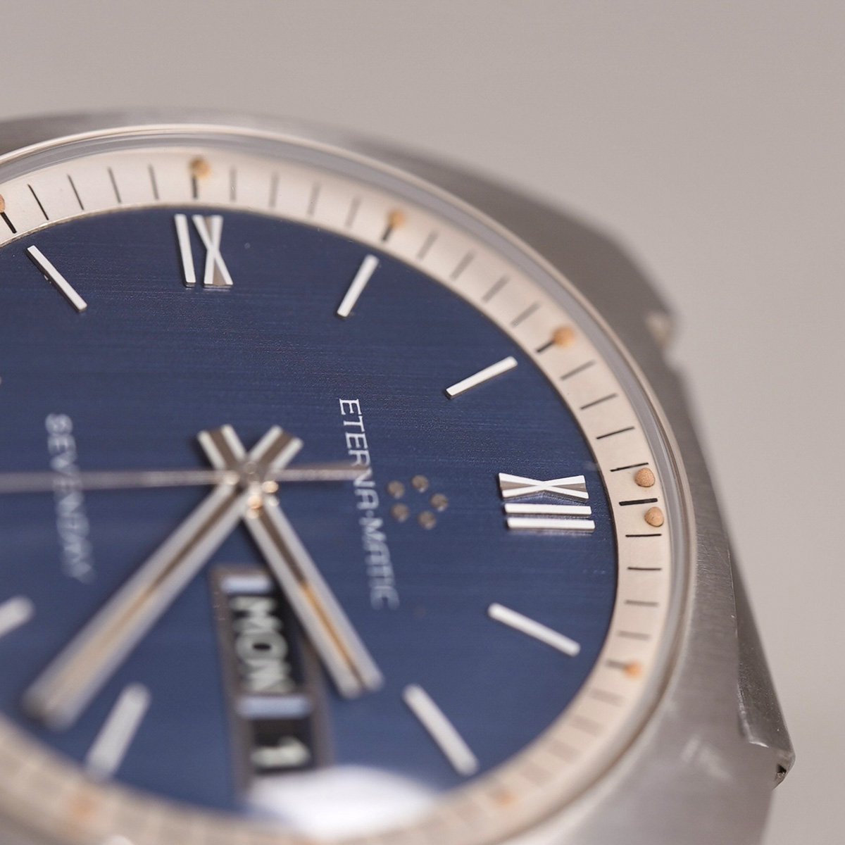 1970年代製、ETERNA(エテルナ)マチックのSEVENDAY。 濃いめのブルー文字盤はリネンのような仕上げになり、文字盤外周の白巻きミニッツメモリとアワーマーカーの白が映えるデザインです。 6、9、12時にはアップライドローマンインデックスを配し、視認性はもちろん爽やかな印象です。 モデル名にもなっているデイデイト(SEVENDAY:曜日機能付き)は黒盤に白字とこちらも実用性に富んだ仕様になります。 文字盤、それぞれの針、ケースとコンディション良好です。 クッションケースは腕乗りが良くデザインになっています。 社外品にはなりますが、年式の近いステンレス製のブレスをセレクト。 分解掃除を済ませ日差15秒程で稼働しております。 | |