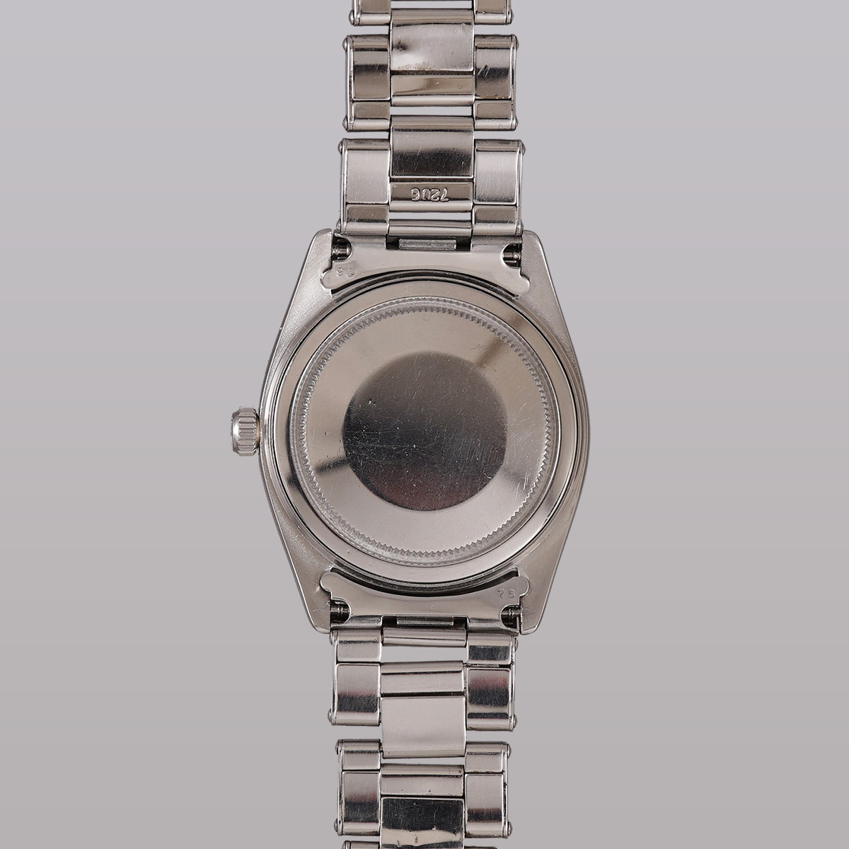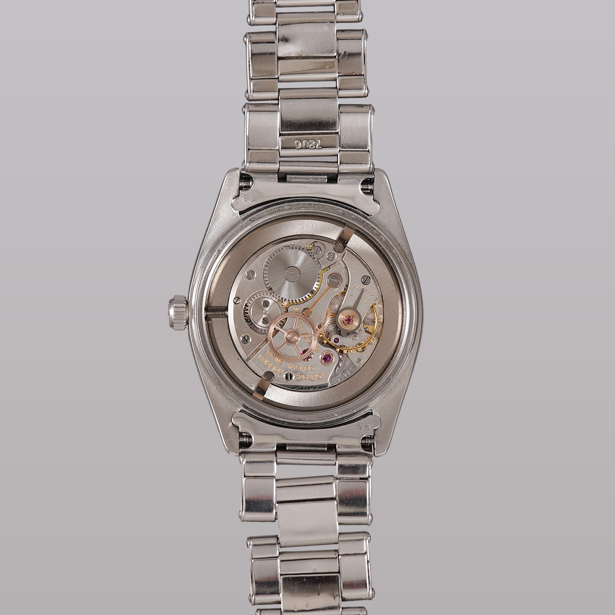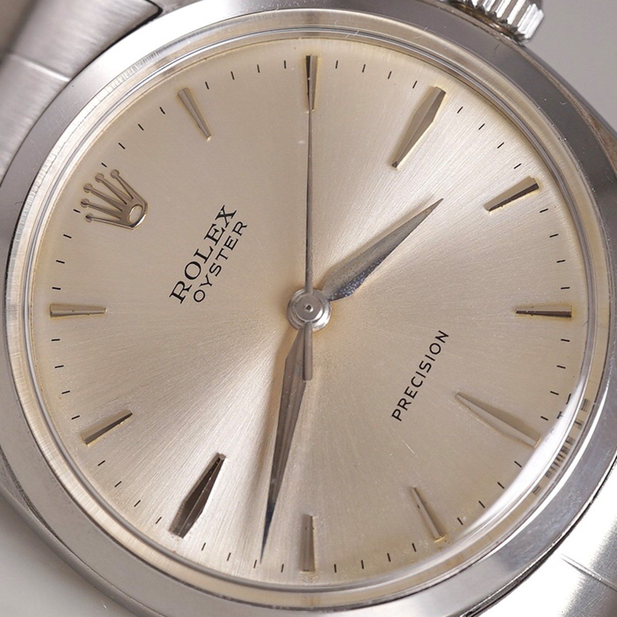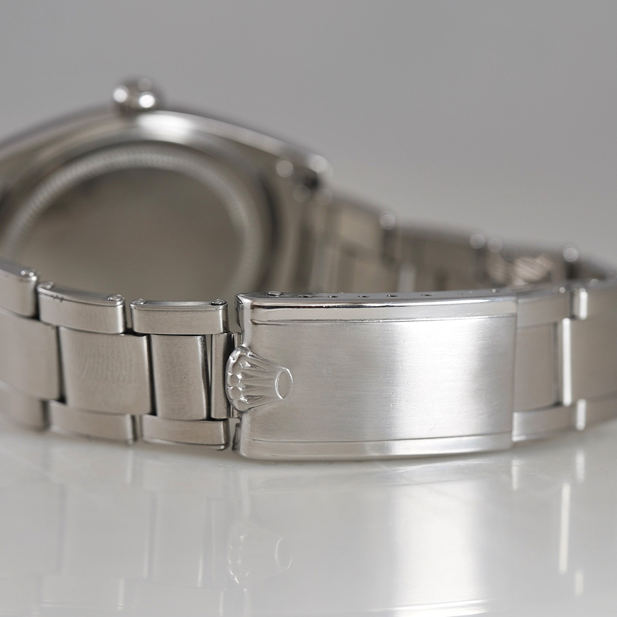 ロレックスのオイスター Ref.6424、 通称「ビッグオイスター」と呼ばれ、通常よりやや大きめケースに収められた一本。 手巻きムーブメントを搭載し、厚みが10mmとなり腕乗りが良い印象です。 エイジングの見られるサンバースト仕上げの文字盤には、先の尖ったアルファ針がセットされ、1964-65年製(シリアルナンバー参照)らしい、ヴィンテージ感があります。 さらに、インデックスは多面カットのクサビで、3,6,9時はサイズを大きくしたダイヤモンドタイプが配されています。文字盤6時位置を見ますと「- T SWISS - T 」表記の中央「 ~WIS~ 」部が6時位置のインデックス側に引っ張られたように見られる、通称「Sing a Song」ダイヤル。同モデルのディテールとして、上記のアルファ針+ダイヤモンドインデックス+Sing a Song ダイヤルの組み合わせはかなりレアな個体かと思います。 ケース径に伴いブレスレットは20mm幅の本体と年式の整合性のとれたリベットオイスターブレスレットFF75 - 7206(65年.1期)が装着されています。分解掃除を済ませ日差10秒程で稼働しております。 | |