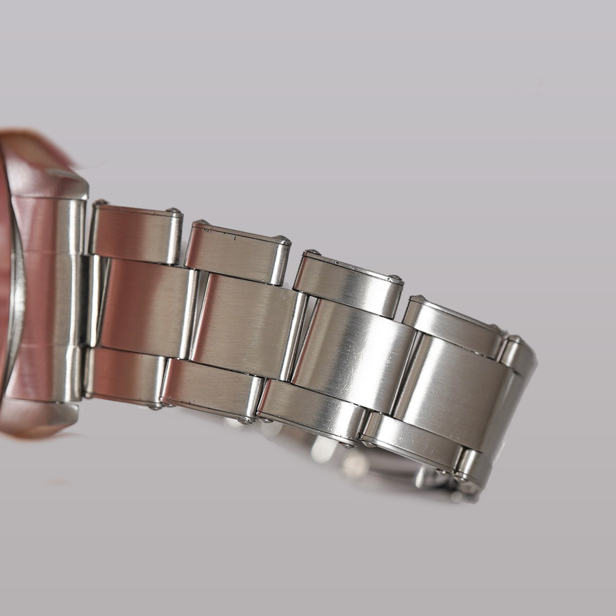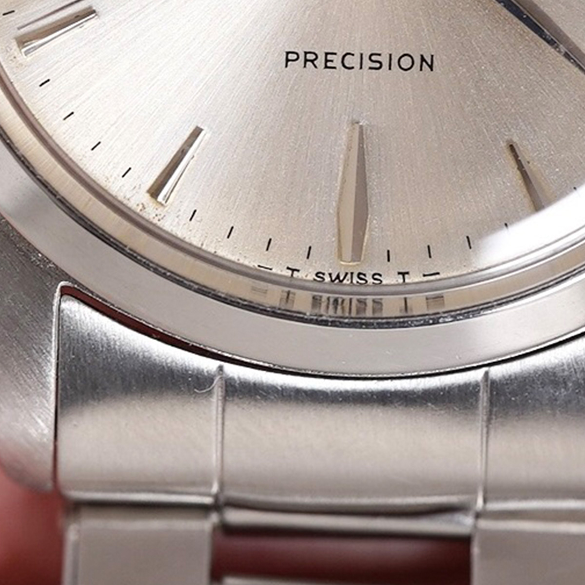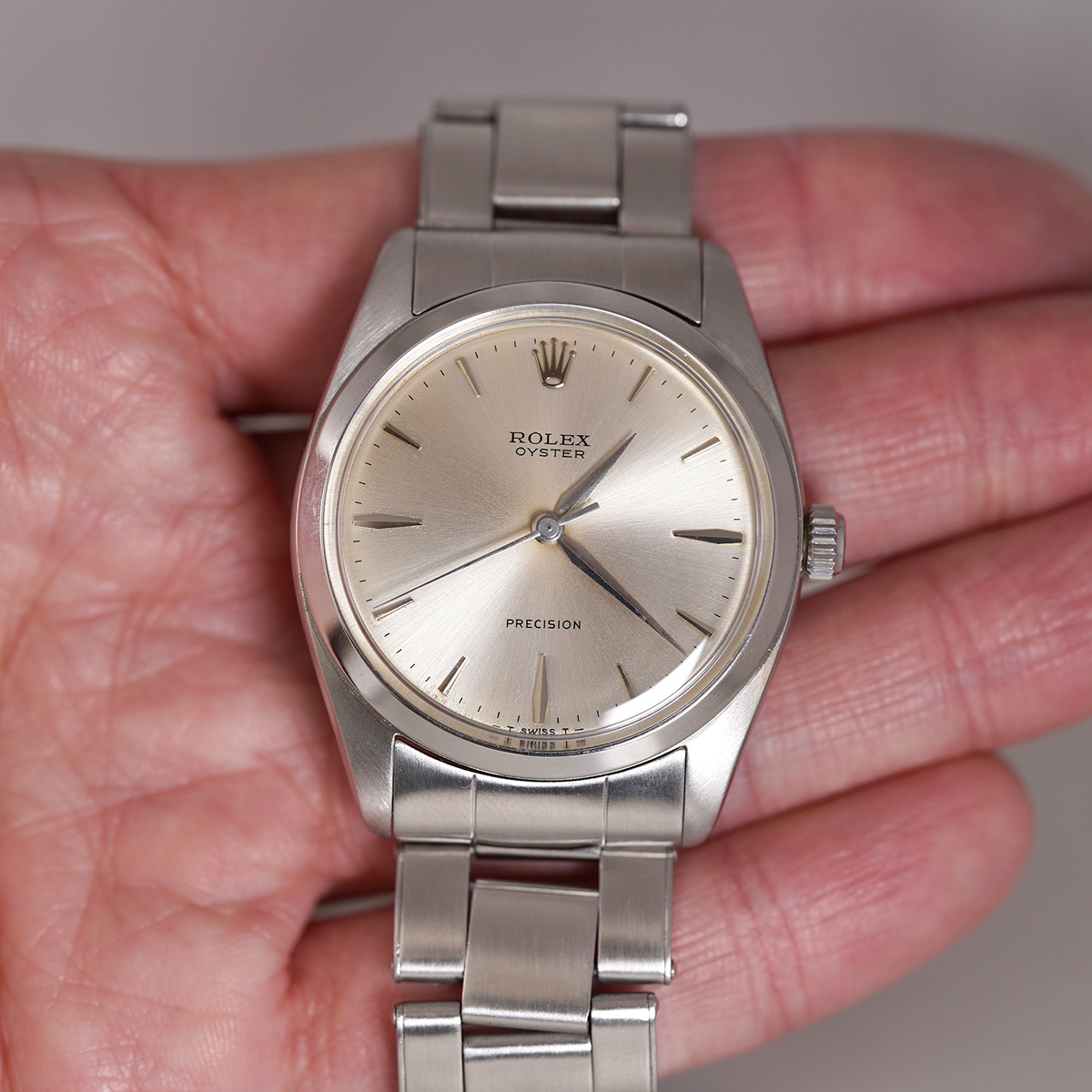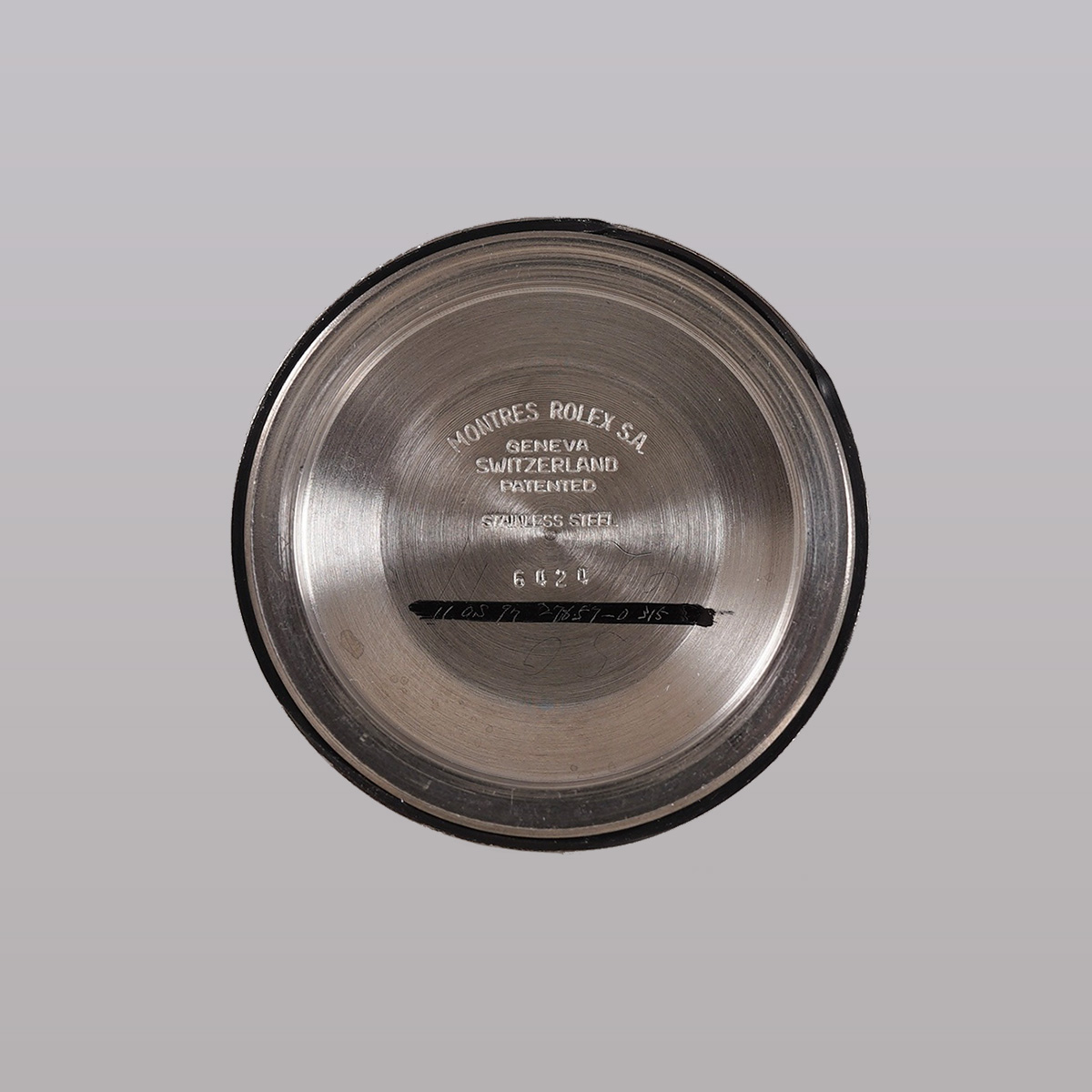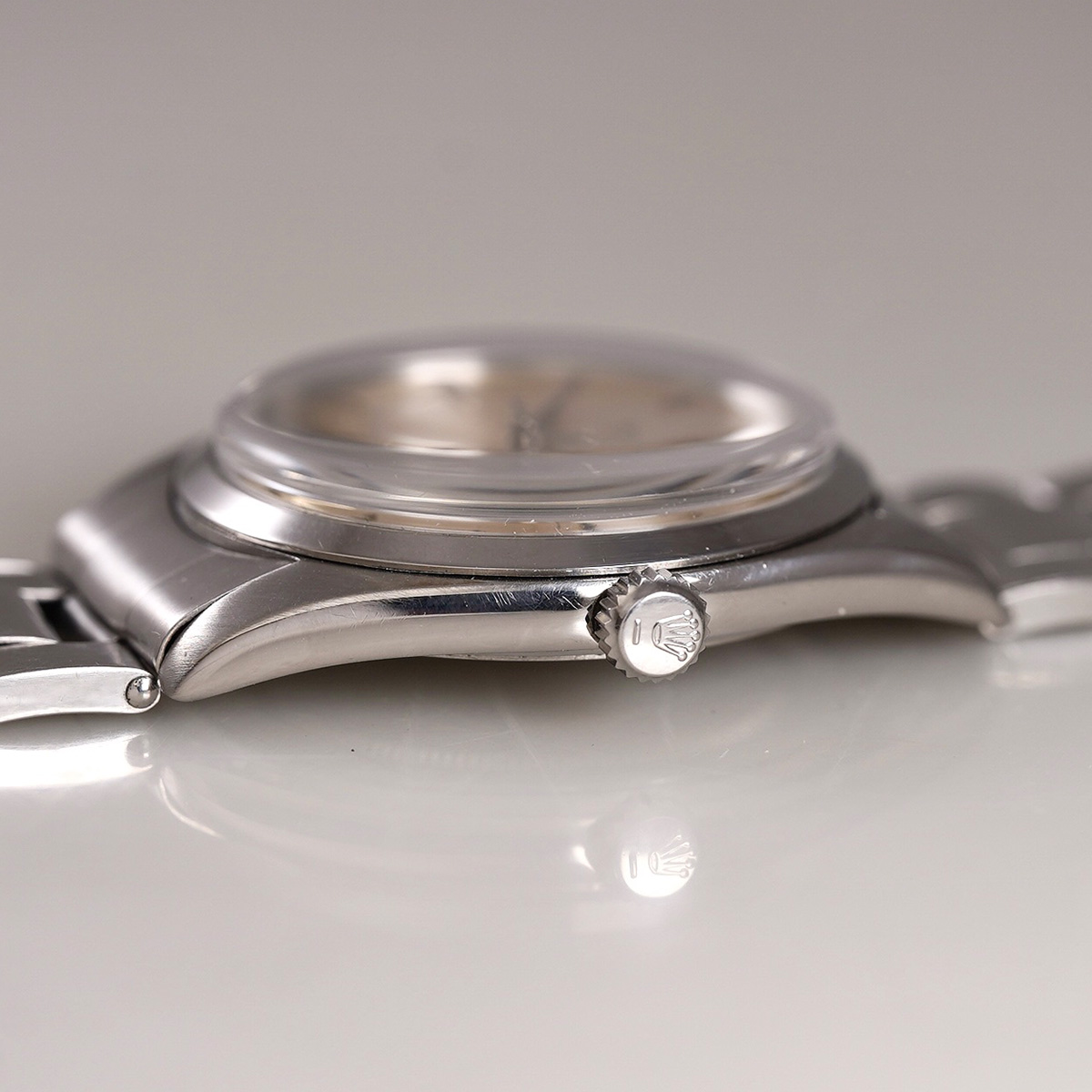 ロレックスのオイスター Ref.6424、 通称「ビッグオイスター」と呼ばれ、通常よりやや大きめケースに収められた一本。 手巻きムーブメントを搭載し、厚みが10mmとなり腕乗りが良い印象です。 エイジングの見られるサンバースト仕上げの文字盤には、先の尖ったアルファ針がセットされ、1964-65年製(シリアルナンバー参照)らしい、ヴィンテージ感があります。 さらに、インデックスは多面カットのクサビで、3,6,9時はサイズを大きくしたダイヤモンドタイプが配されています。文字盤6時位置を見ますと「- T SWISS - T 」表記の中央「 ~WIS~ 」部が6時位置のインデックス側に引っ張られたように見られる、通称「Sing a Song」ダイヤル。同モデルのディテールとして、上記のアルファ針+ダイヤモンドインデックス+Sing a Song ダイヤルの組み合わせはかなりレアな個体かと思います。 ケース径に伴いブレスレットは20mm幅の本体と年式の整合性のとれたリベットオイスターブレスレットFF75 - 7206(65年.1期)が装着されています。分解掃除を済ませ日差10秒程で稼働しております。 | |