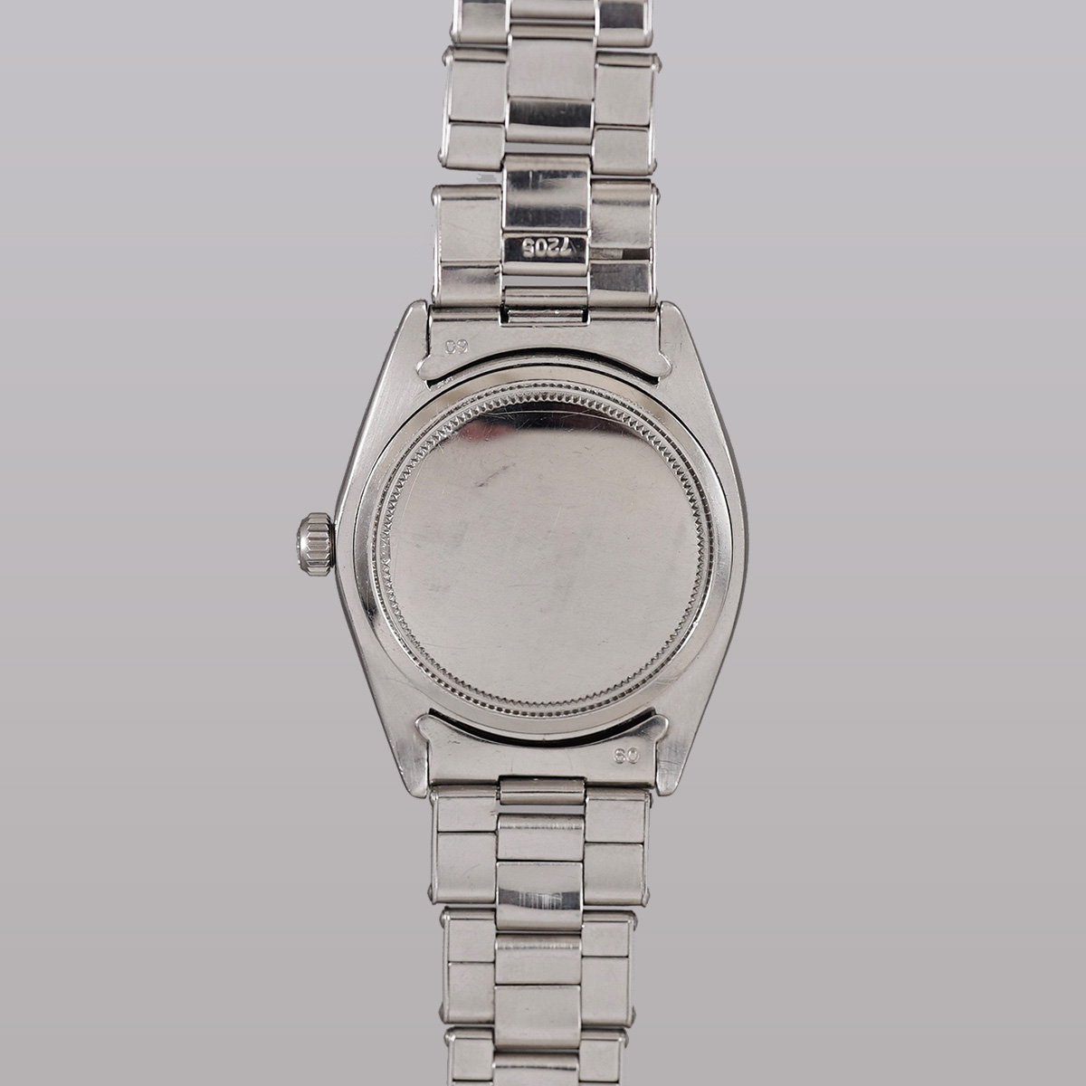 1964年製造のオイスターデイト(裏蓋:6694 / IV.64)になります。 こちらの個体は、色の付いたカラーダイヤルの中でも特に人気の高い、艶有り黒文字盤(ミラーブラックダイヤル)にゴールド色のロレックス王冠マーク、先の尖ったインデックス+アルファ針・秒針、ゴールドレター(金文字)の組み合わせになります。 オリジナルのミラーブラック文字盤は、わずかにくすみが見られる箇所がありますが、艶感を多分に残したコンディション。 サイズ感も非常によく、フォーマルでも、カジュアルでも、シーンを選ばず、幅広く愛用出来るモデルです。 昨今、極端に減少しているオリジナルの“色付きダイヤル”なので、気に入ったら早めの決断をオススメします。 多少の小傷はありますが、FF60-7205 / 1960年代製の純正.リベットブレス(3連ブレス)を装着。 分解掃除を済ませ日差10秒程で稼働しております。 | |