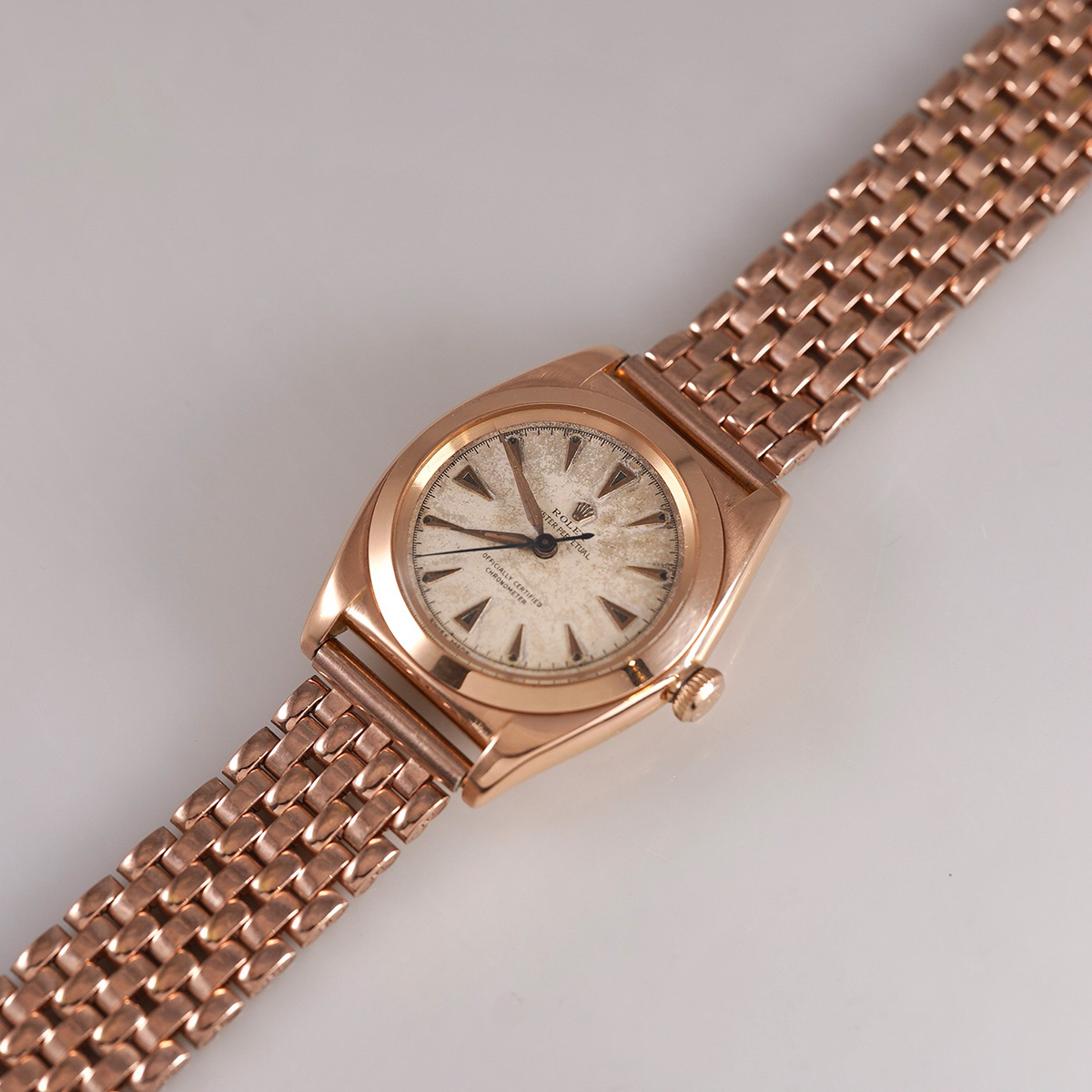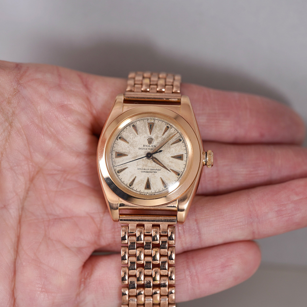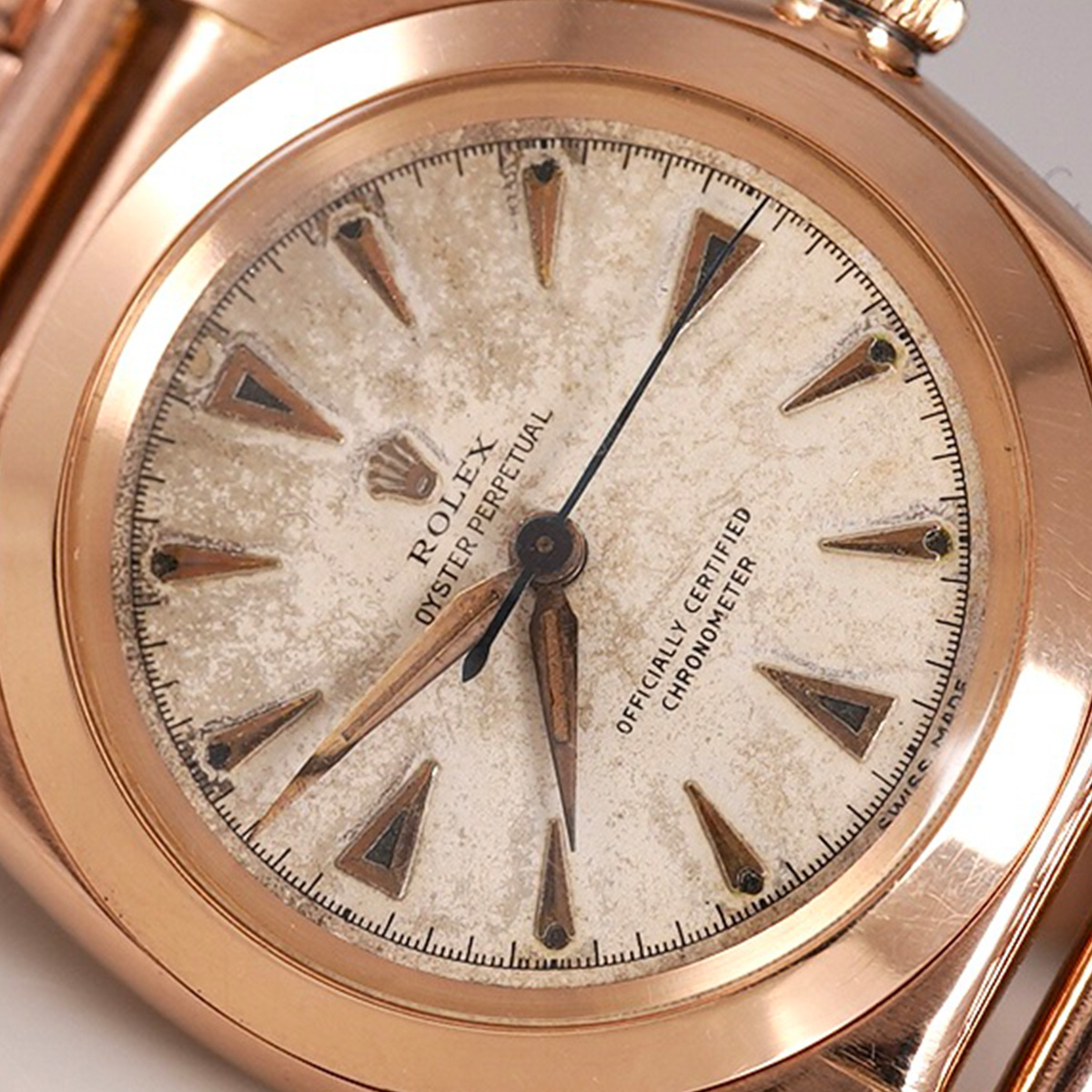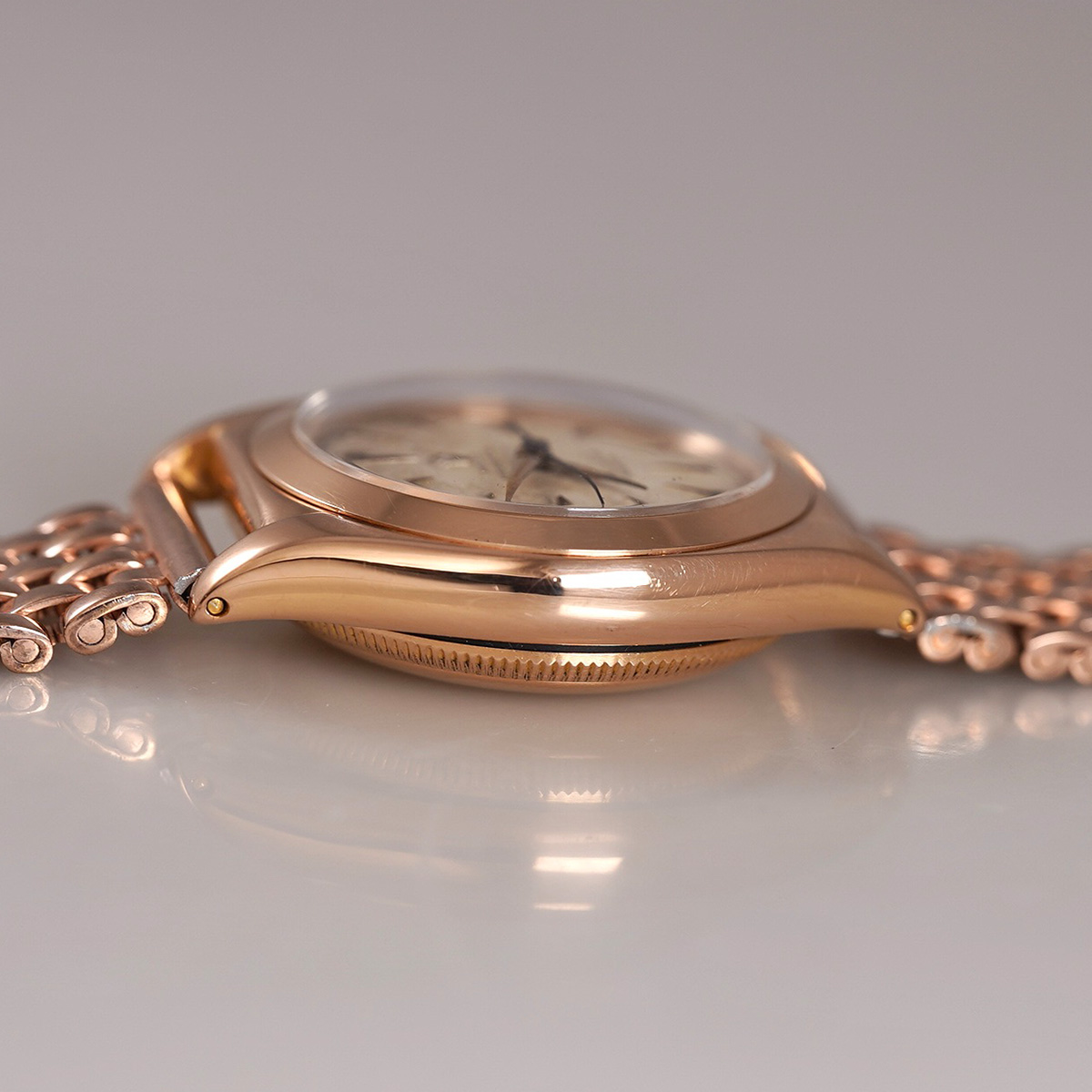 1940-50年代頃の、珍しい18金ローズゴールド(ピンクゴールド無垢)の通称:バブルバック、Ref.3131。エイジングの見られるオフホワイトの文字盤に、楔形+三角インデックスを配し、アルファ針とブルースチール秒針のセンターセコンドは、自動巻機構と相まって年代らしい印象です。 レアなローズゴールド製の外装ケースは、裏蓋の膨らみと、ケースサイドのホールマークが読み取れる程度のフォルムを残しています。 プライベートアイズ社製.ブレスを装着(腕周り:〜20cmほどまで装着可能)。分解掃除を済ませ日差30秒程で稼働しております。 | |