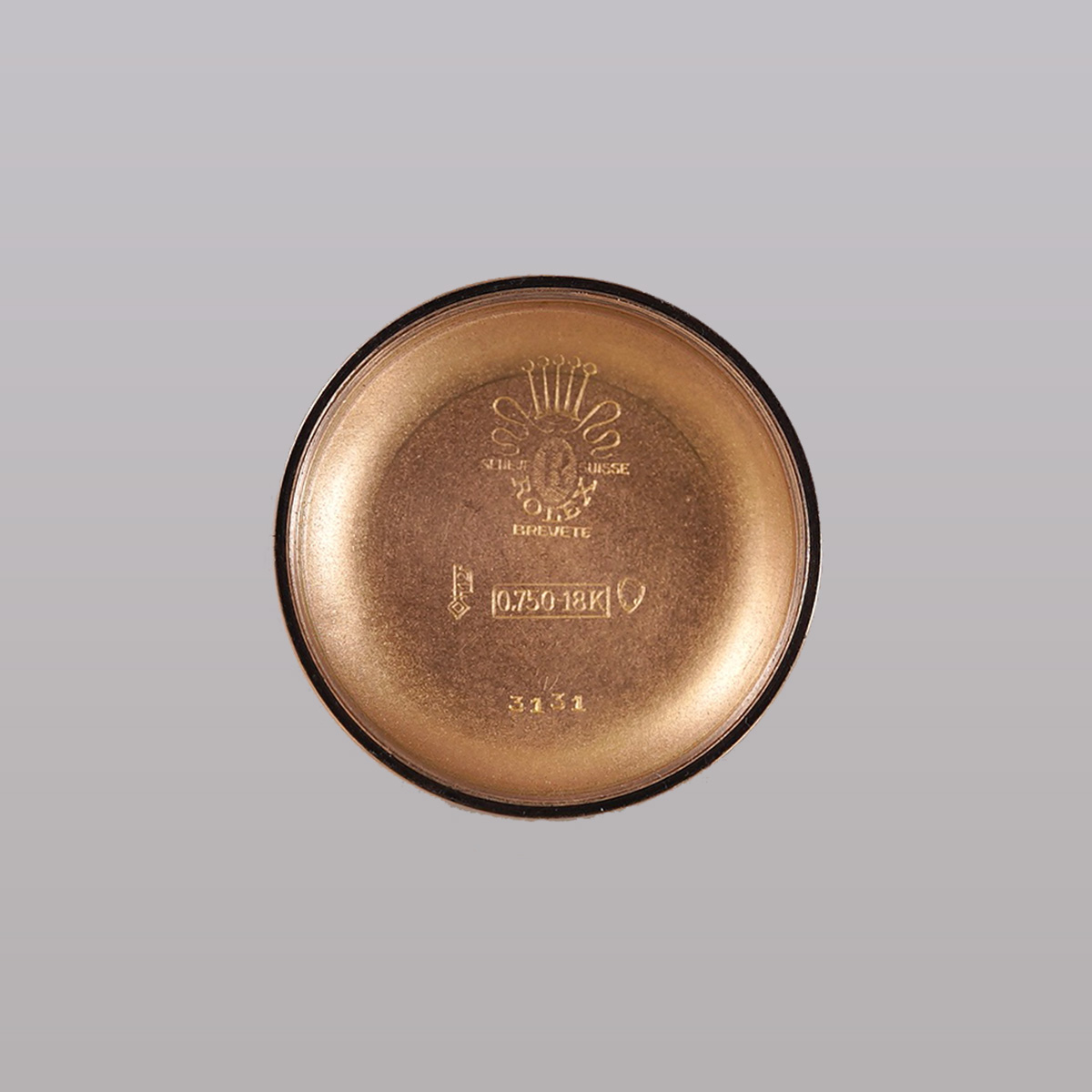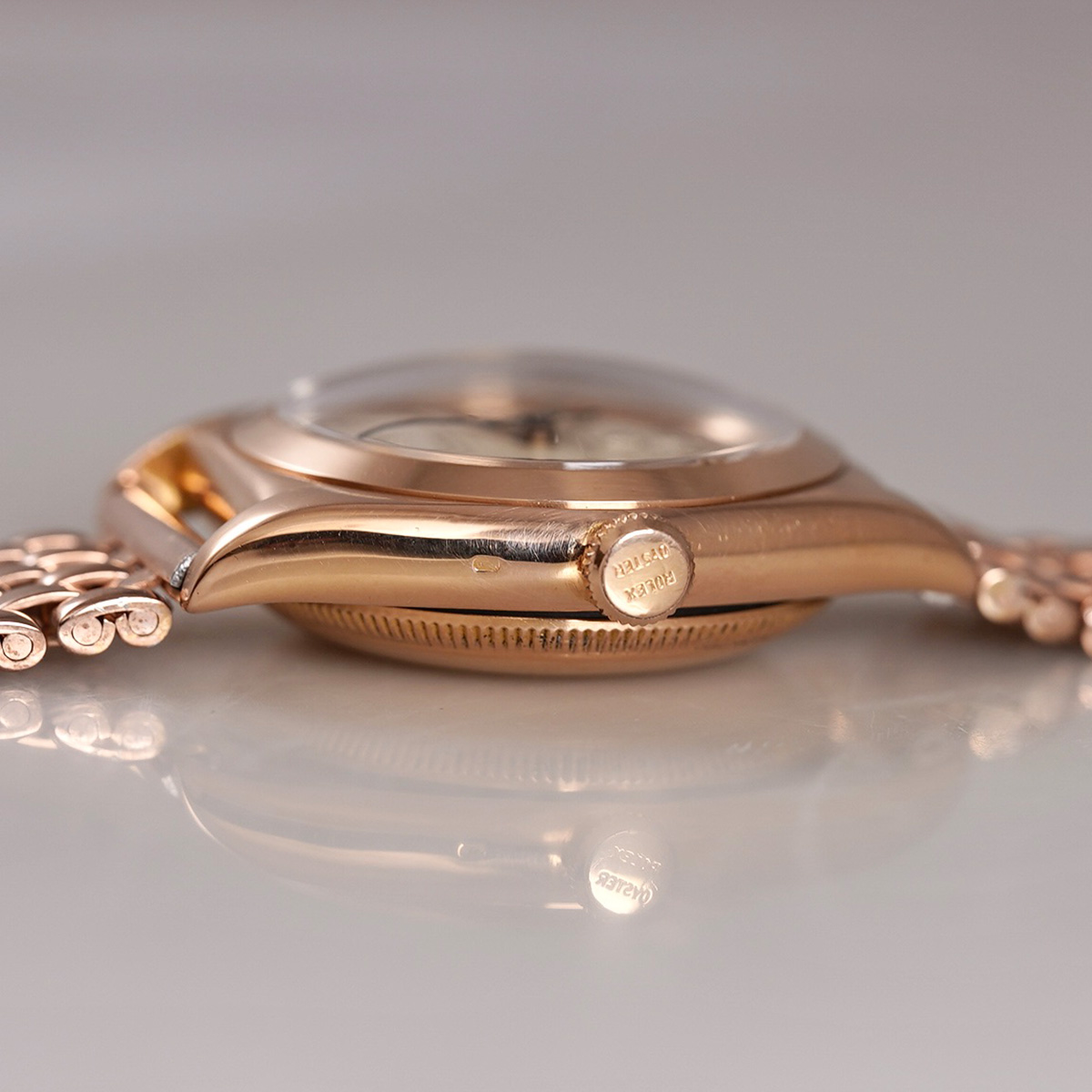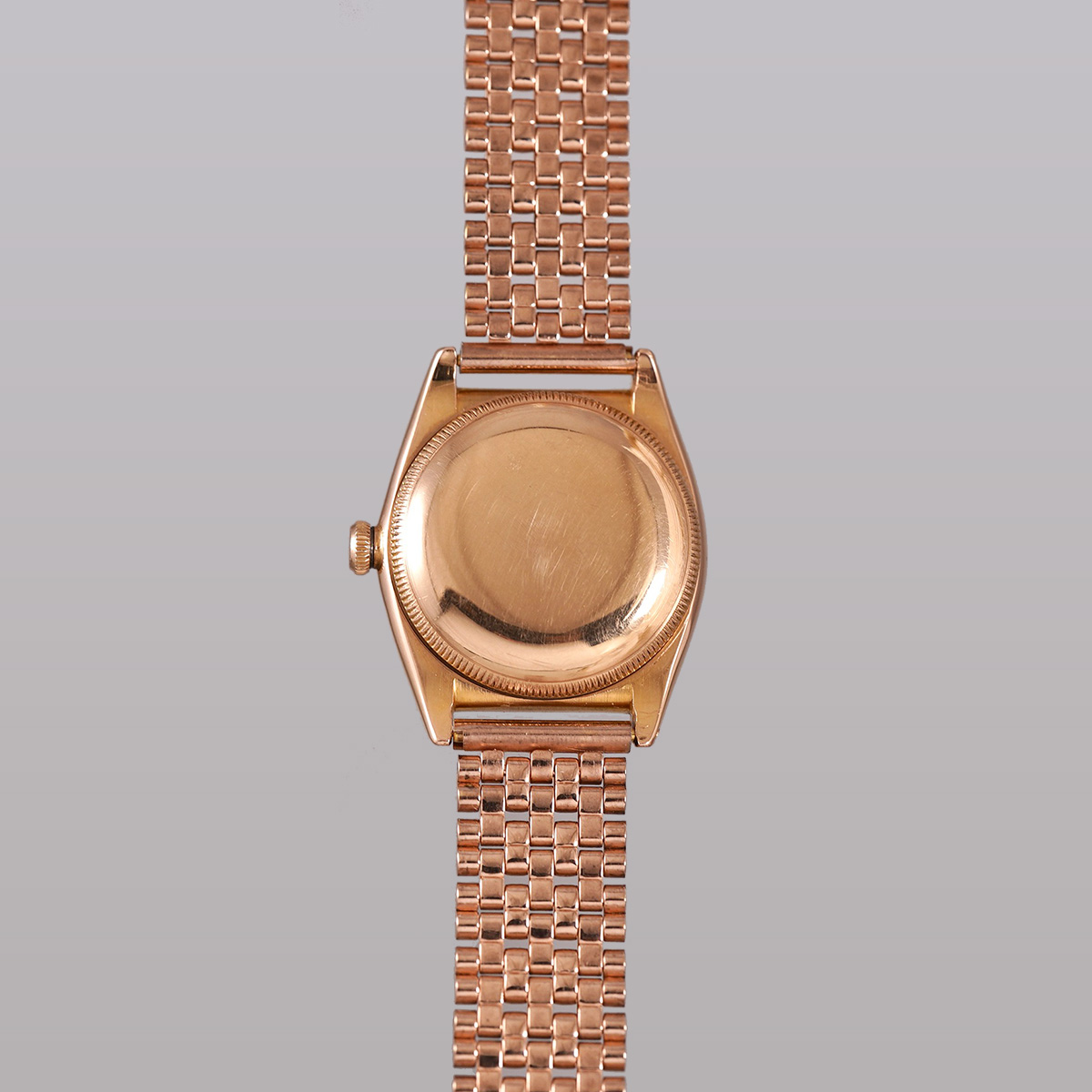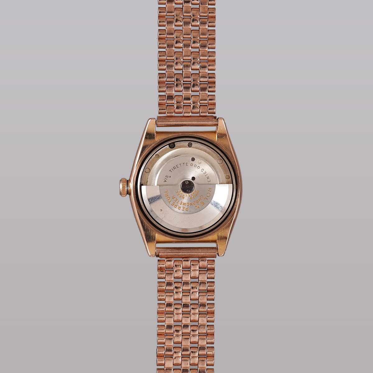 1940-50年代頃の、珍しい18金ローズゴールド(ピンクゴールド無垢)の通称:バブルバック、Ref.3131。エイジングの見られるオフホワイトの文字盤に、楔形+三角インデックスを配し、アルファ針とブルースチール秒針のセンターセコンドは、自動巻機構と相まって年代らしい印象です。 レアなローズゴールド製の外装ケースは、裏蓋の膨らみと、ケースサイドのホールマークが読み取れる程度のフォルムを残しています。 プライベートアイズ社製.ブレスを装着(腕周り:〜20cmほどまで装着可能)。分解掃除を済ませ日差30秒程で稼働しております。 | |