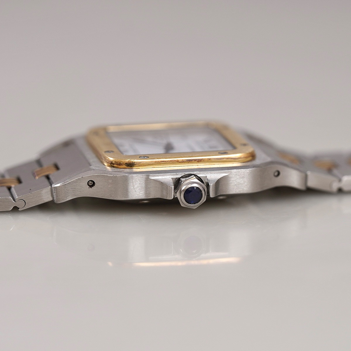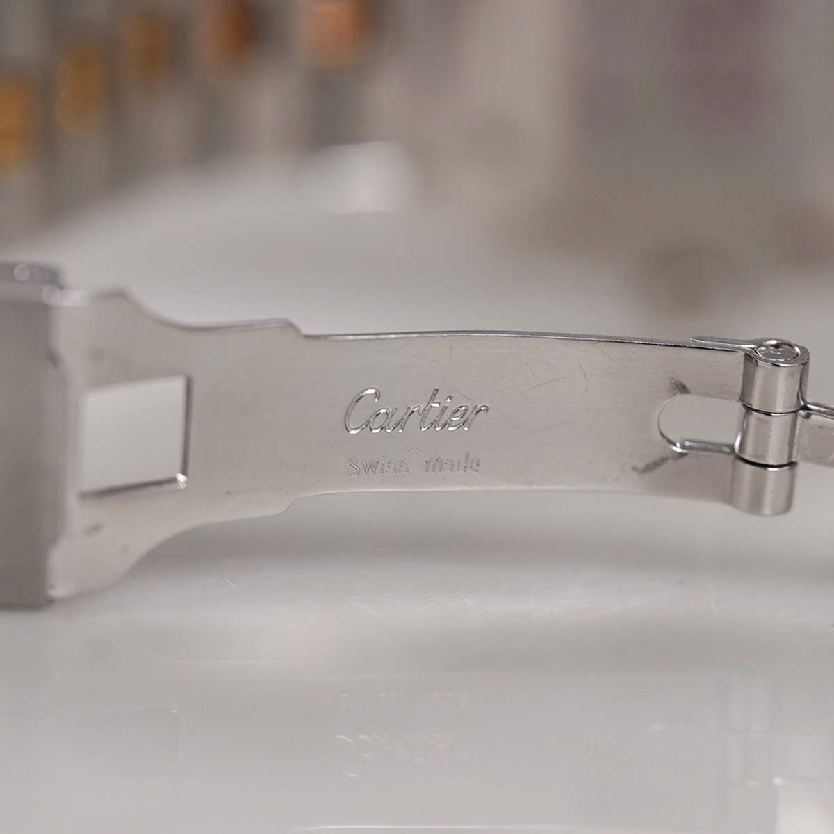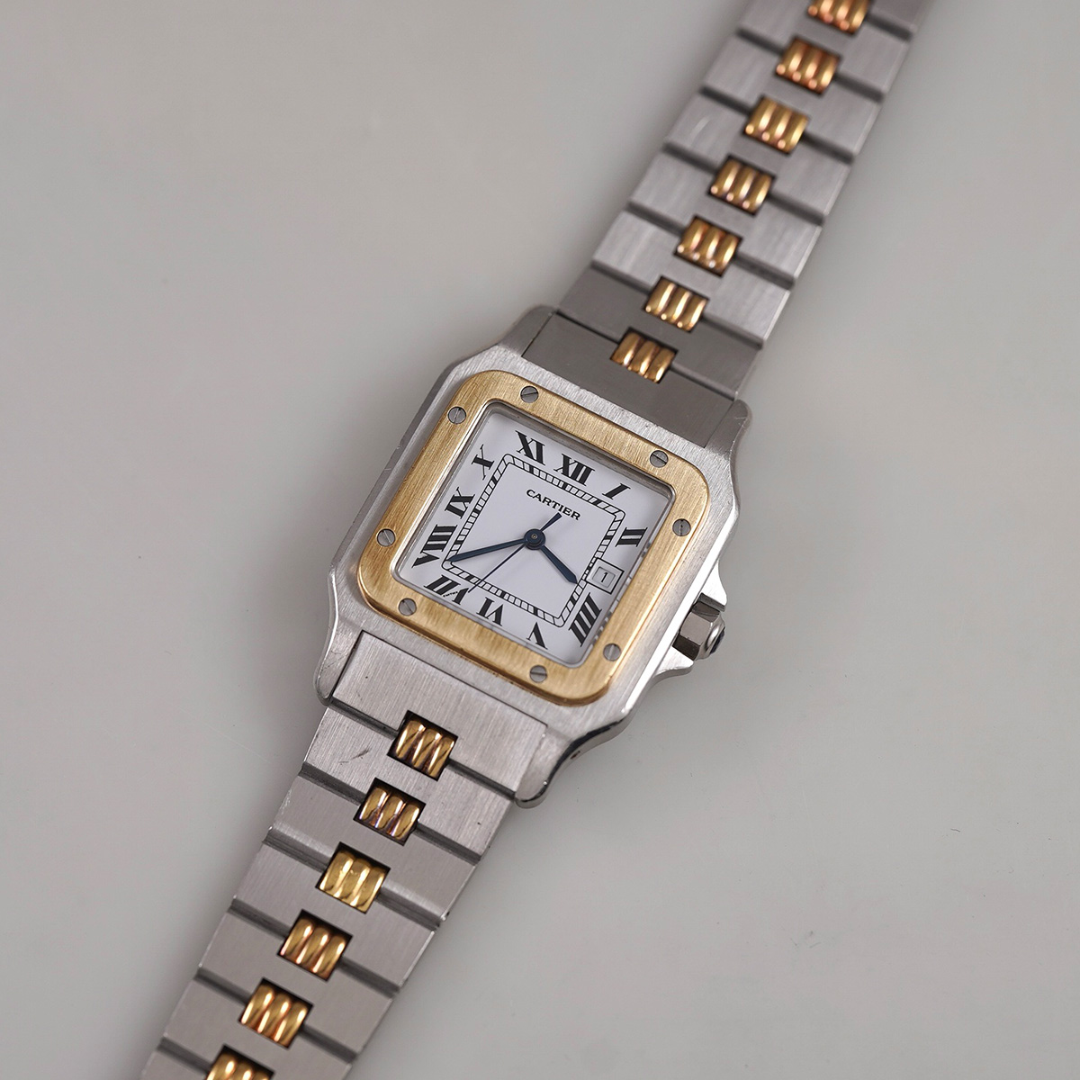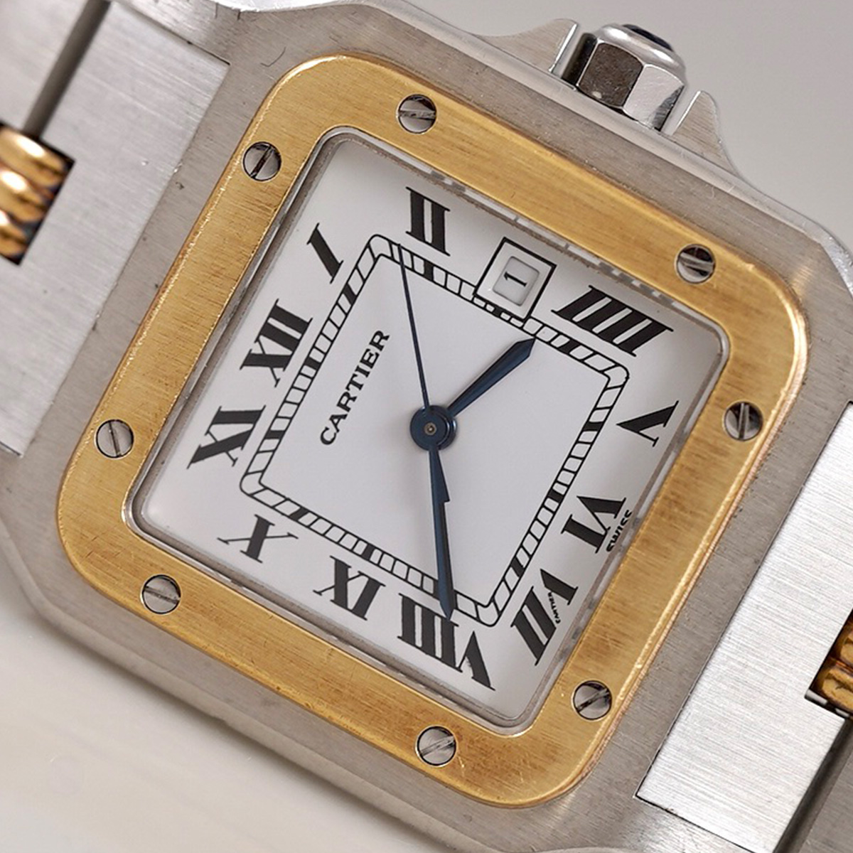 当店でも人気の高い「サントス / Santos」Ref.2961 - LMサイズ、自動巻モデルになります。カルティエ伝統のホワイトローマンインデックスにブルースチールハンド、サファイアカボションリューズ、イエローゴールドとステンレスのコンビ(ツートン)カラーの素晴らしいモデル。 時計業界の中でも、エレガントかつ、デザイン性に富んだモデルと言えるでしょう。 1970年代後期〜80年代前半に掛けて生産されていた、デイト付き自動巻きムーブメントCal.2671を搭載した30mm弱のケースは、男女問わずユニセックスで装着出来る一本。 こちらはすでに廃盤モデルとなり、さらにメタルブレスは当時からの物が装着されており、片開きバックルになります。 好みは分かれますが、コマとコマをつなぎあわせたゴドロンブレスが装着されており、こだわりの方にはおすすめ出来るポイントではないでしょうか。 腕周り〜18.5cmほどまで装着可能です。 分解掃除を済ませ日差15秒程で稼働しております。 | |